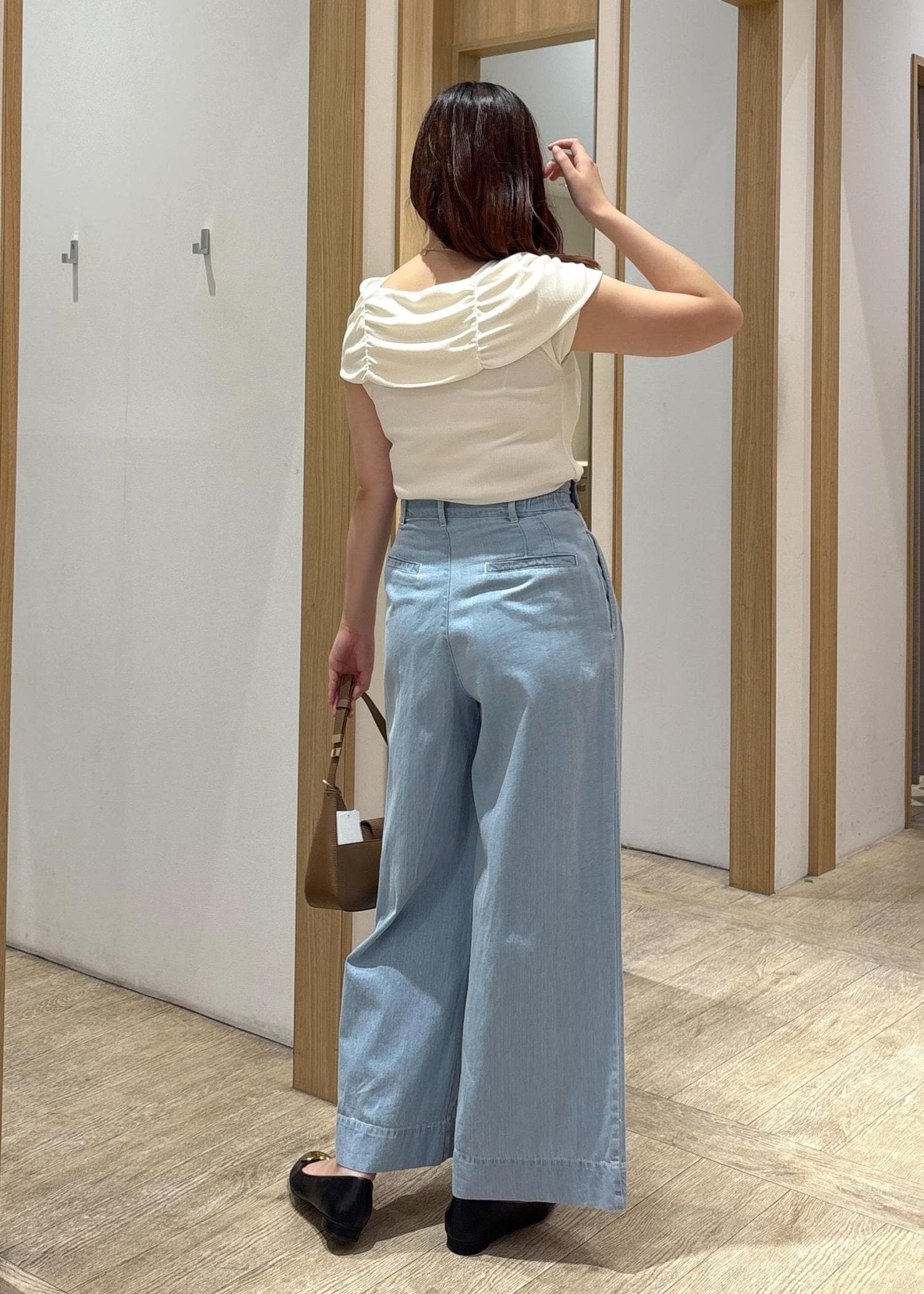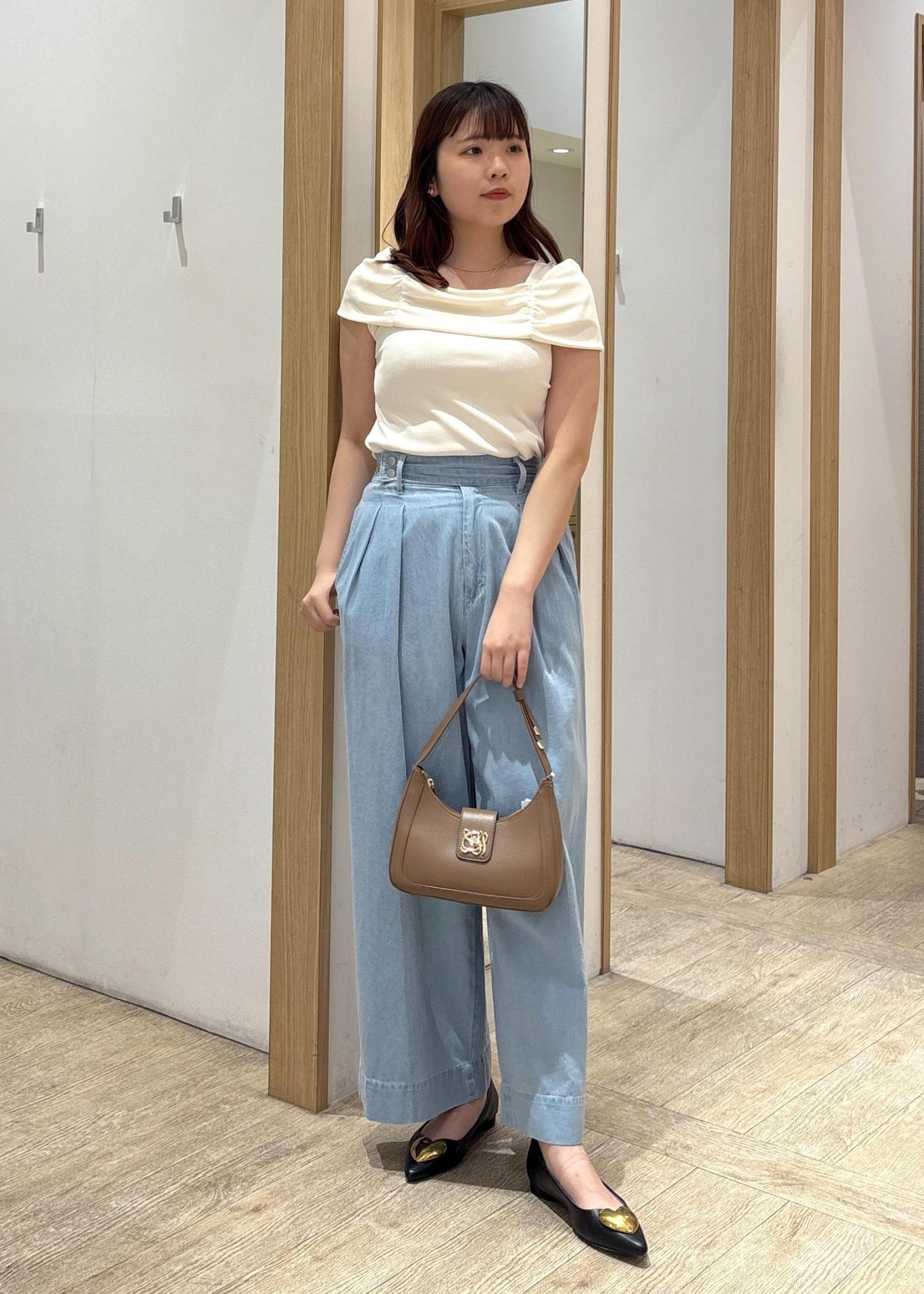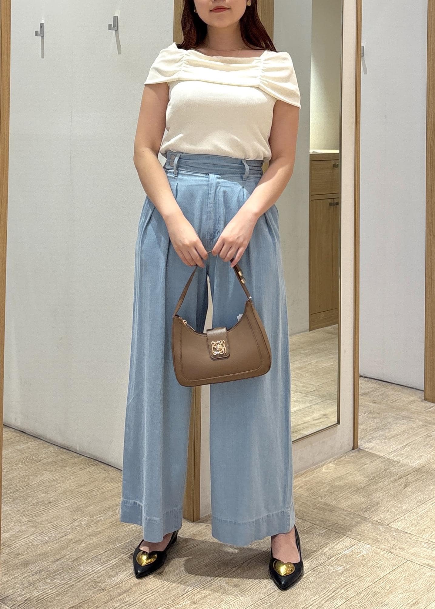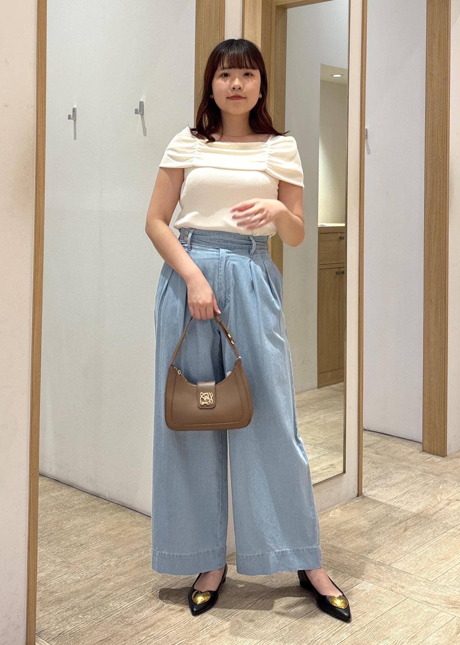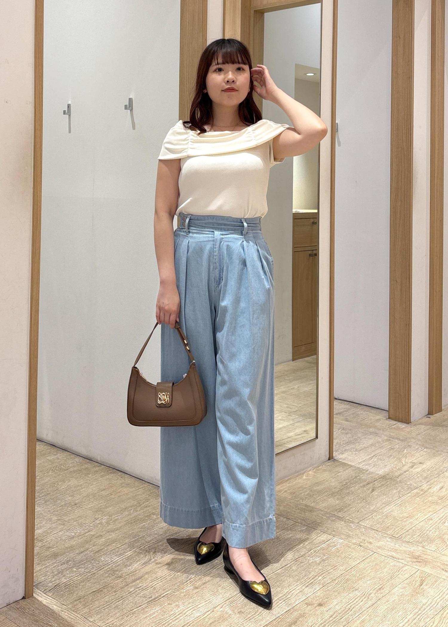 ライトブルーのワイドデニムパンツに、肩ギャザーが特徴的なクリームホワイトのトップスを合わせた、爽やかで女性らしいきれいめカジュアルコーデ。