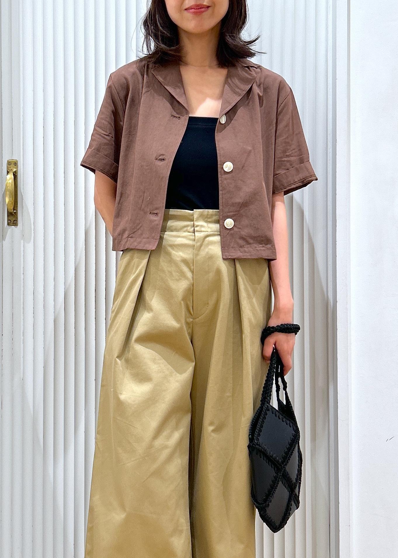 ブラウンの開襟シャツにベージュのマリンパンツを合わせた