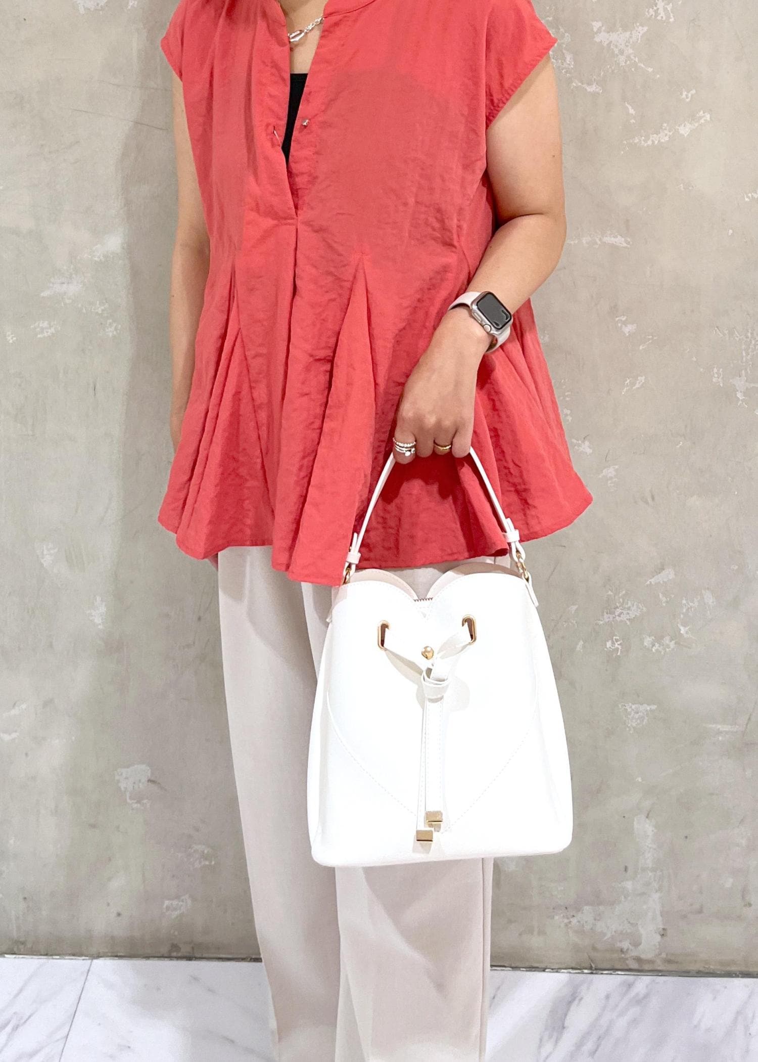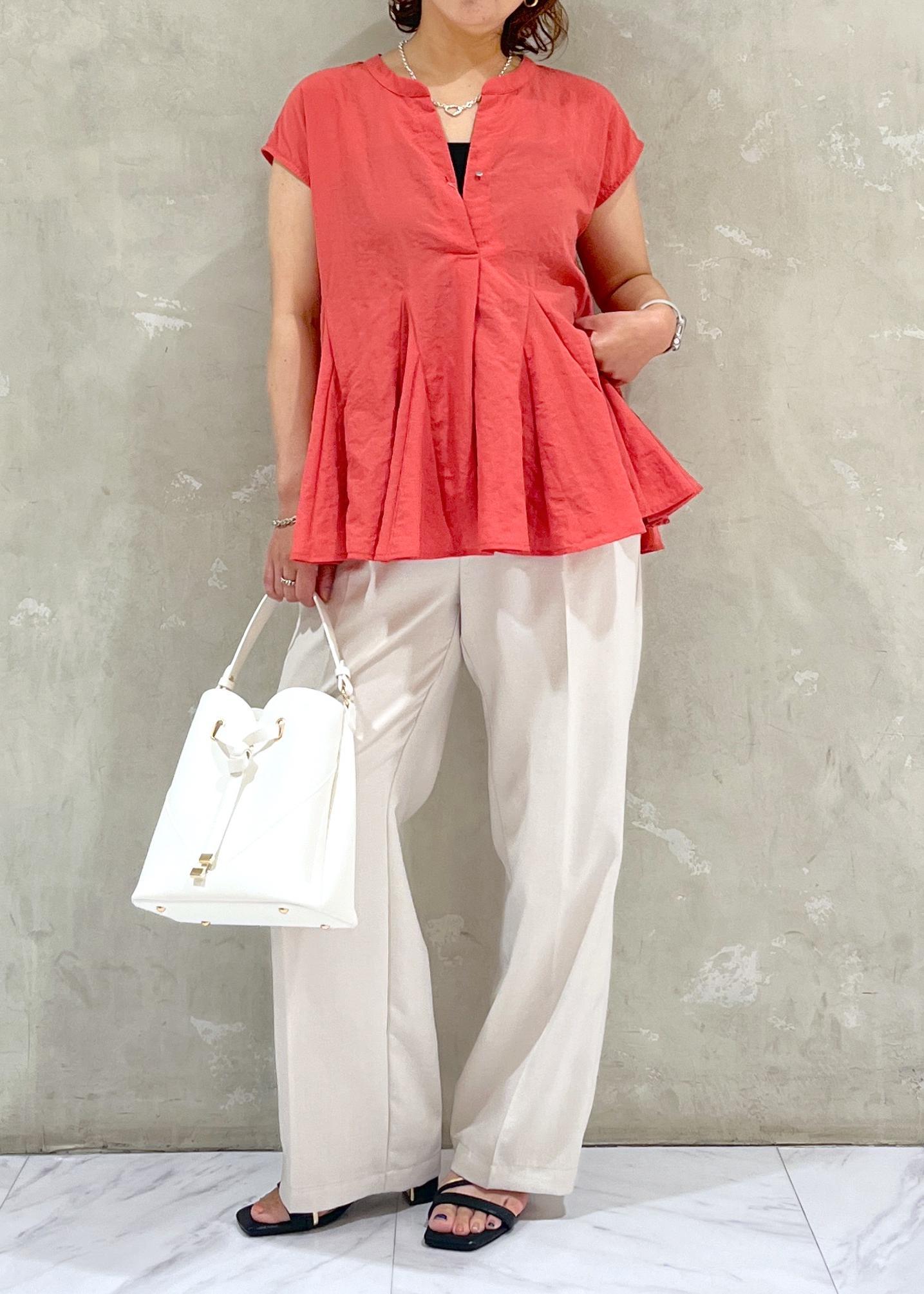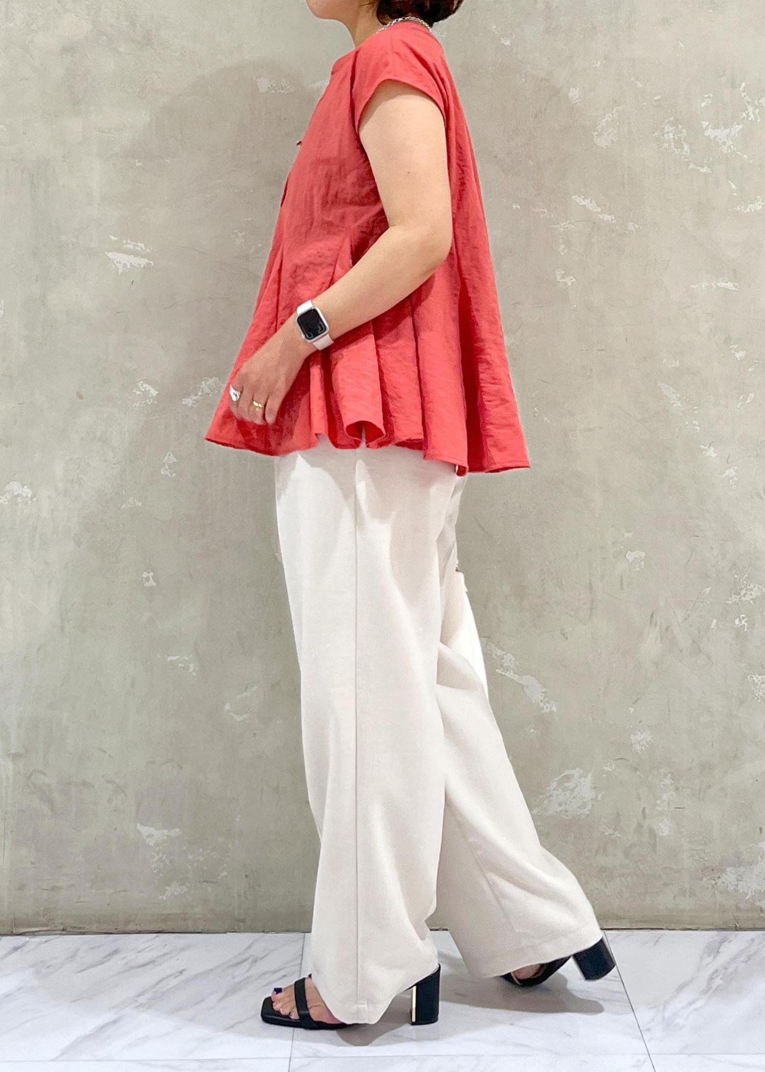 タック入りのワイドパンツで腰回りのラインもカバーして綺麗に着用できます。