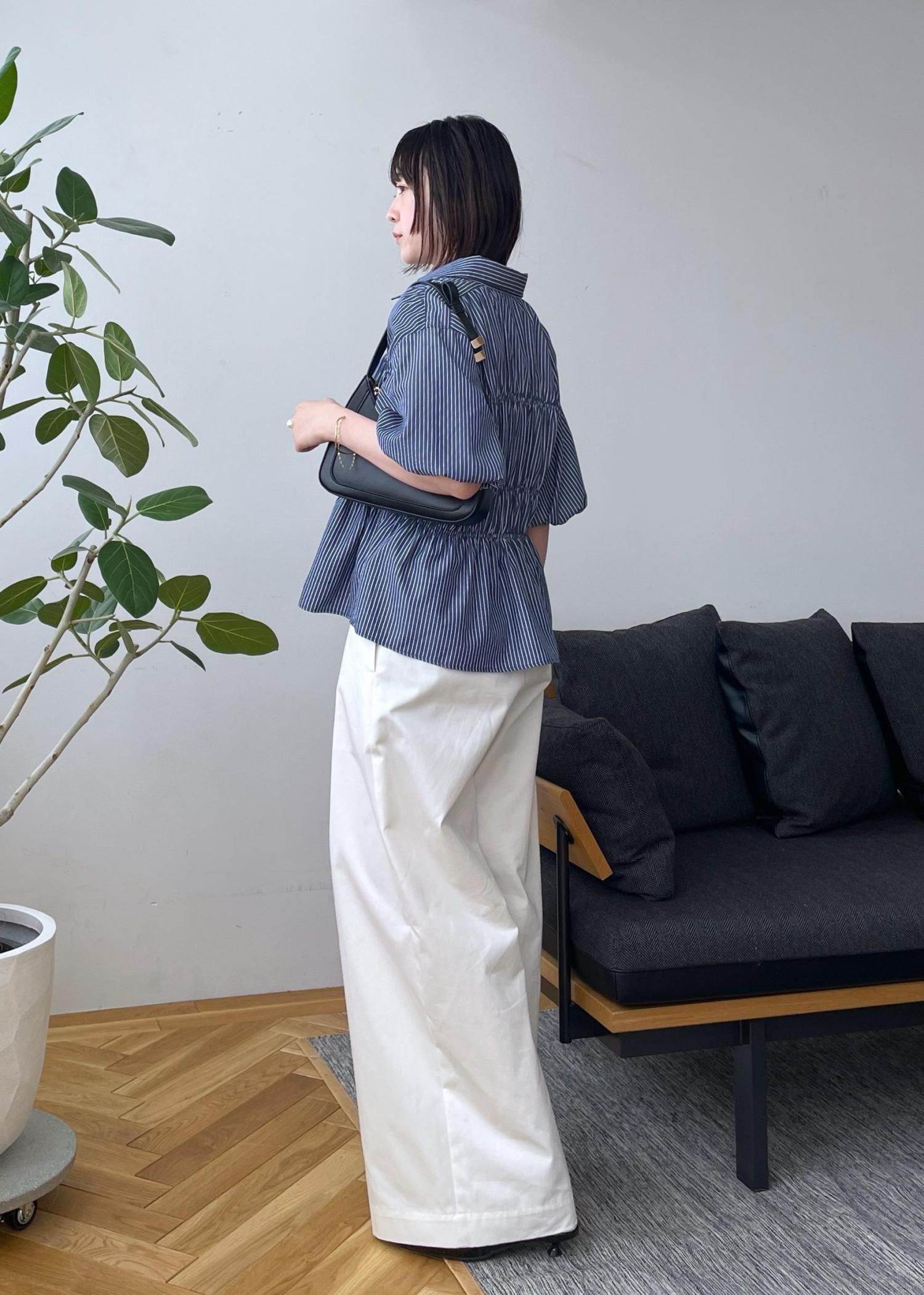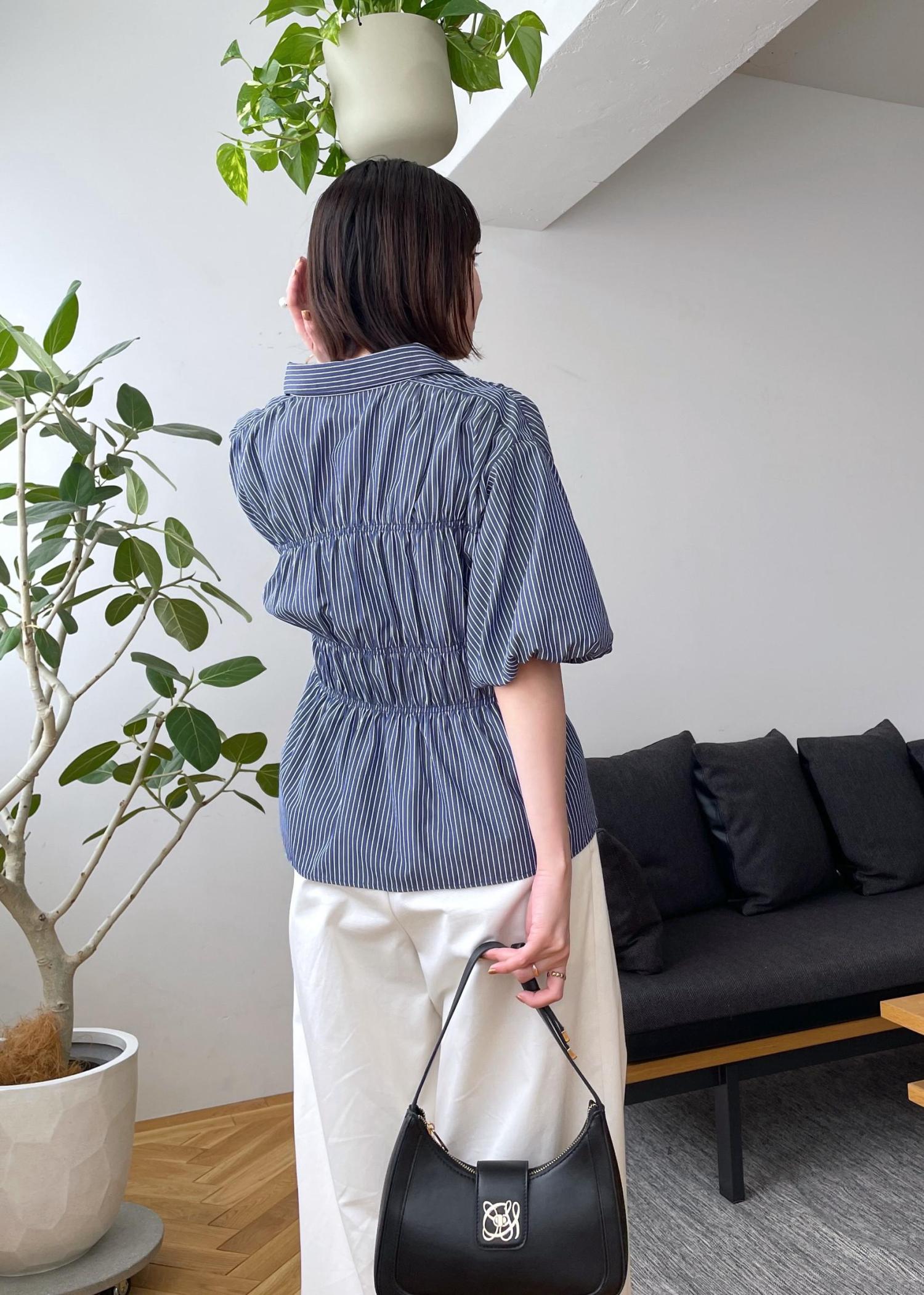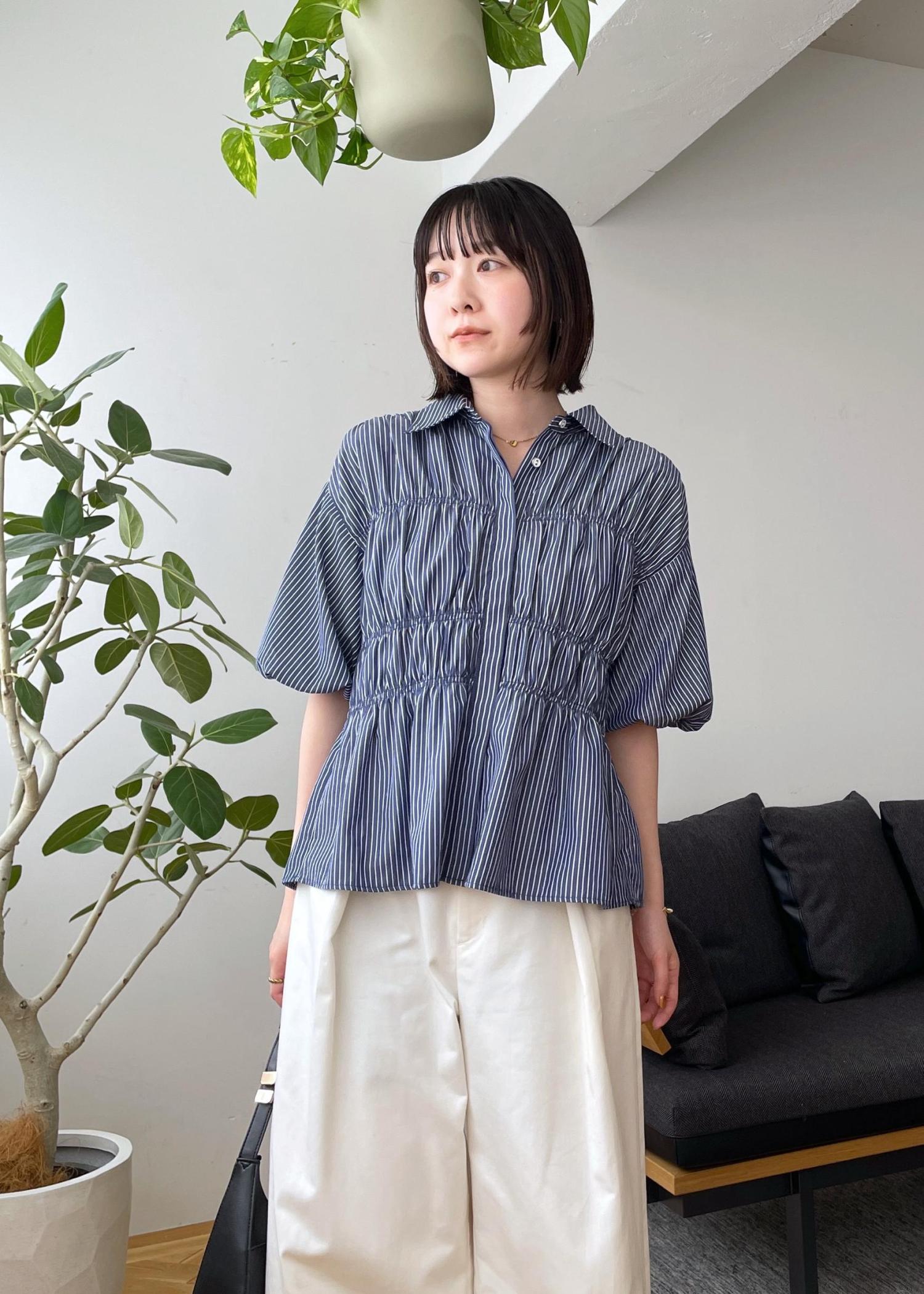 VIS【新色追加】【店頭人気】シャーリングバルーンシャツネイビー系 / F¥5,489レビュー1枚で着映えする大人気シャツ!骨ストで普段上半身の厚みが気になりますが、身頃部分のシャーリングのおかげで気になりにくくなり細見え効果もあります◎お袖のバルーンで二の腕も隠せるのでかなり愛用してるアイテムです❤︎骨ストさんは釦を1.2個開けるか羽織りで着て頂くとデコルテ見せでき、更に華奢見えします!着用の新色は大人な雰囲気のネイビー❤︎柄物ですが落ち着いたカラーでコーデに取り入れやすいです◎