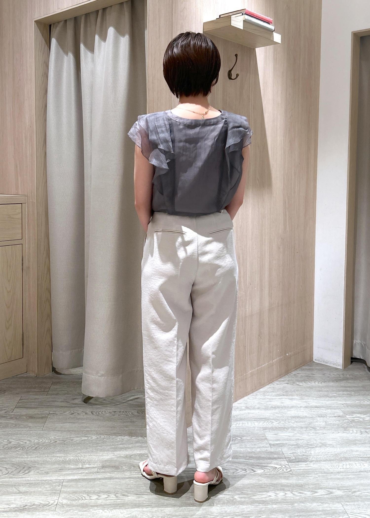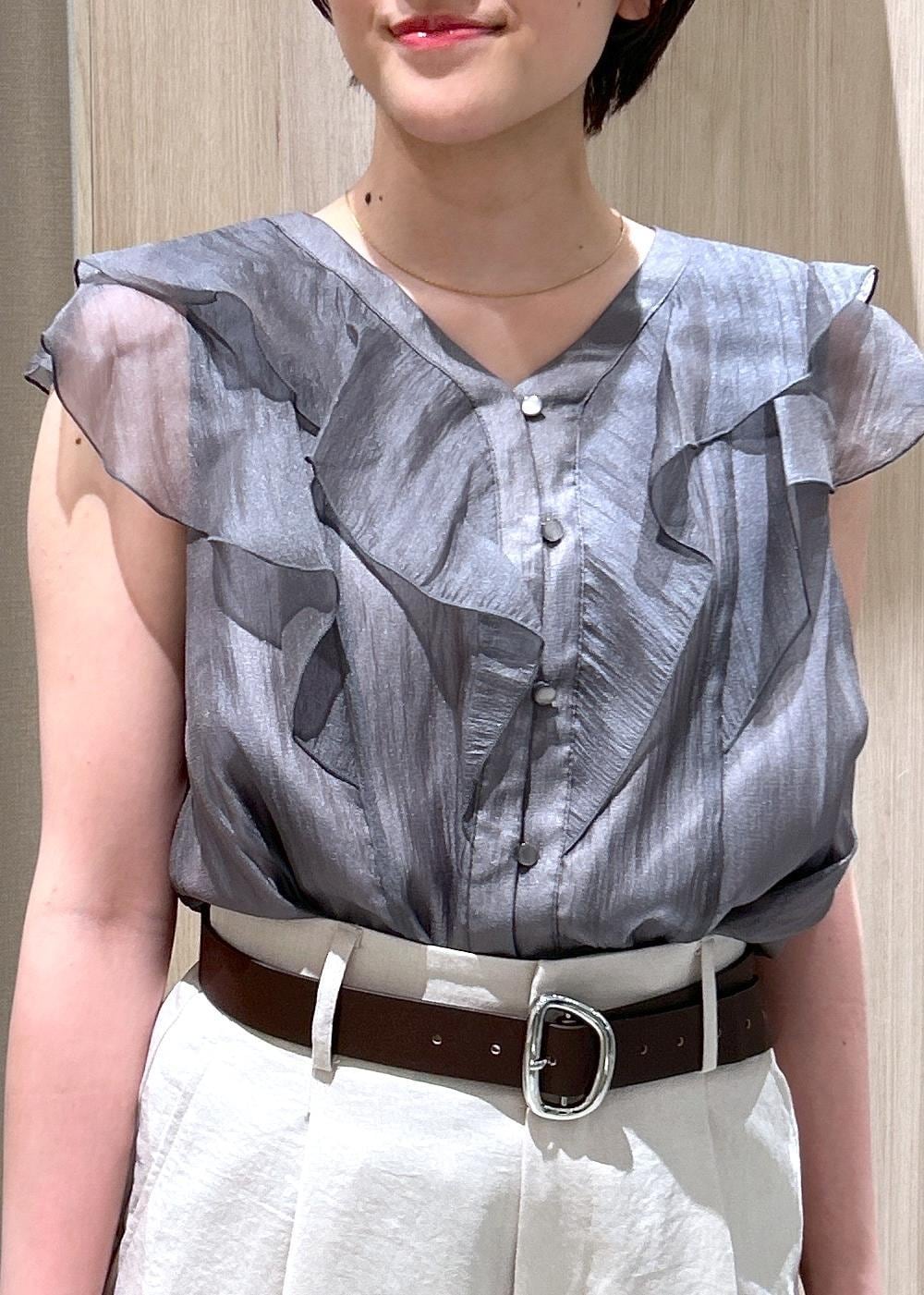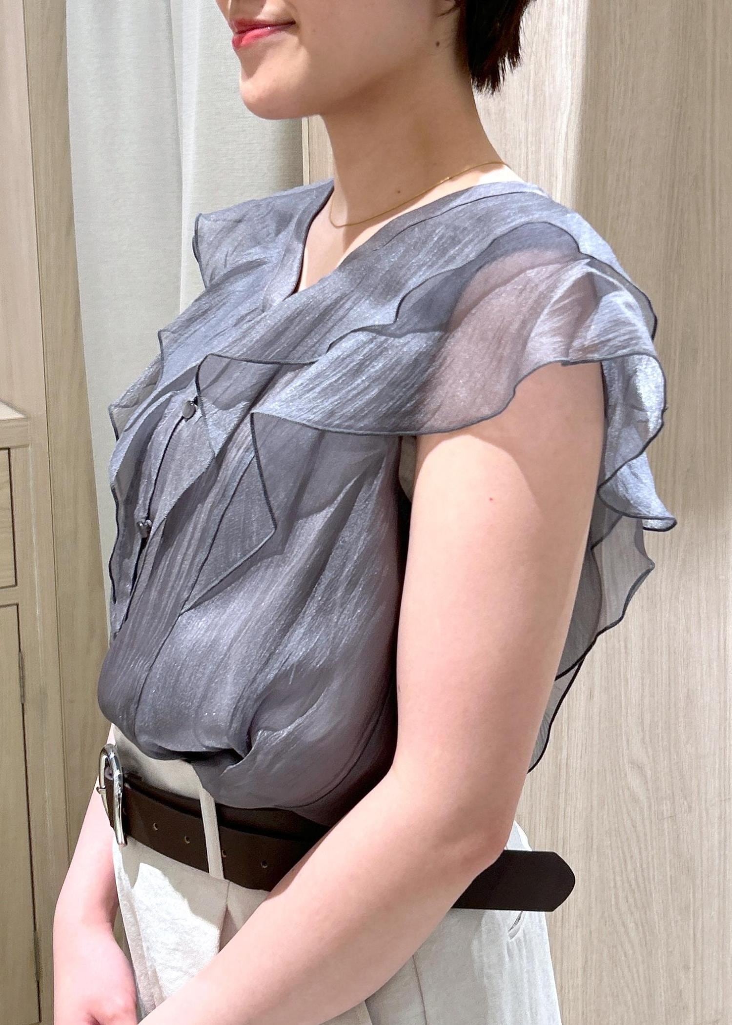 アウトレットVISシアーラッフルフリルブラウス/通勤対応チャコール / F¥3,842レビュー大きめのフリルが二の腕に少しかかるデザインです。