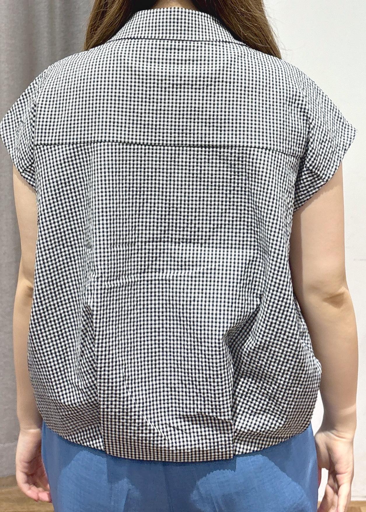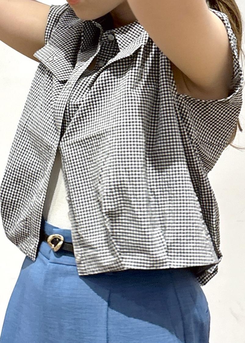 前を開いて羽織にもできますが、ウエスト部分が膨らんでいるため、前を閉めて少しボタンを開けてもオシャレです◎ -