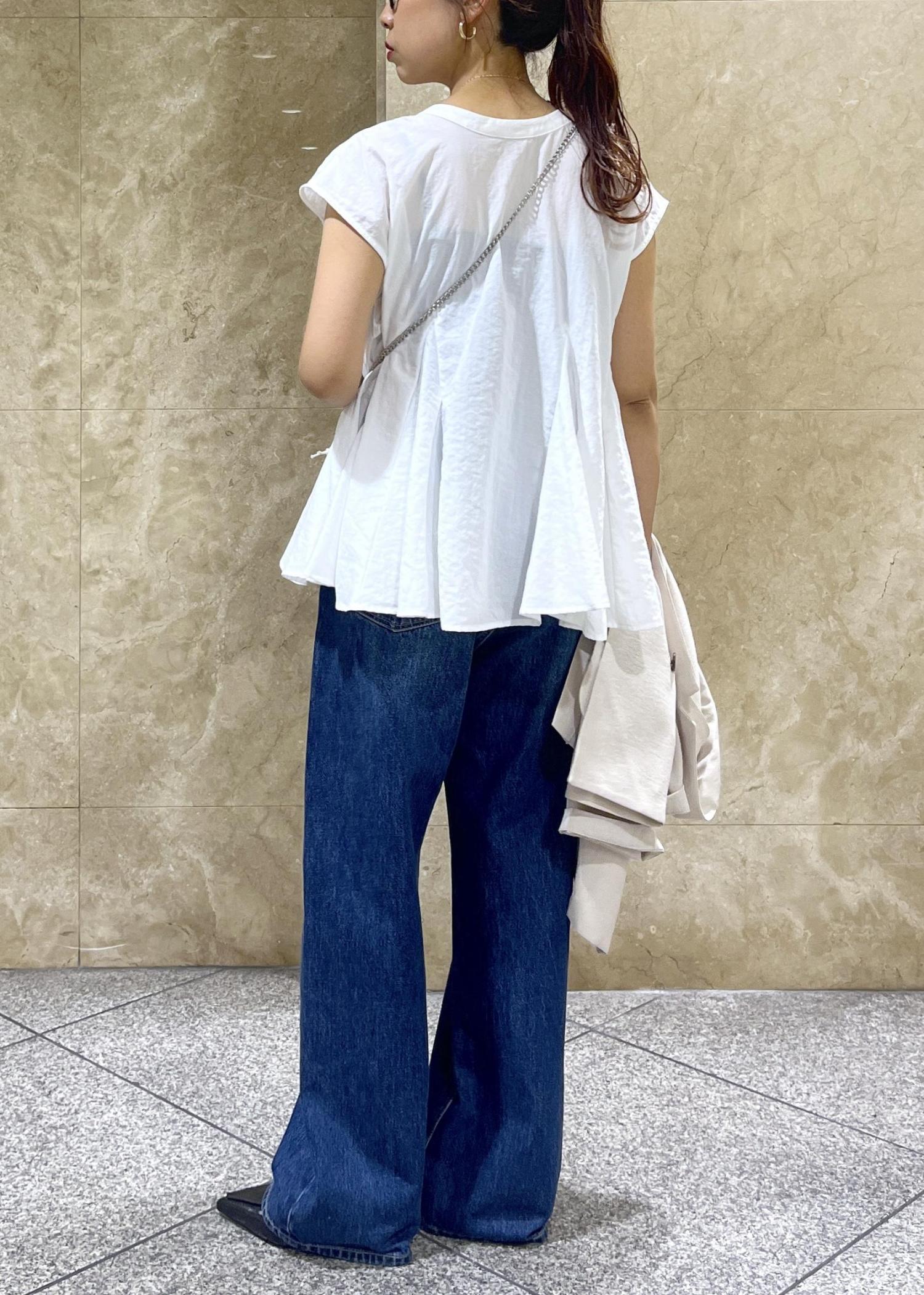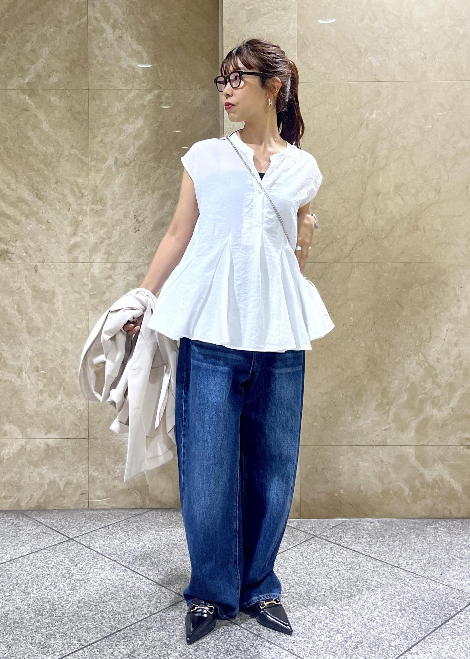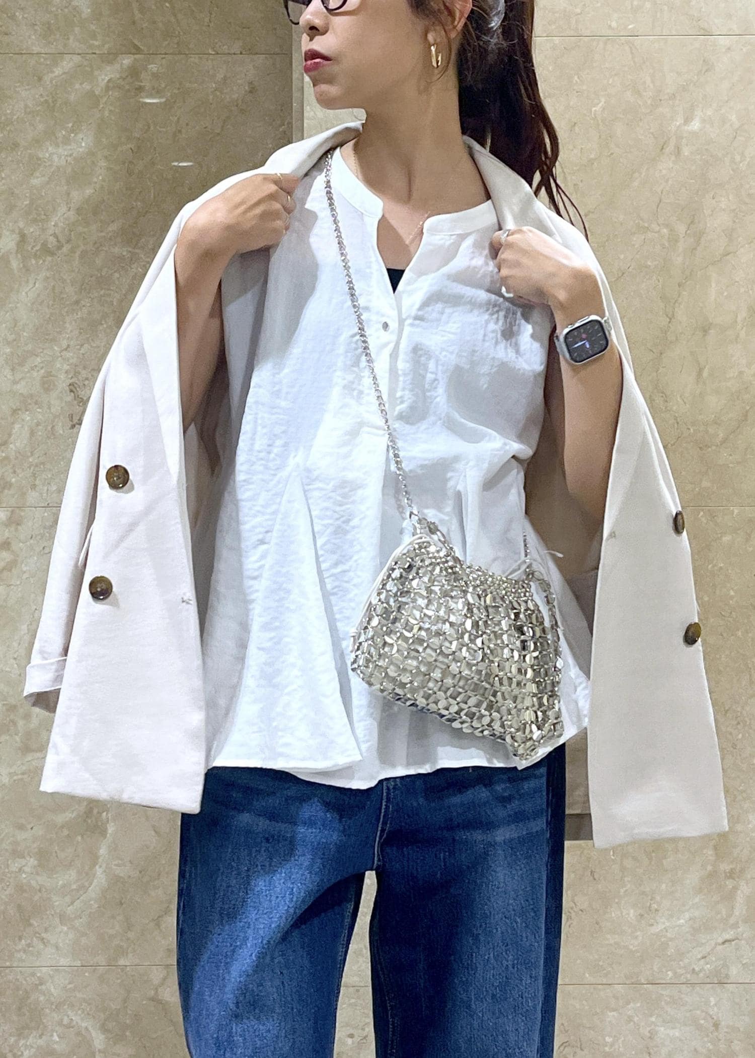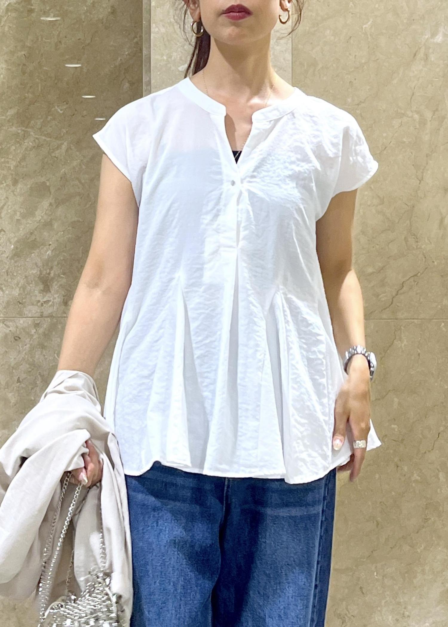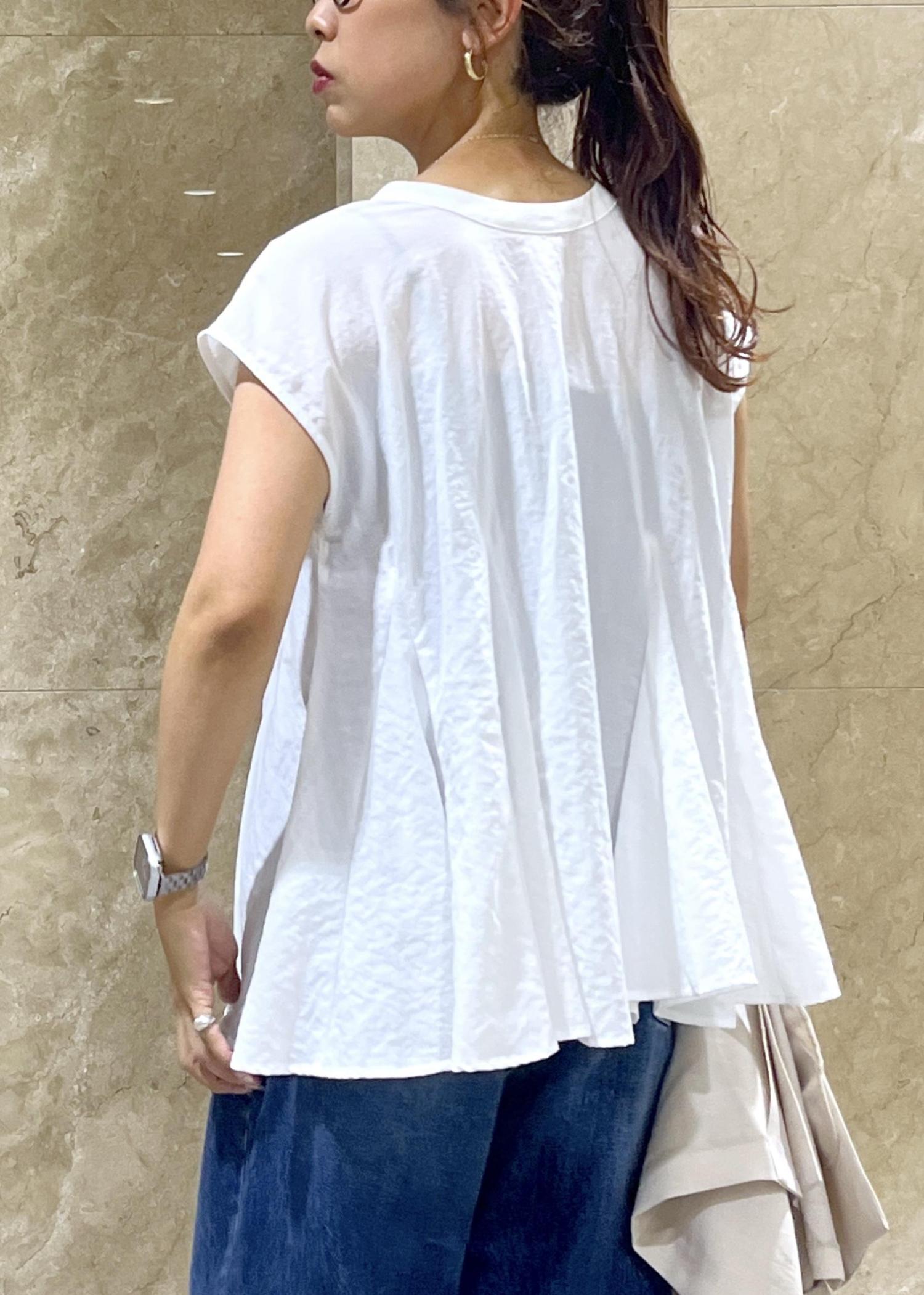 脇部分はほどよく開きがあるため、インナーは必須。着用のホワイトはほんのり透け感があるため、インナーの工夫は必要ですが、その分見た目にも涼やかで、真夏にぴったり!