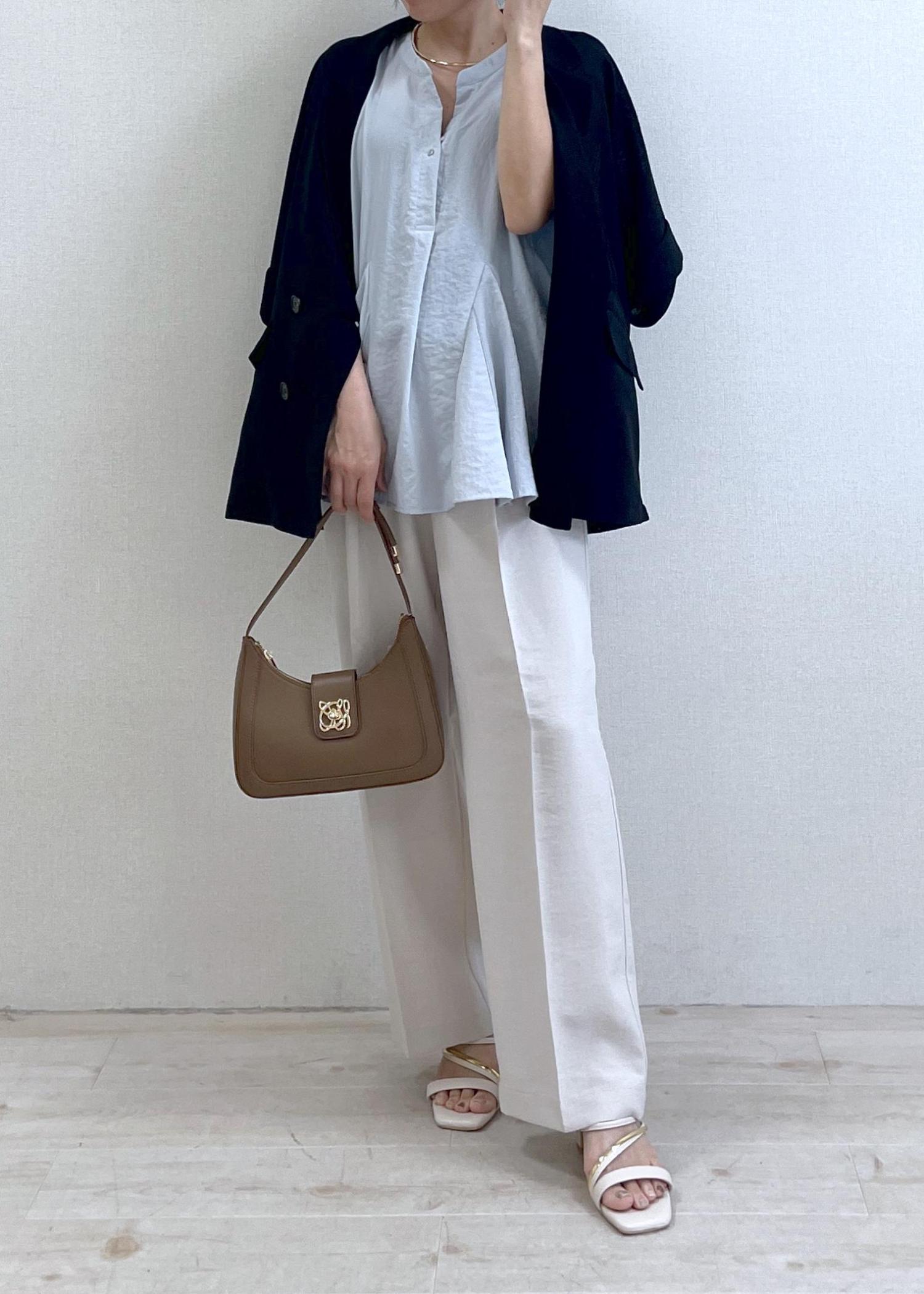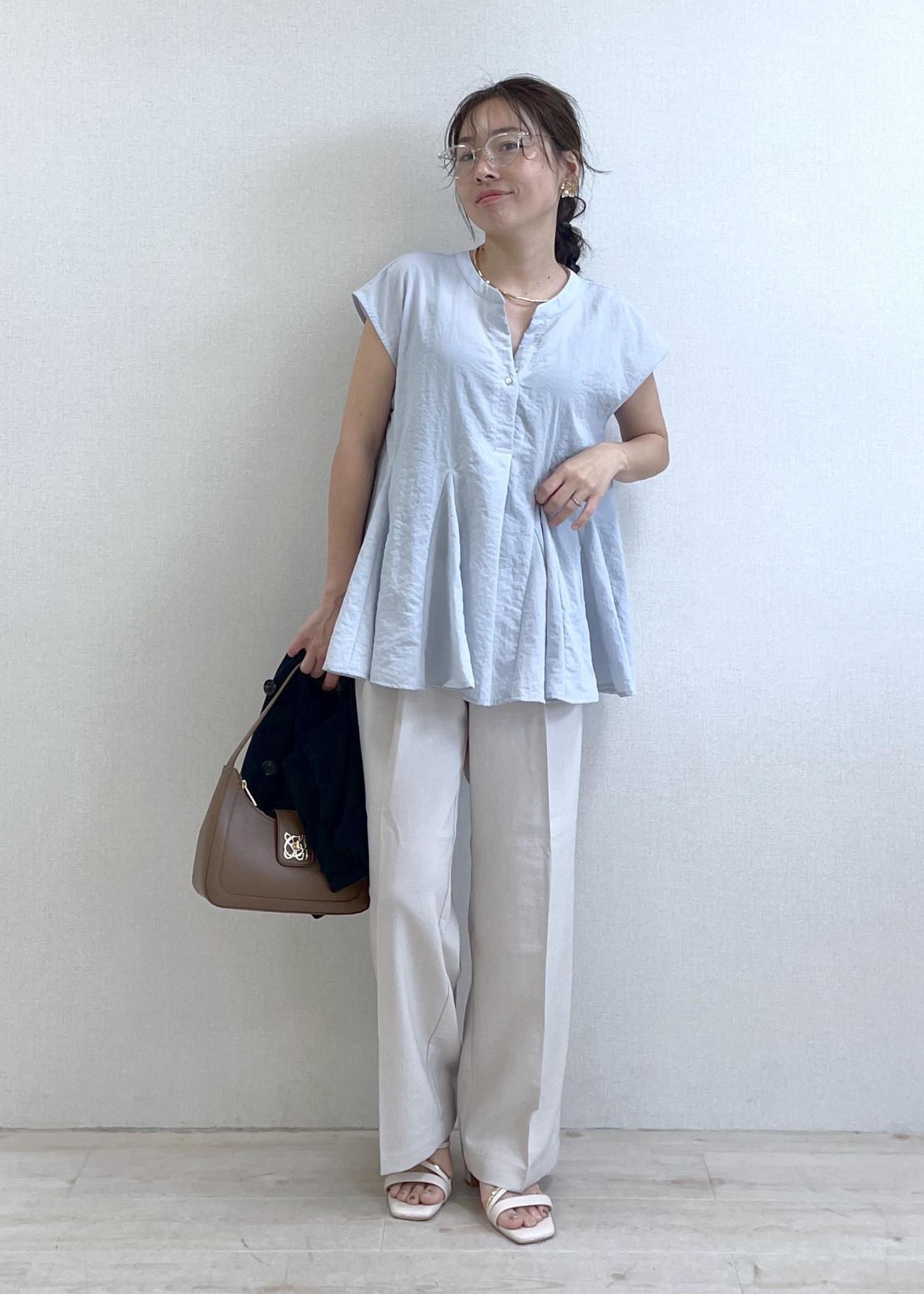 さらっと一枚で華やぐペプラムブラウスに、白のストレートパンツを合わせて。