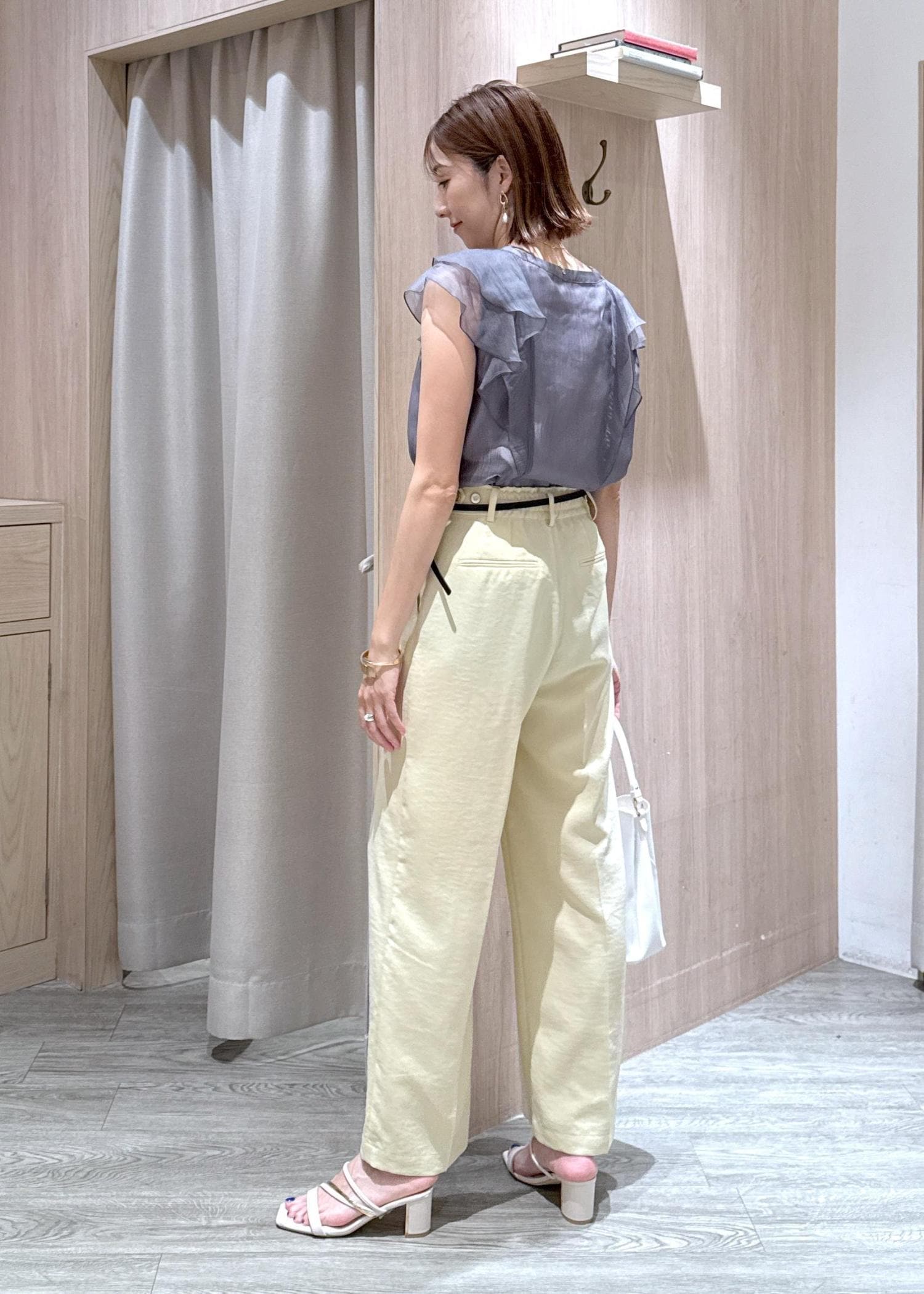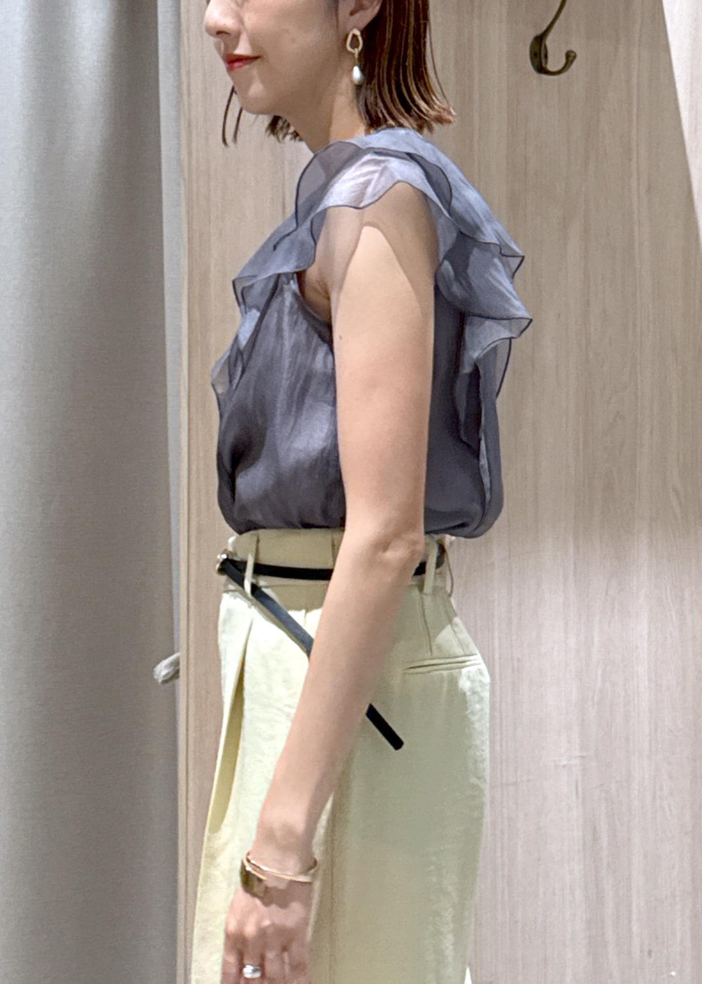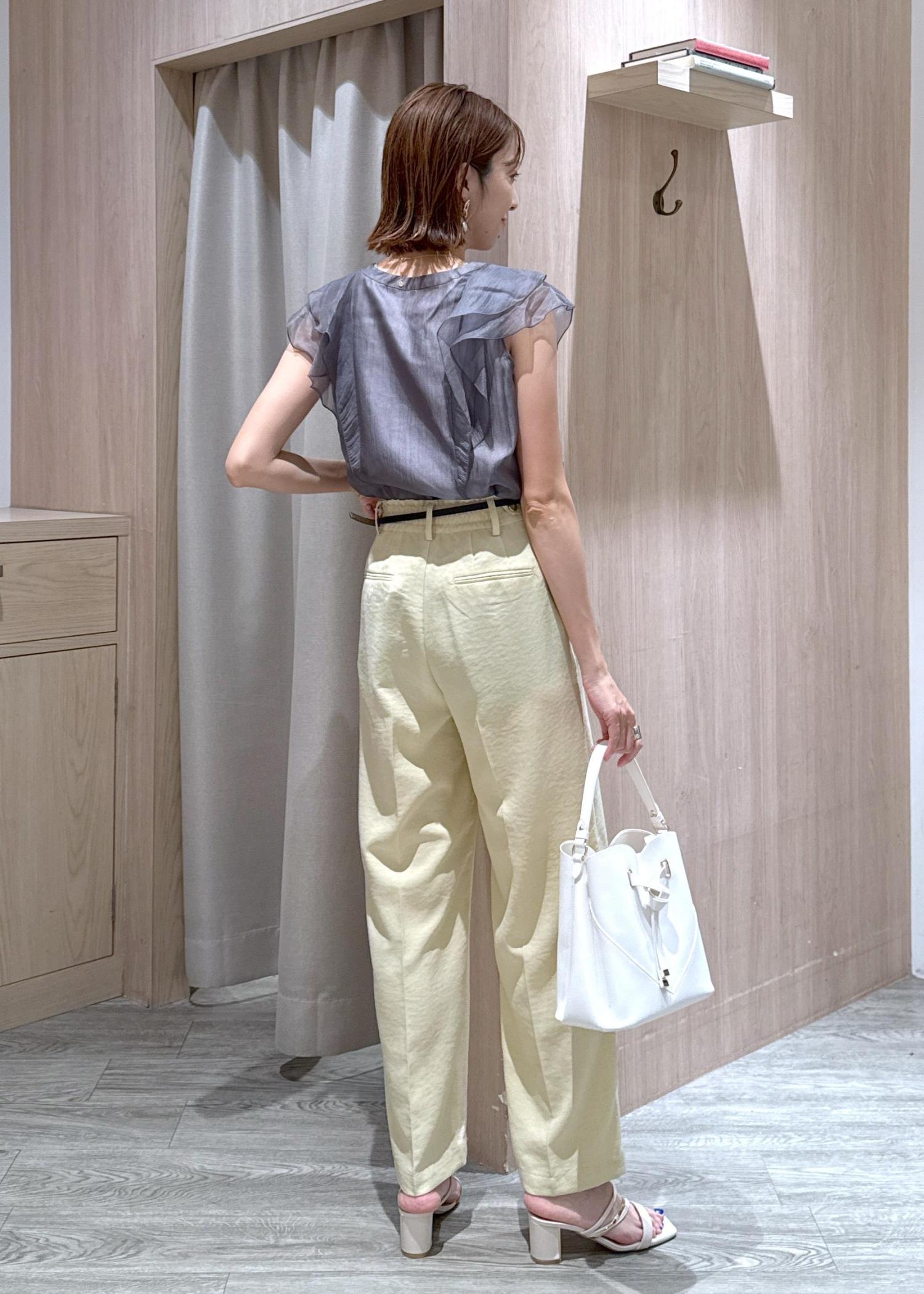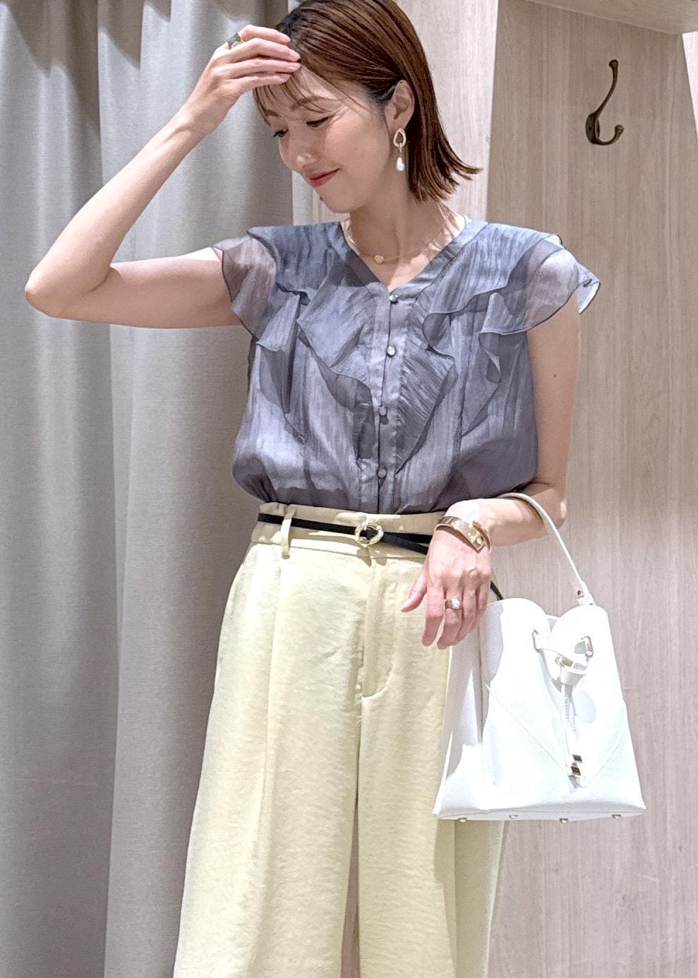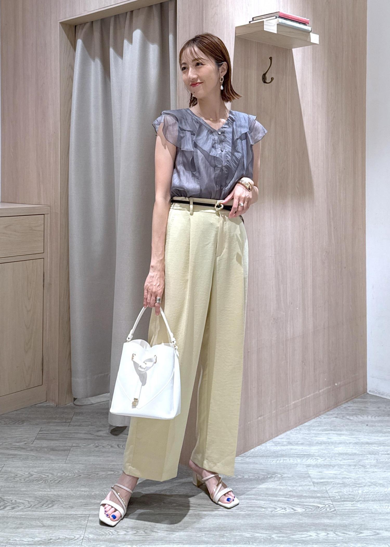 シアー感が可愛いグレーのブラウスに夏らしいイエローパンツを合わせたキレイめカジュアルコーデです!