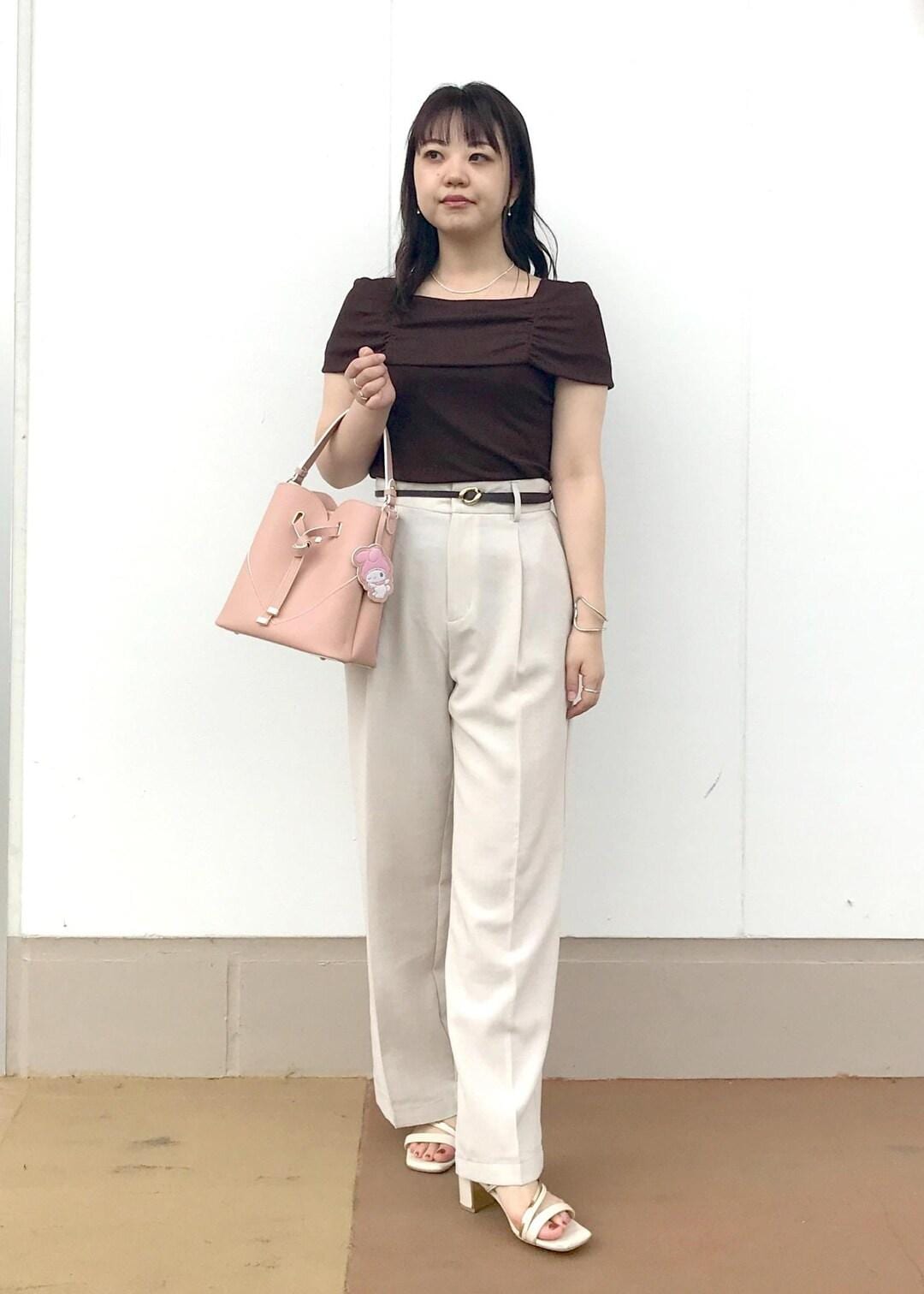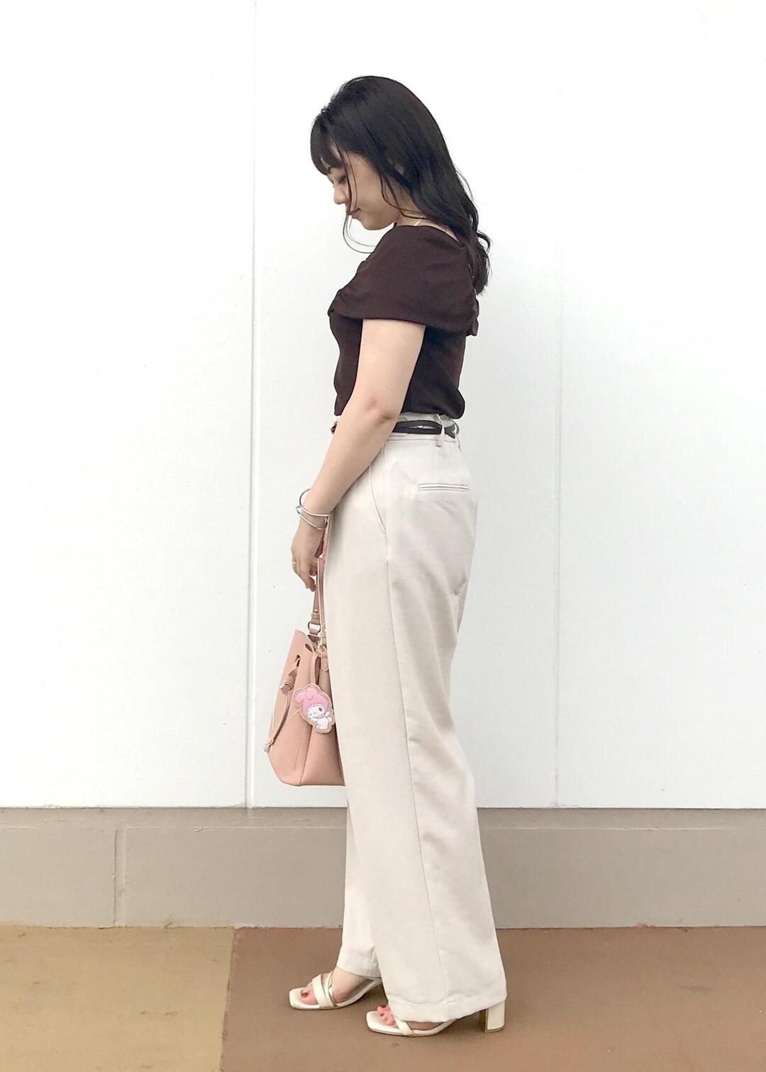 トップスのブラウン×マイメロのピンクでさり気なくお菓子のような可愛いカラーコーデにしました。