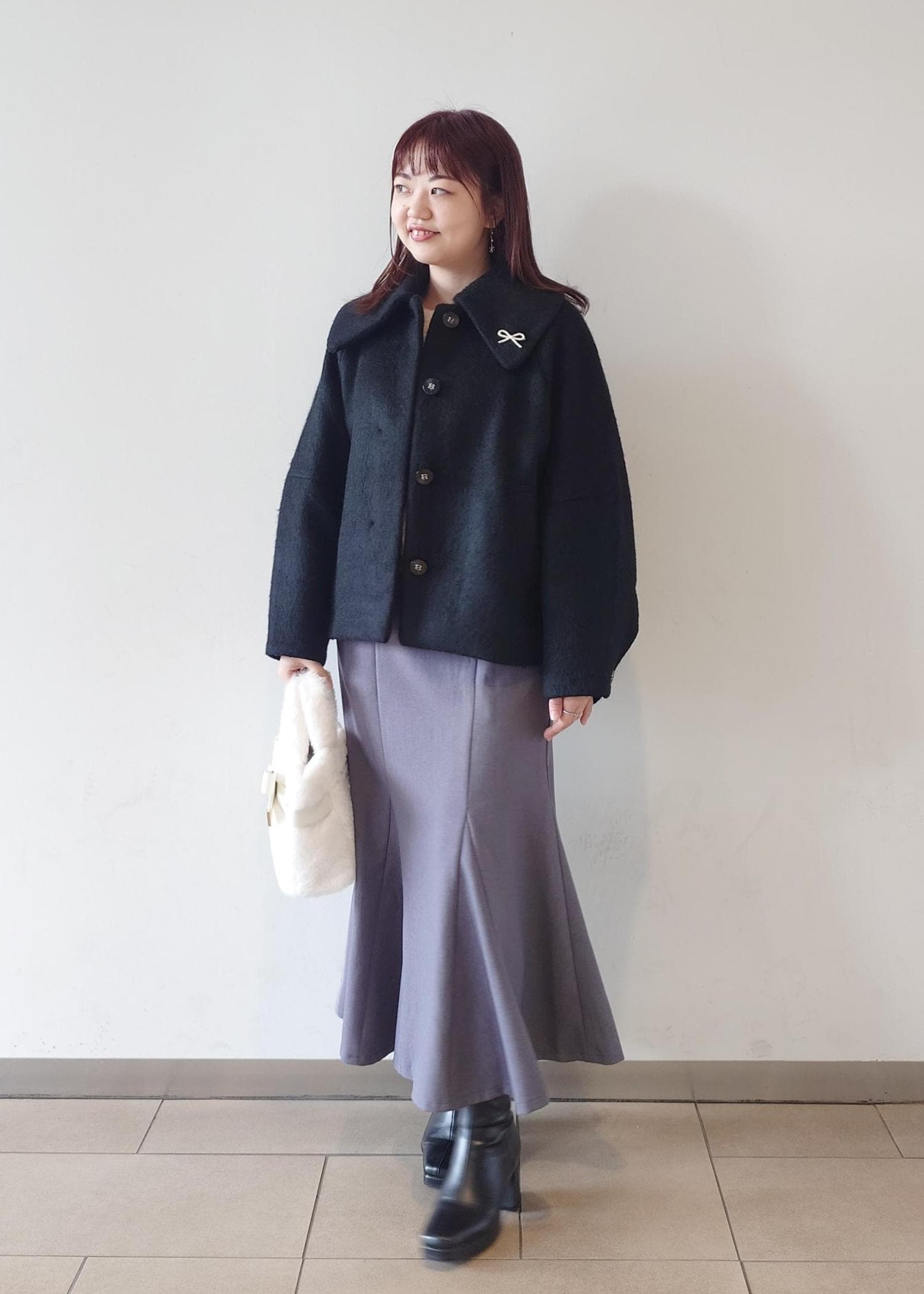 可愛らしい雰囲気のオフショルライクニットは、パンツと合わせて甘すぎないスタイルに。