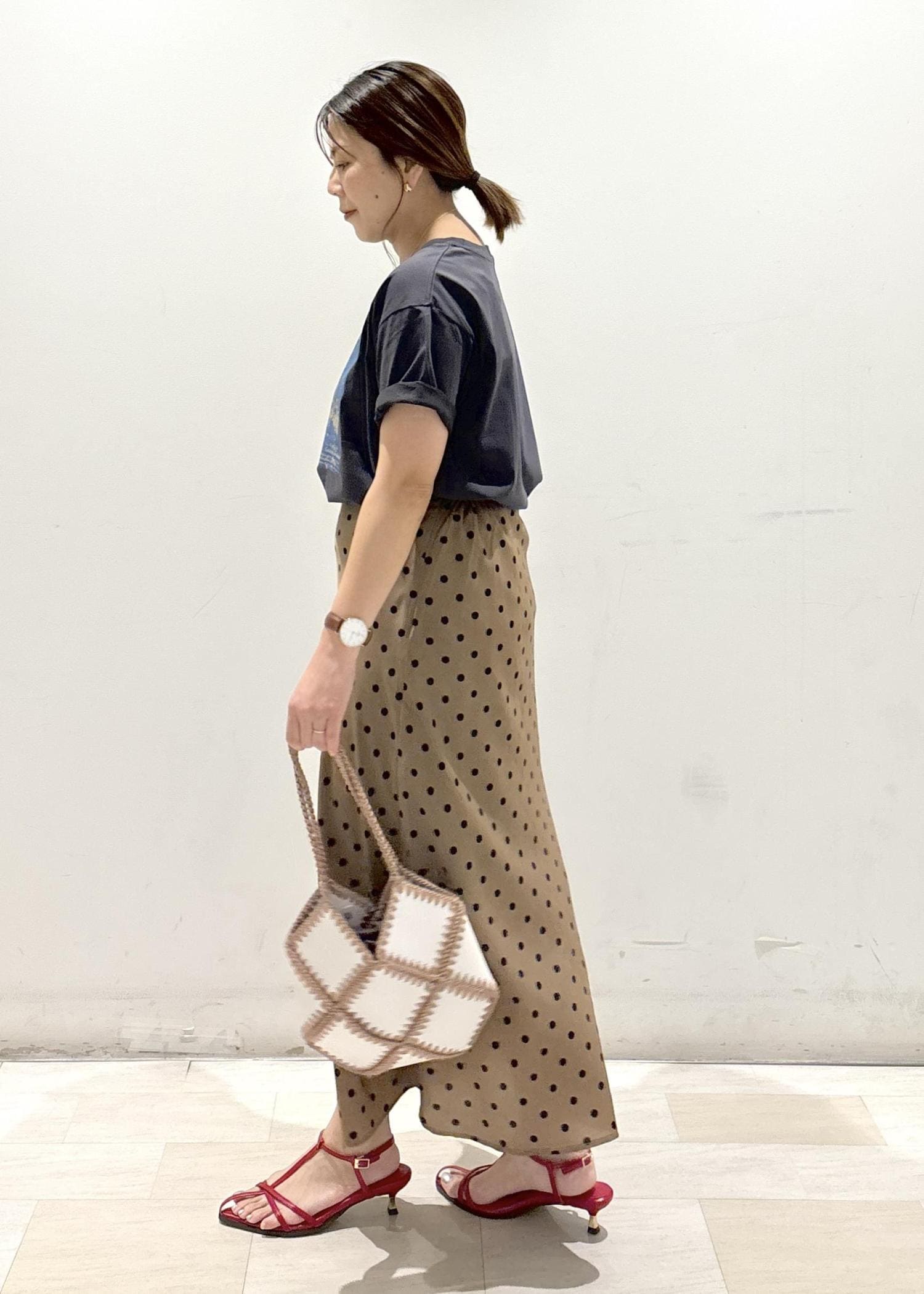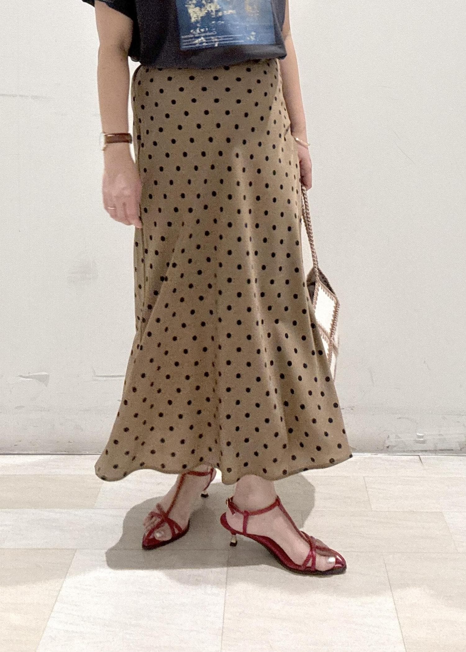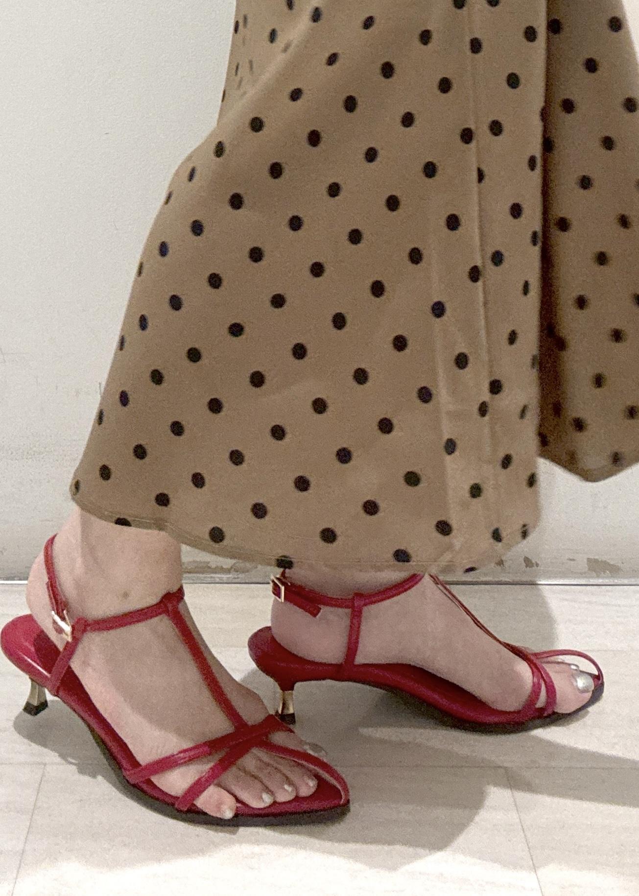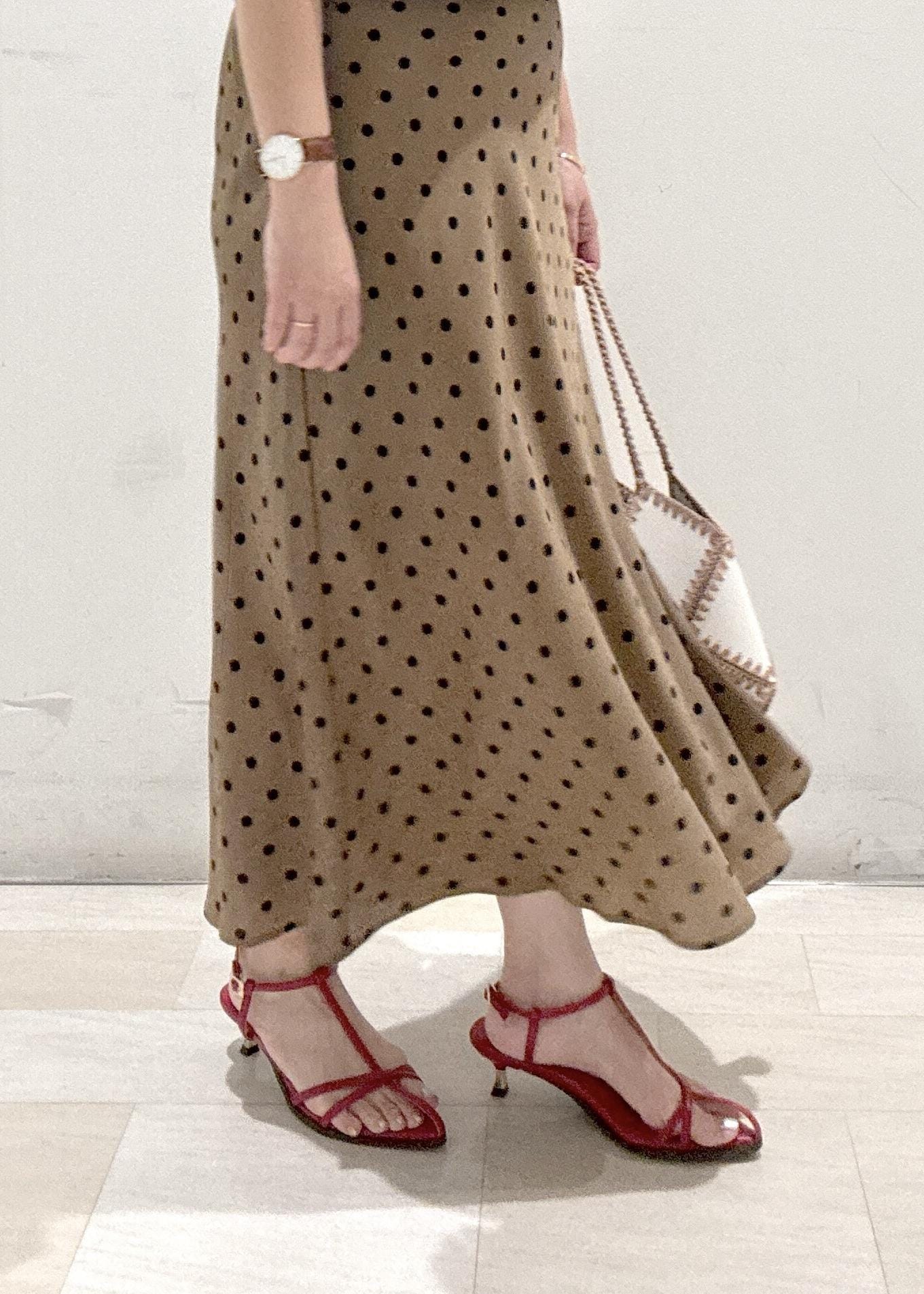 クラシカルなドット柄スカートと華奢紐サンダルを合わせレディ感を出しました。