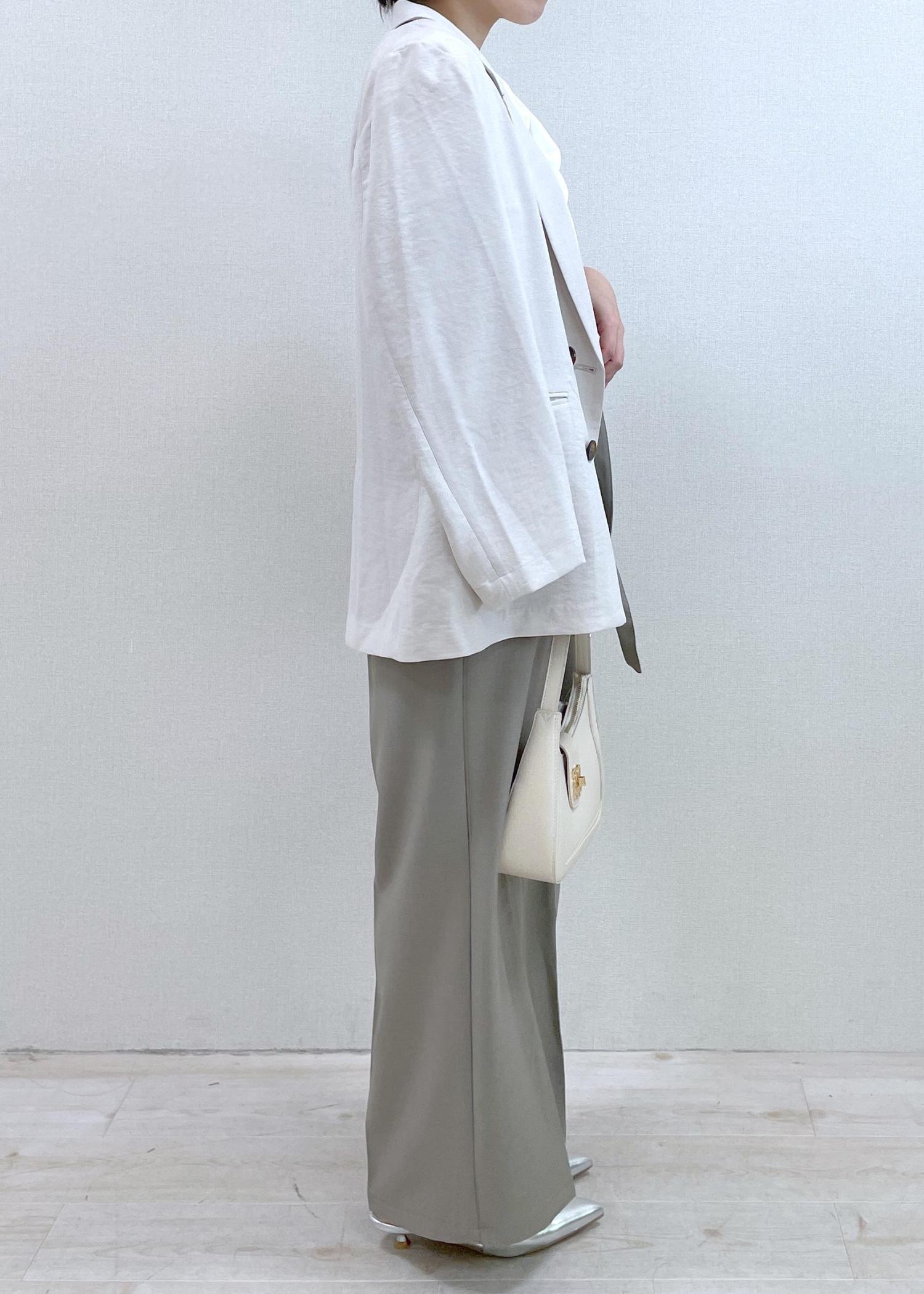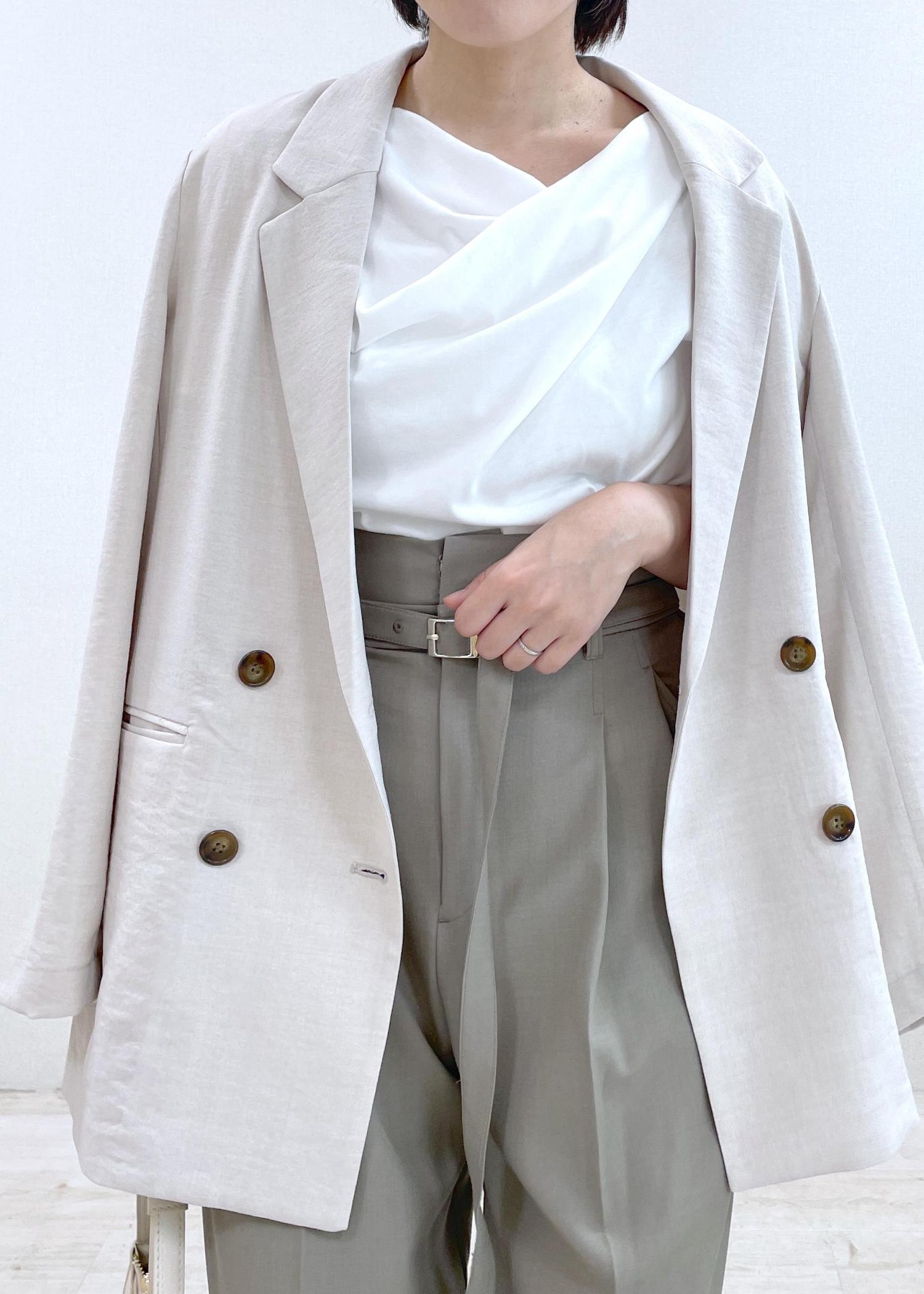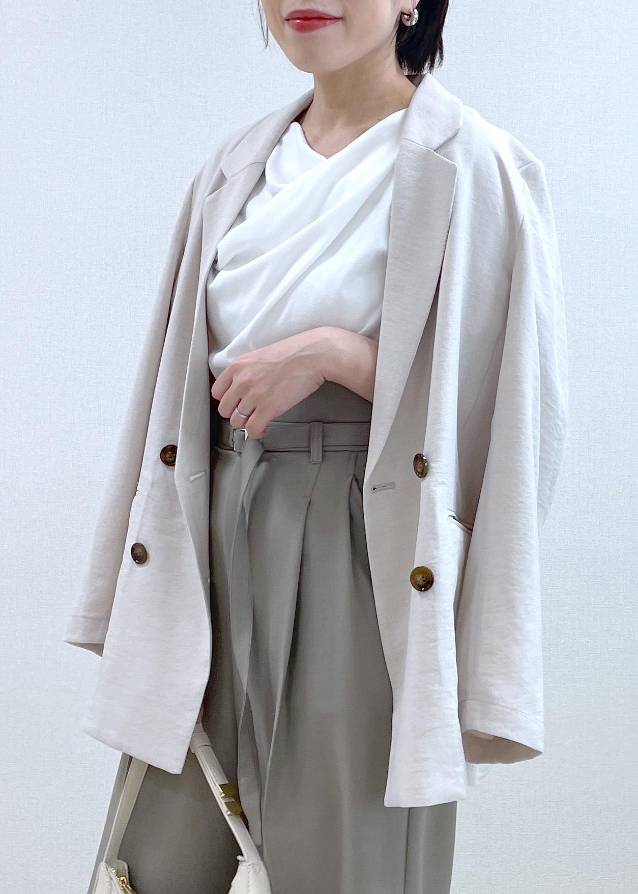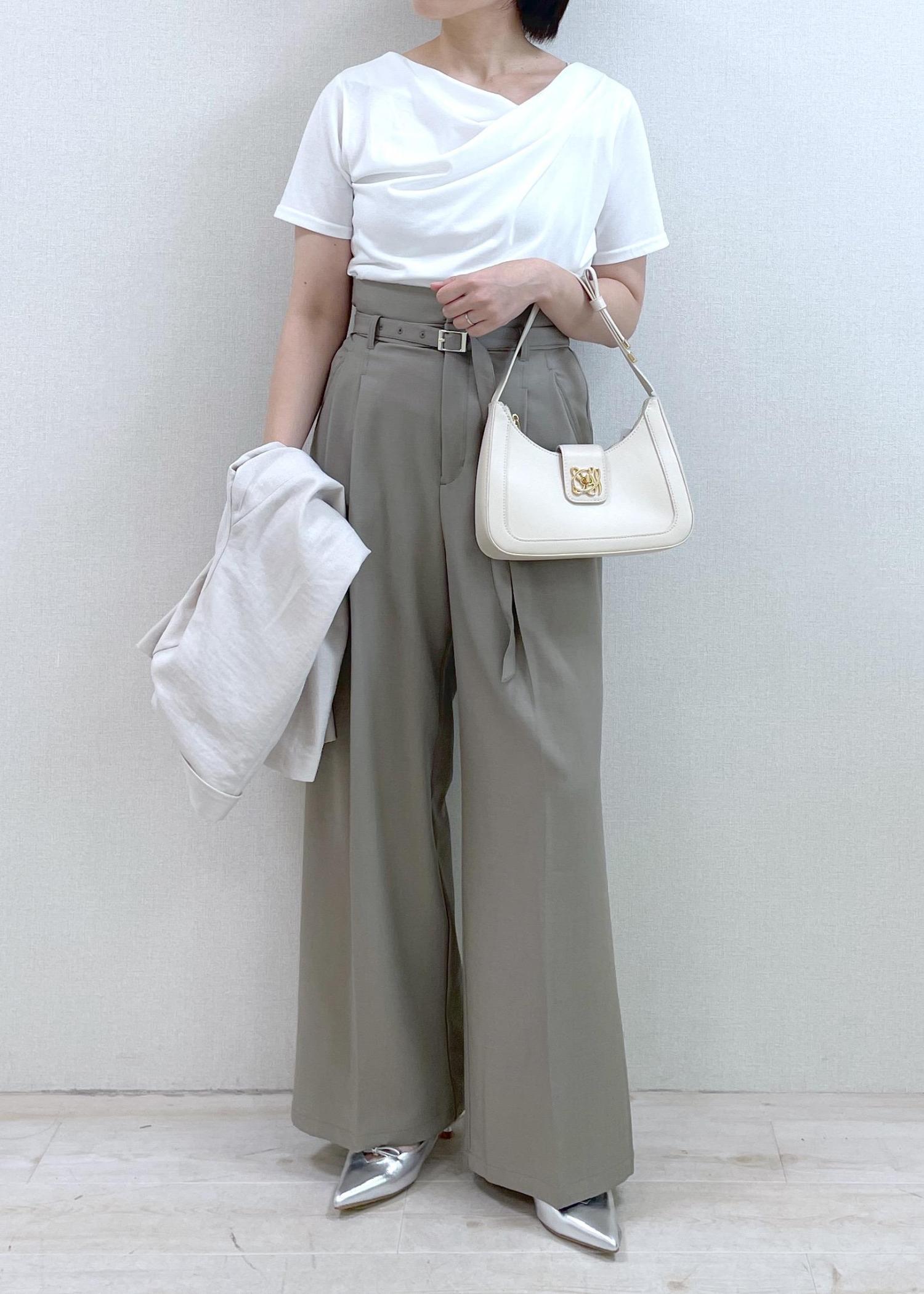 人気のドレーププルオーバーにきれいめパンツを合わせ、シンプルながら清潔感と女性らしさの詰まったスタイリングにしました。