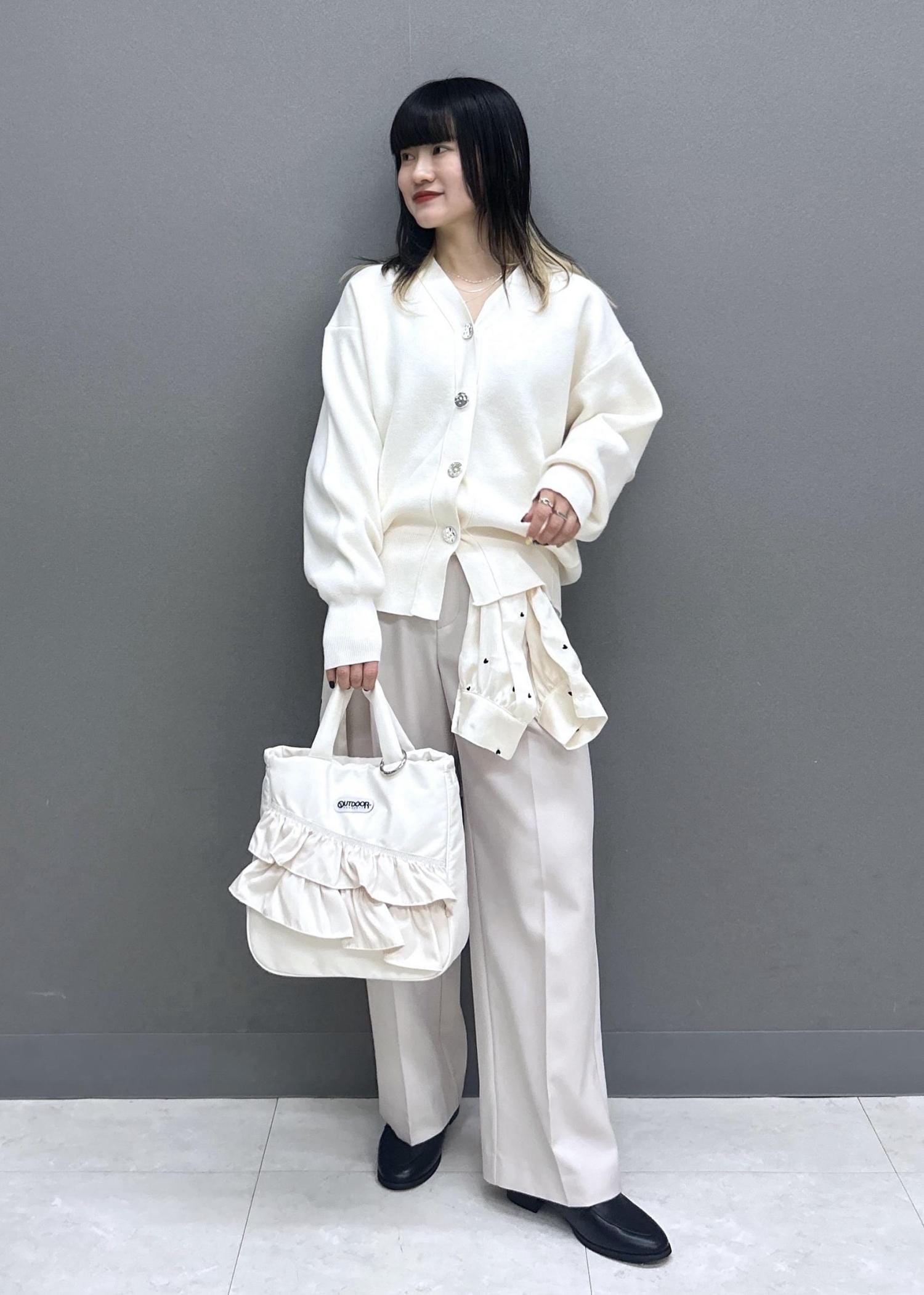 ボタン部分がポイントになるので、インスタイルでスッキリと着用するのがおすすめです☺︎