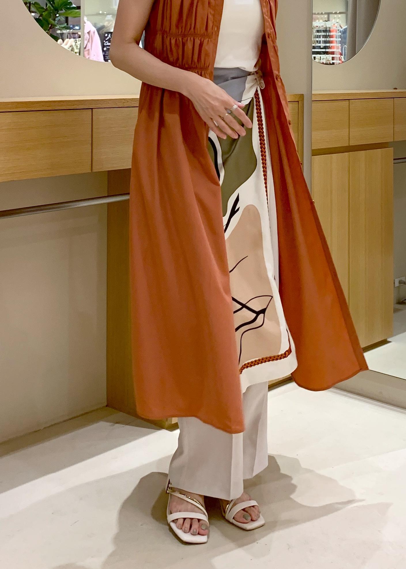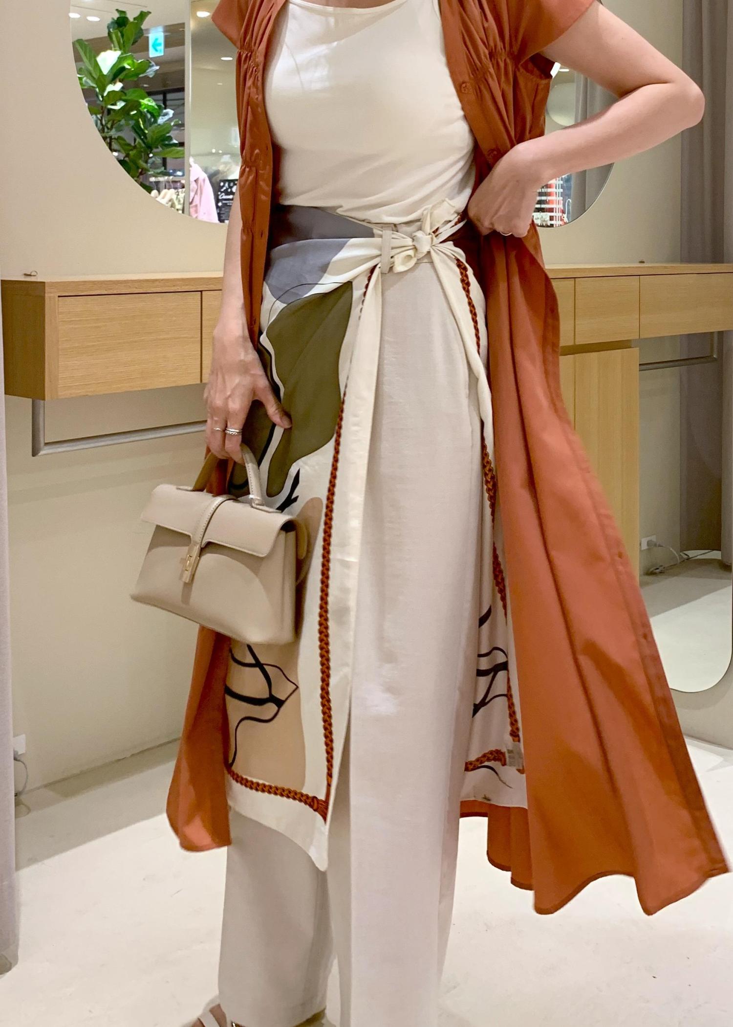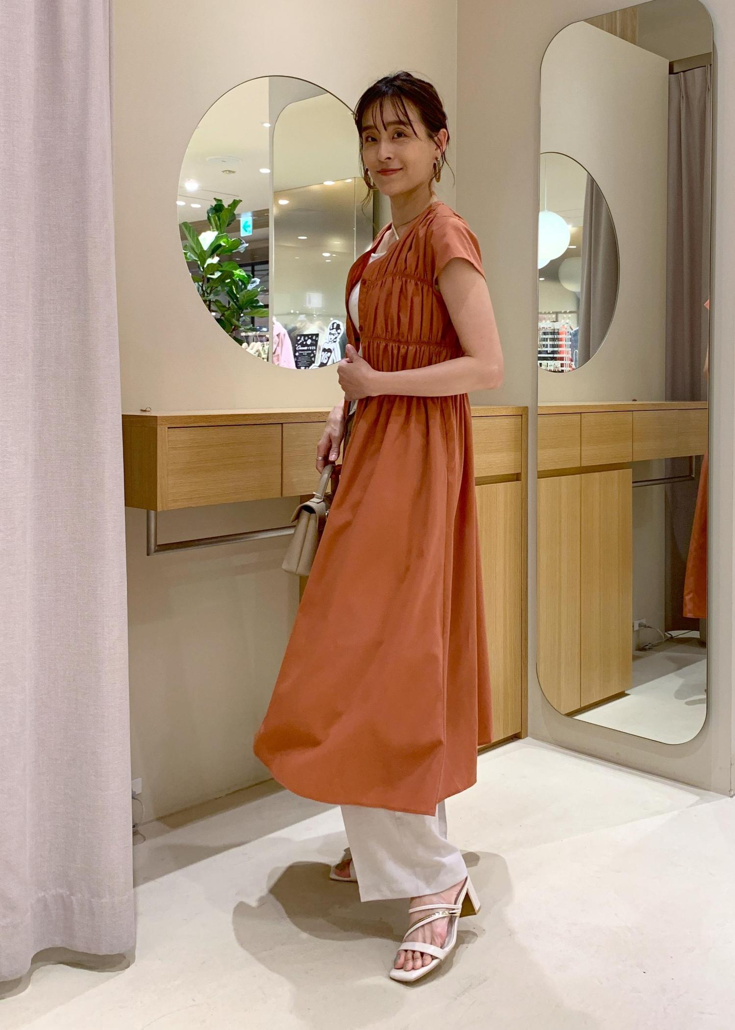身長165cmでも着丈は膝下ですが、小柄な方でも取り入れられる長さです。さっぱりとした生地感なので、丈がながくても暑苦しくありませんでした。