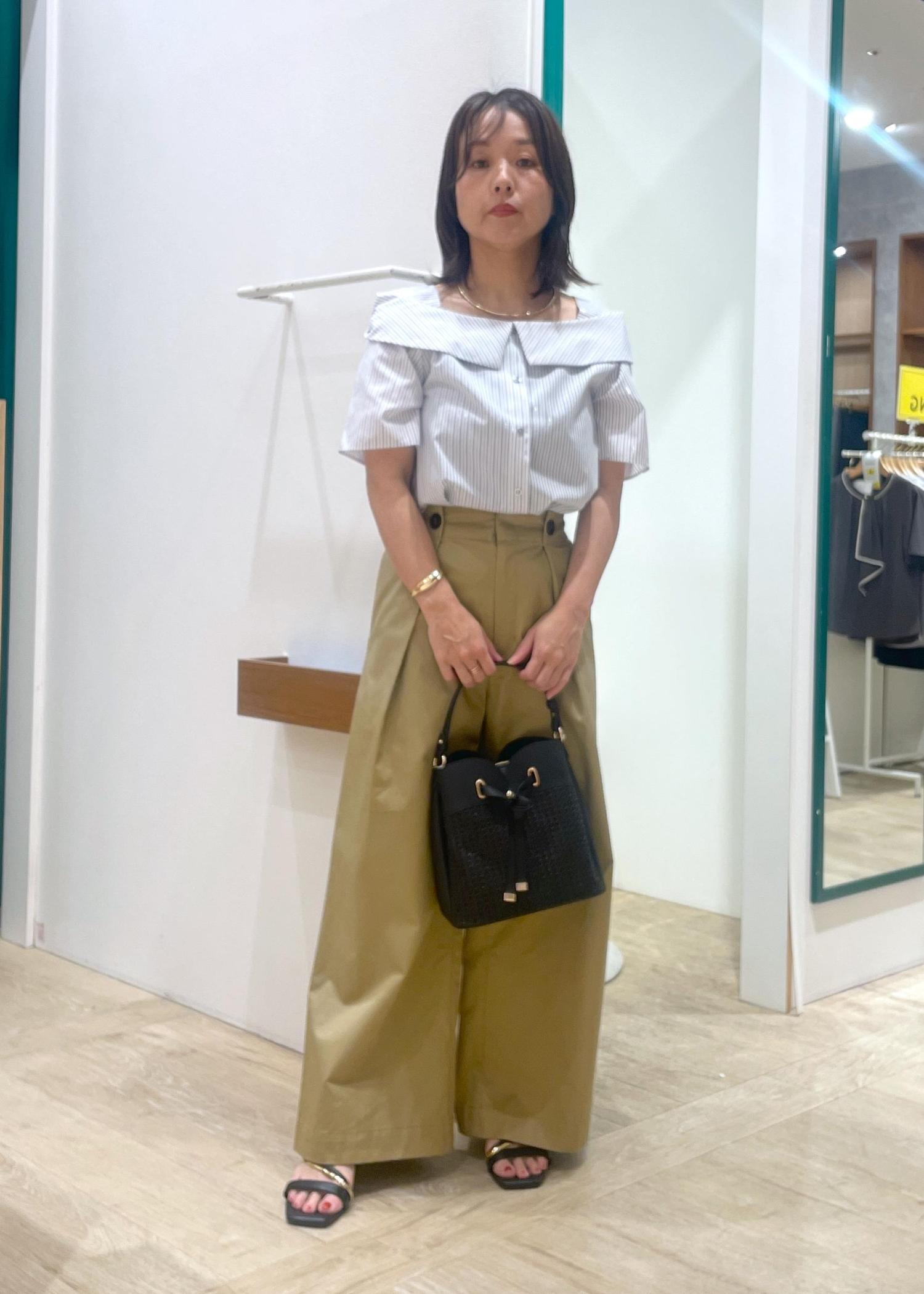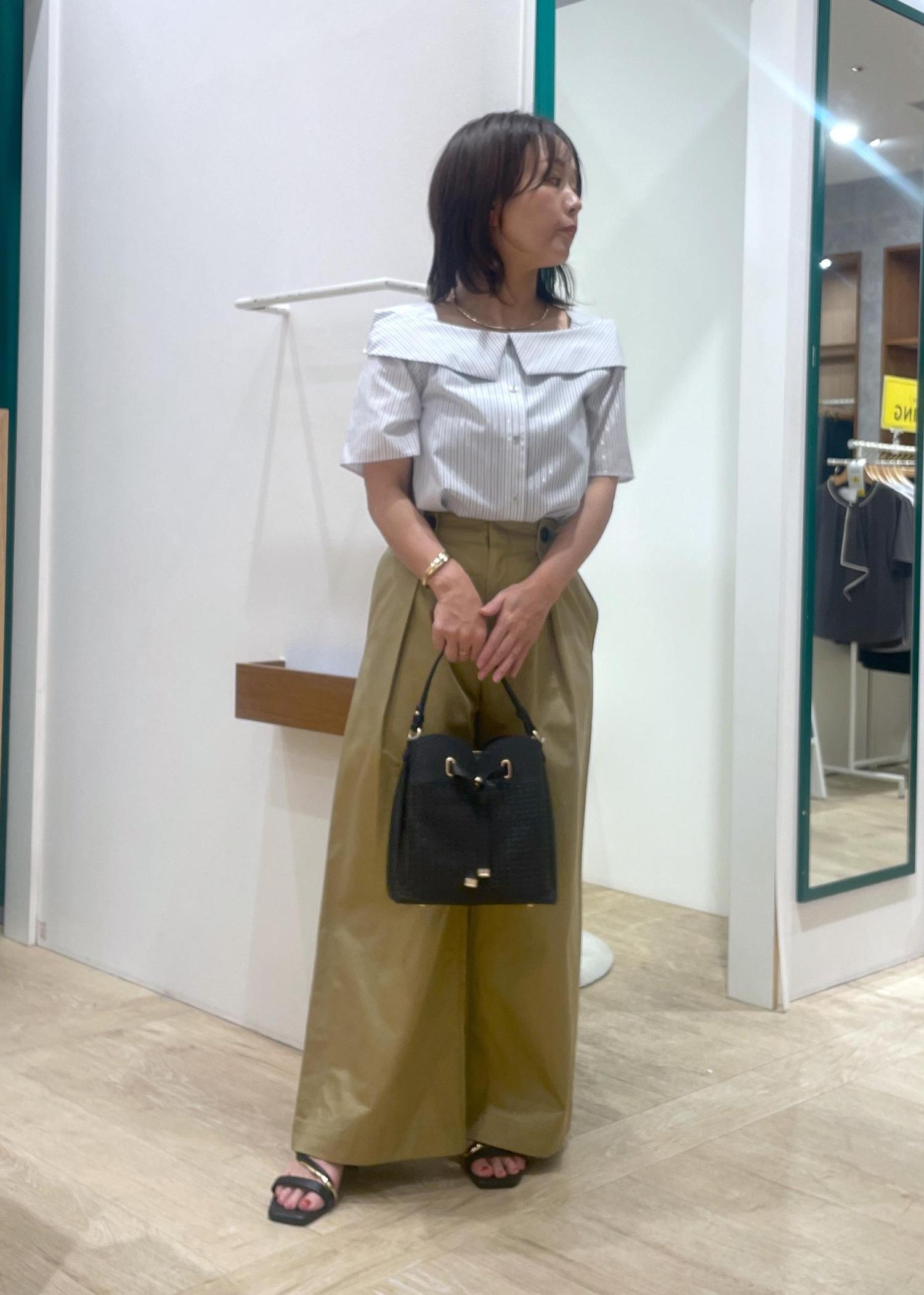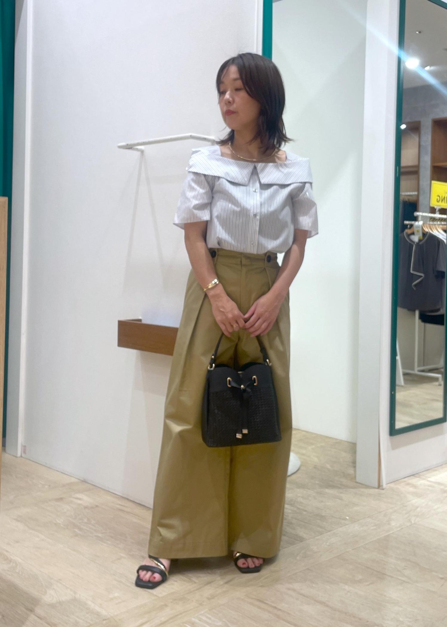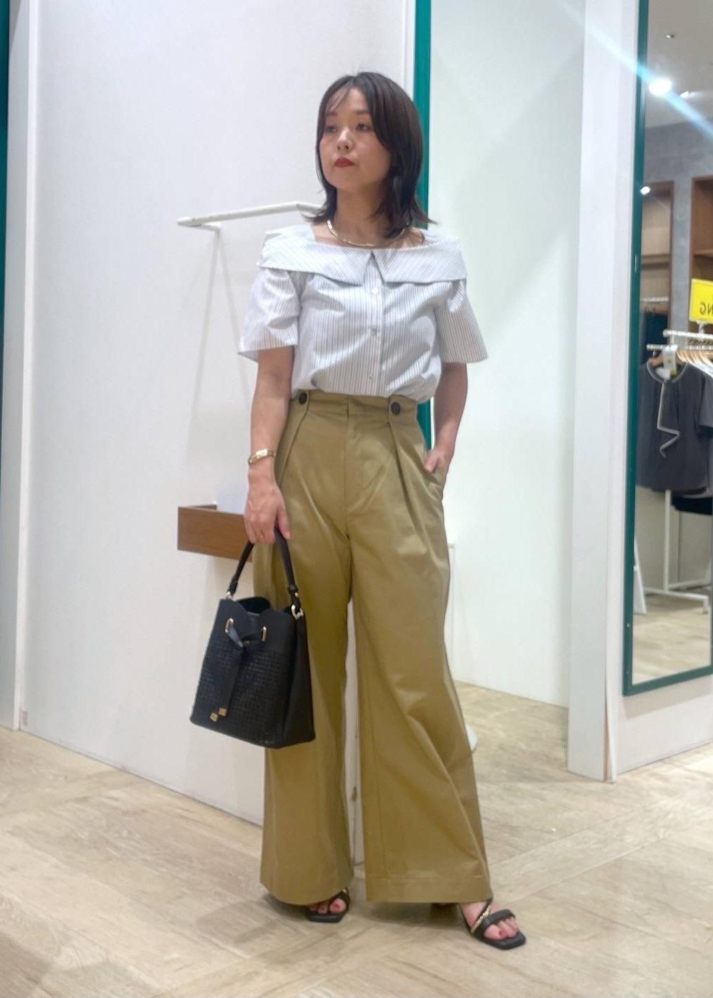【新色追加】【防シワ】ラメミックスオフショルダー風ストライプシャツ