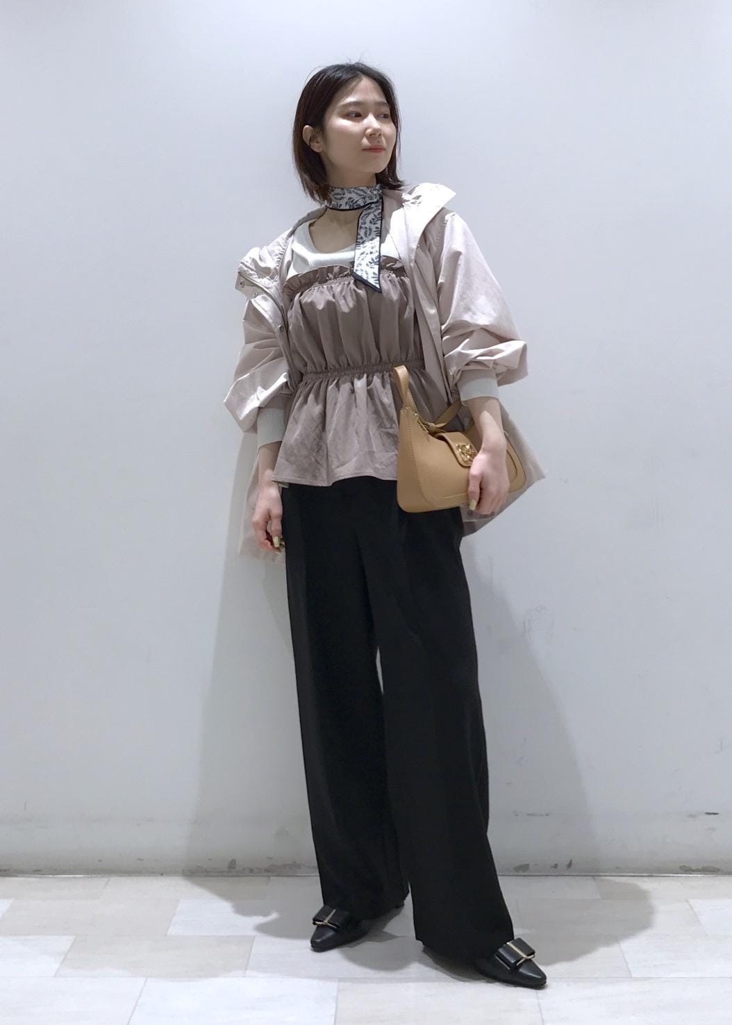 ペタンコの靴で合わせる場合は、ウエストを一度折って着用すると丁度良くなります。