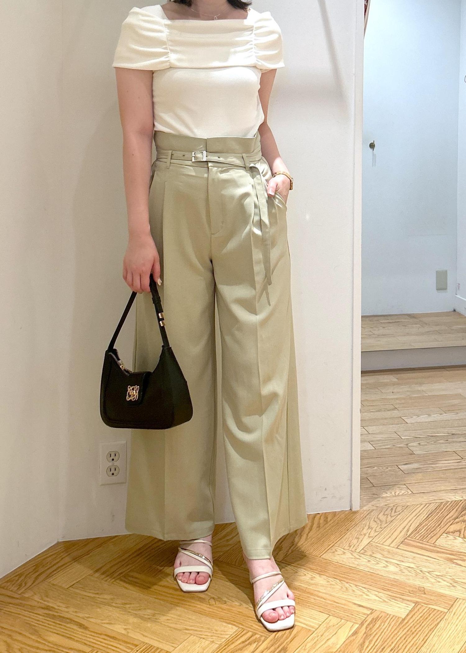 オフショルのカットソーに、グリーンのワイドパンツを合わせた爽やかなコーディネートです♪