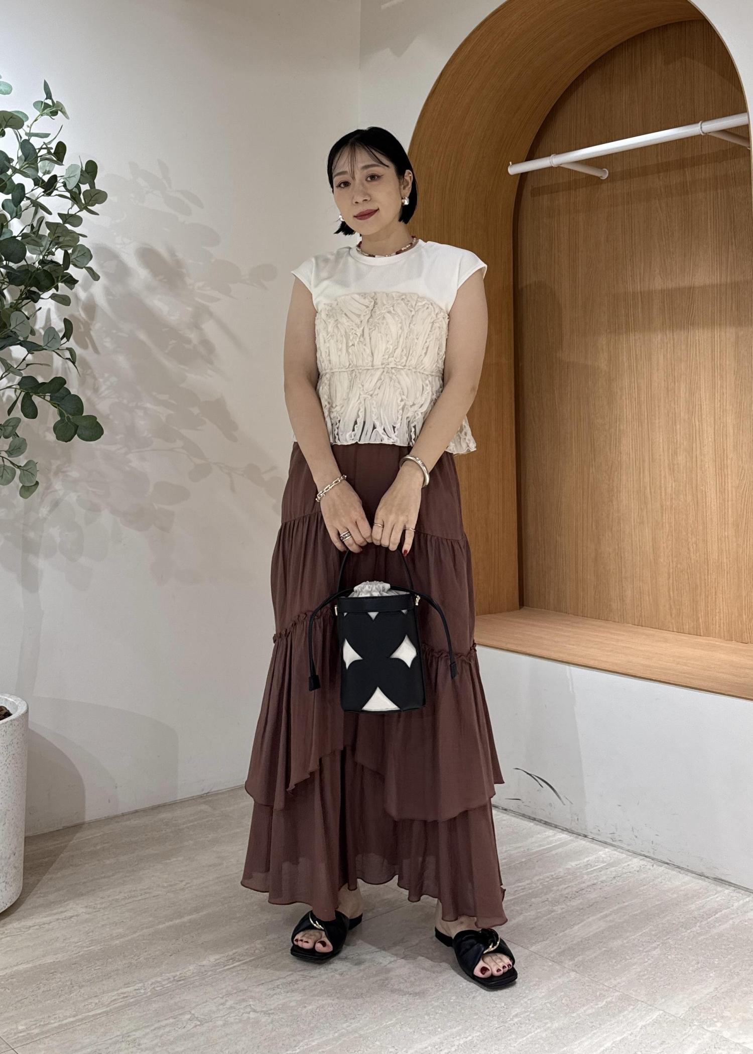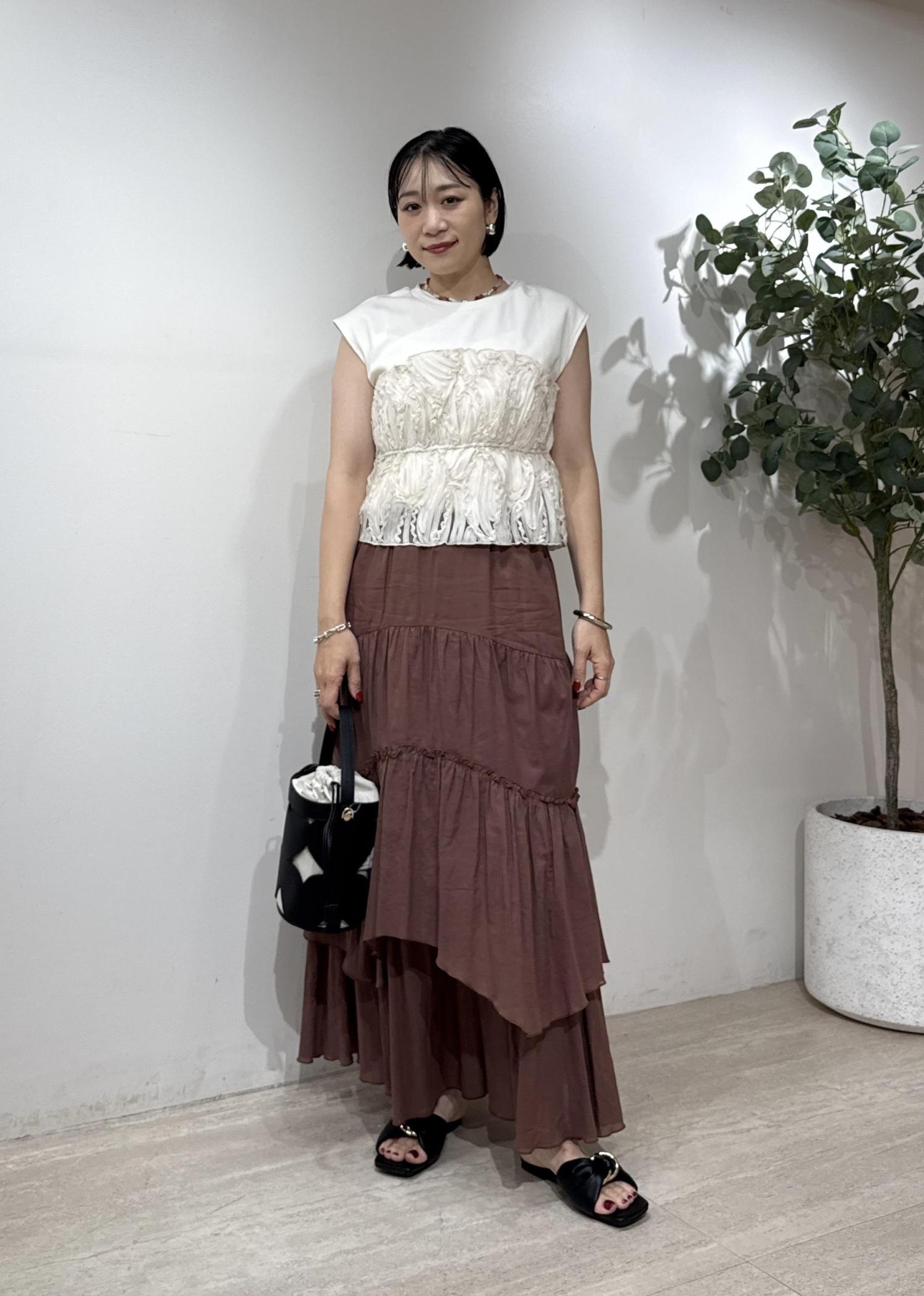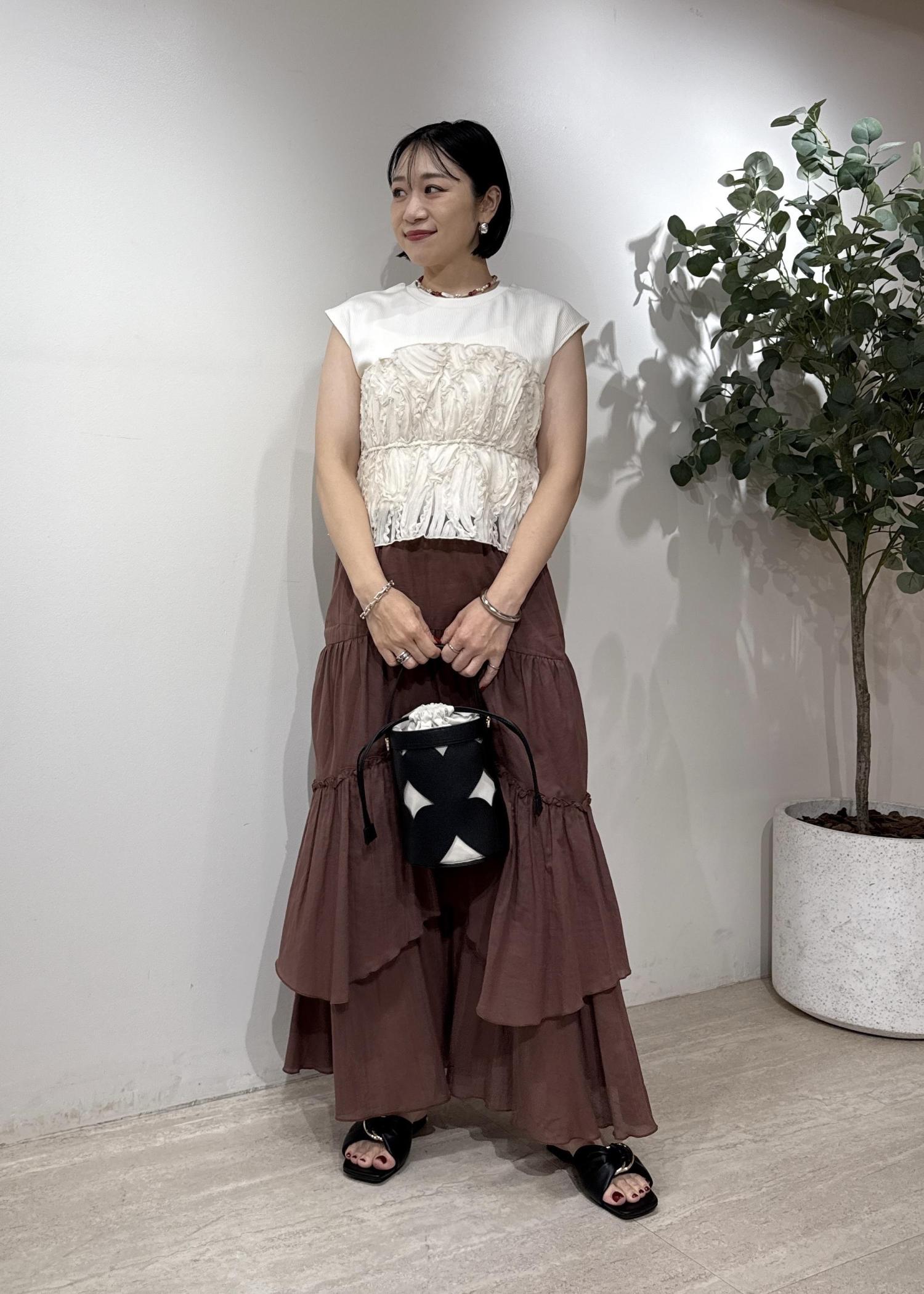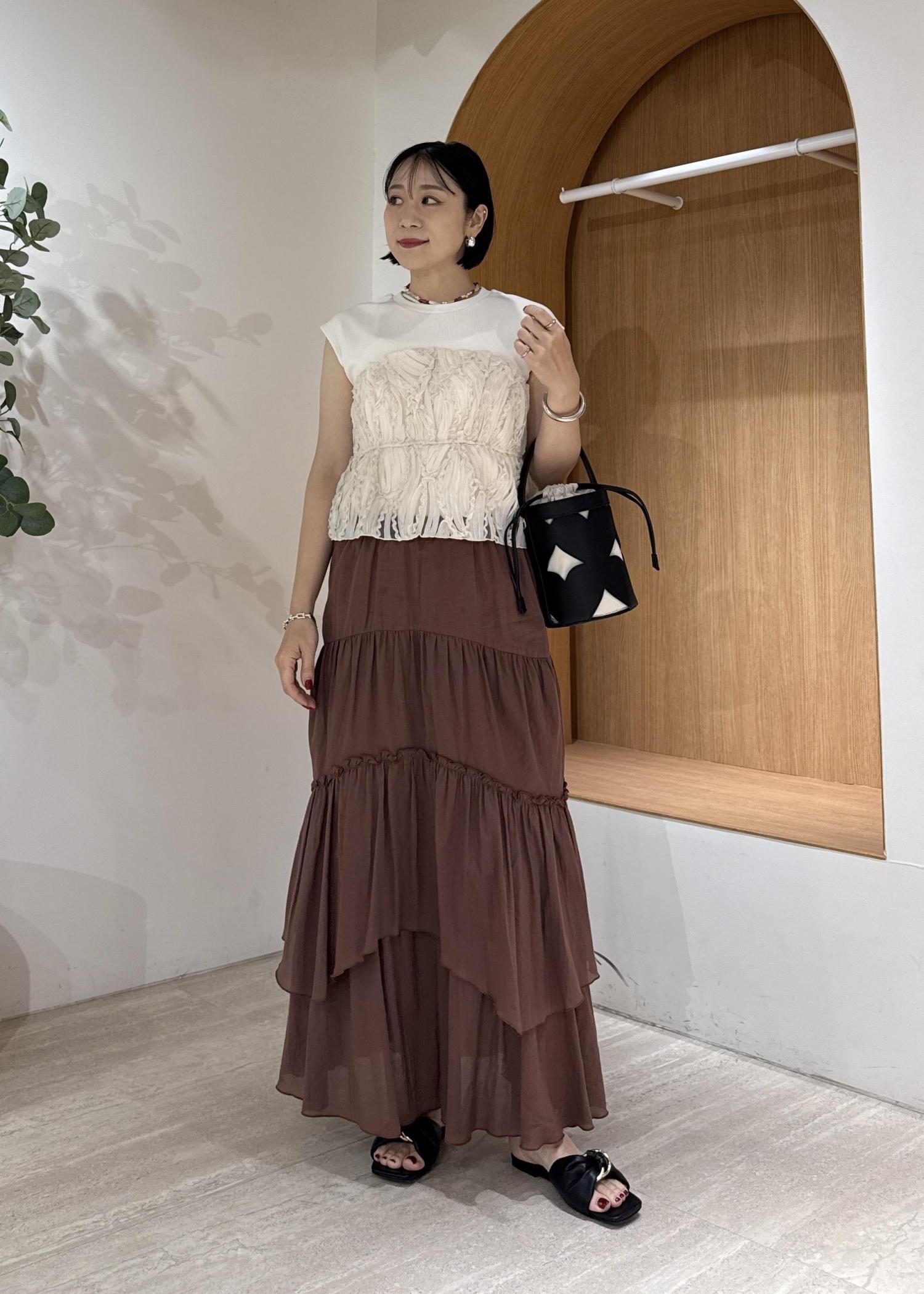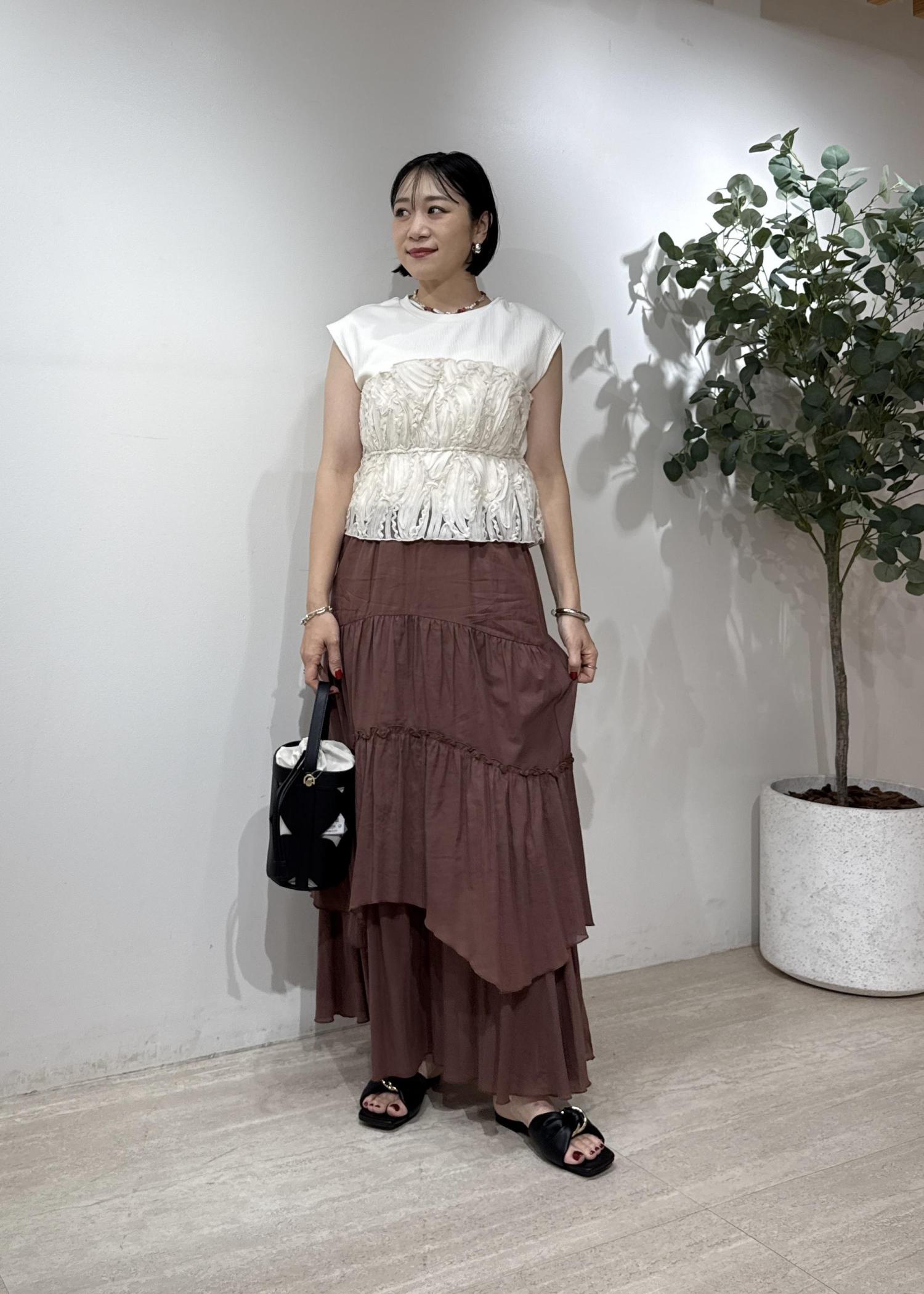 ダークブラウンのスカートが大人っぽく夏らしい印象にしてくれます♪