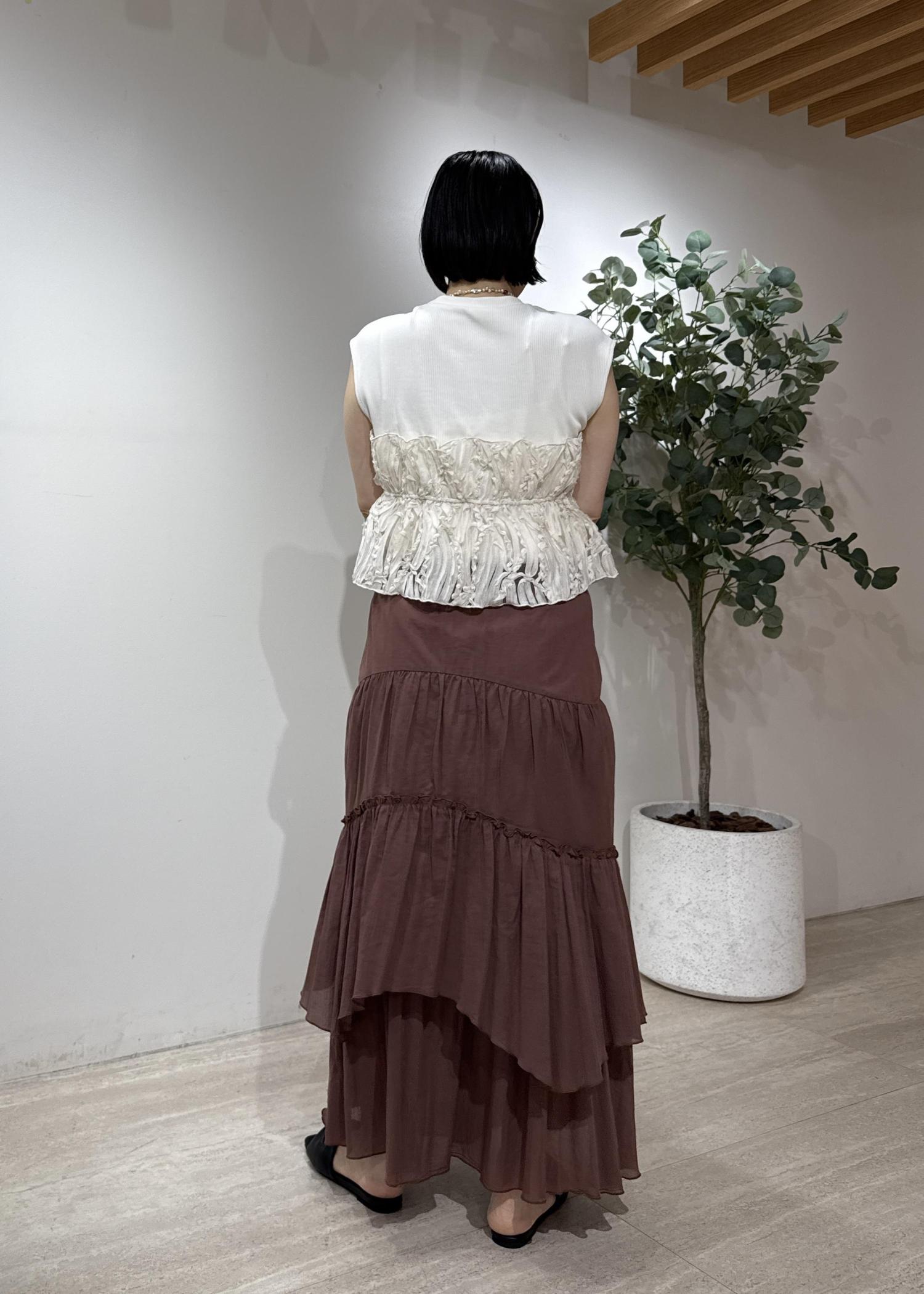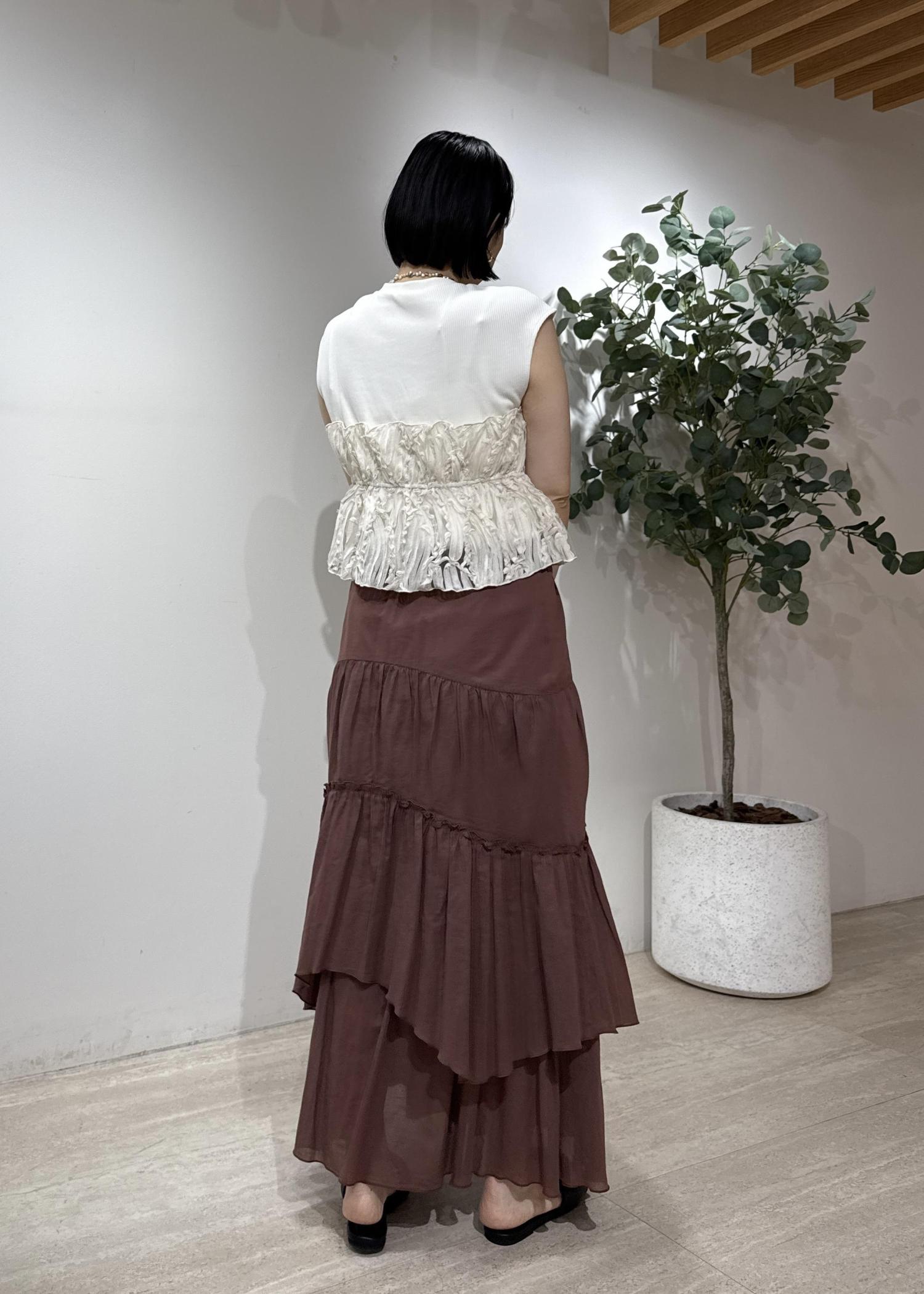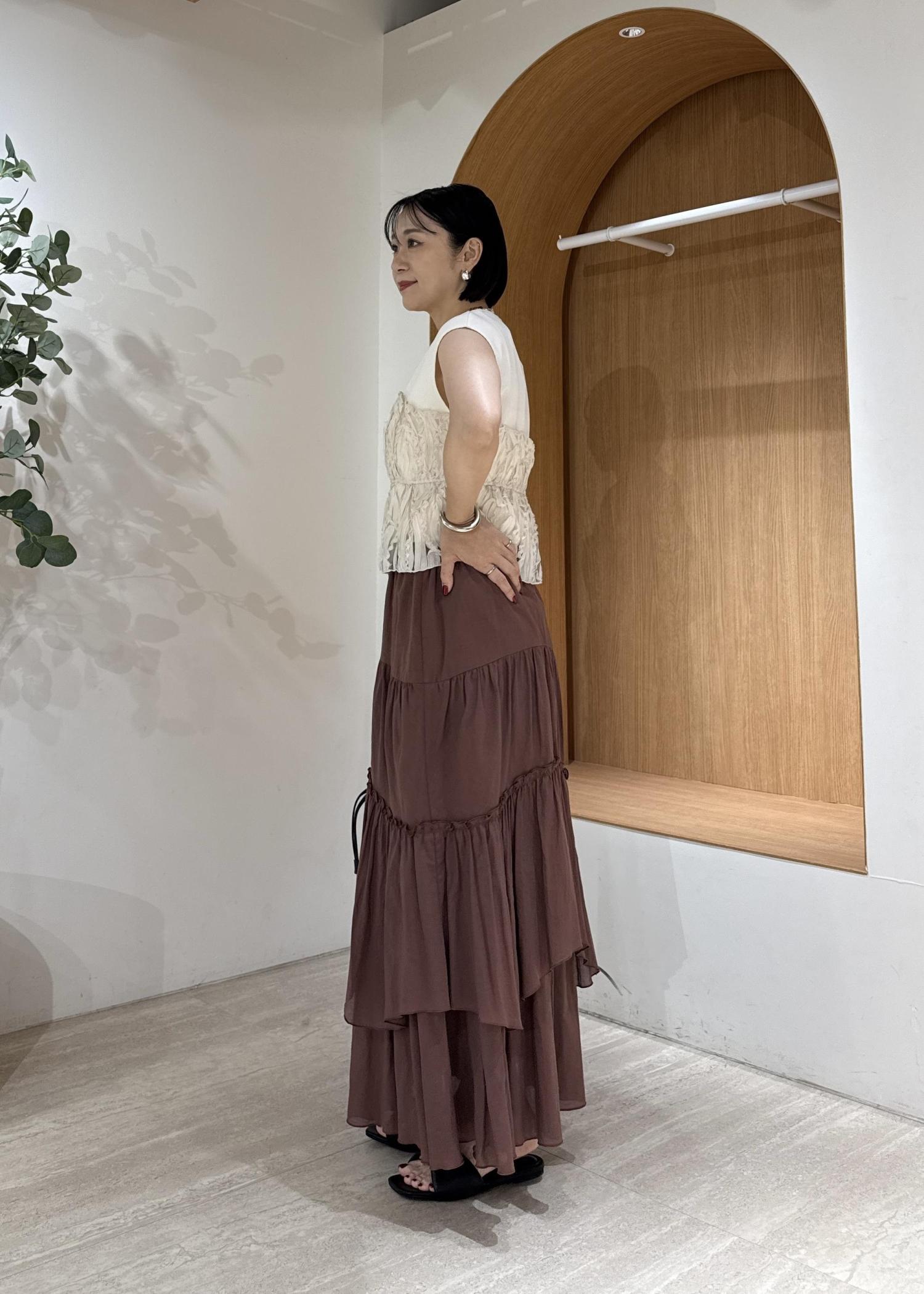 アウトレットVISボイルティアードスカートダークブラウン / F¥3,955レビューウエストは総ゴムで、ふわっと軽く楽な履き心地です。