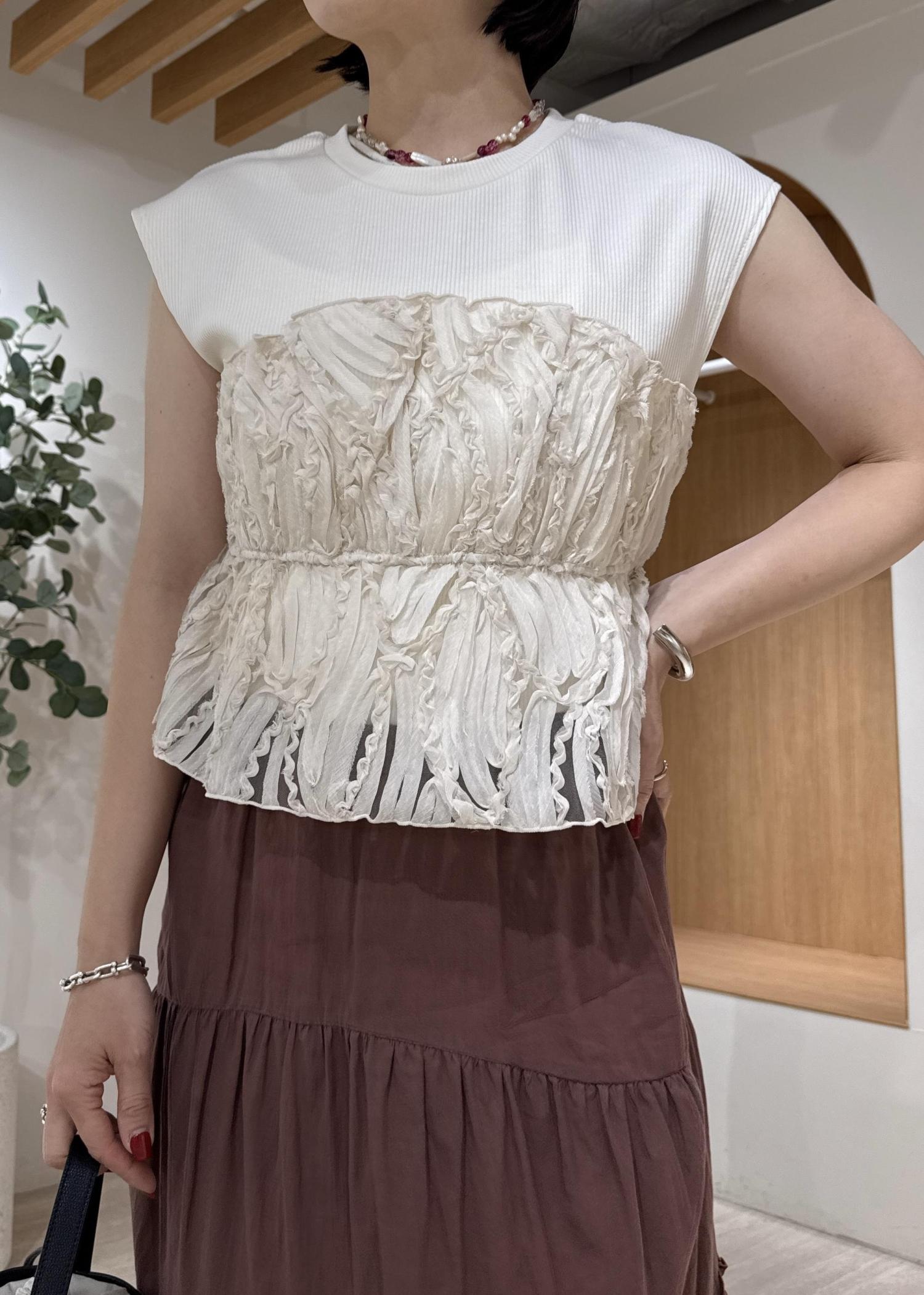 VIS旬なレイヤードスタイルが叶う!ビスチェドッキングフレンチスリーブプルオーバー【洗える】キナリ系 / F¥5,489レビューカットソー素材でストレッチも効いていてとても楽です!黒は透け感が無い為キャミソールなど着用せず着れるため、夏は涼しく着れます♪