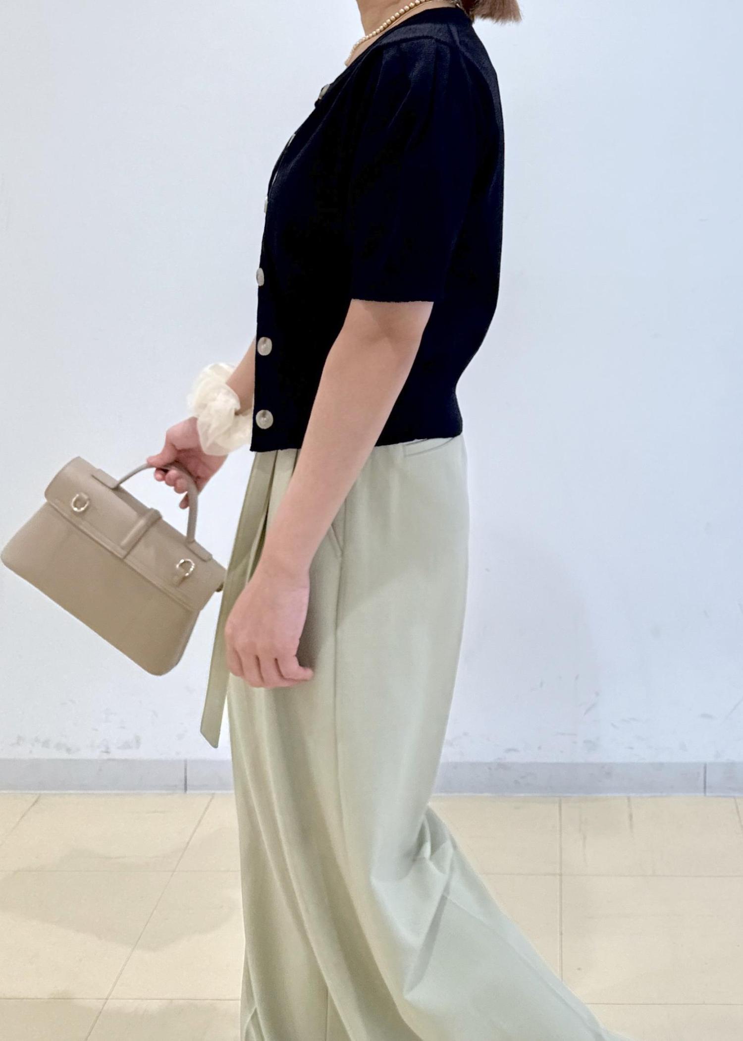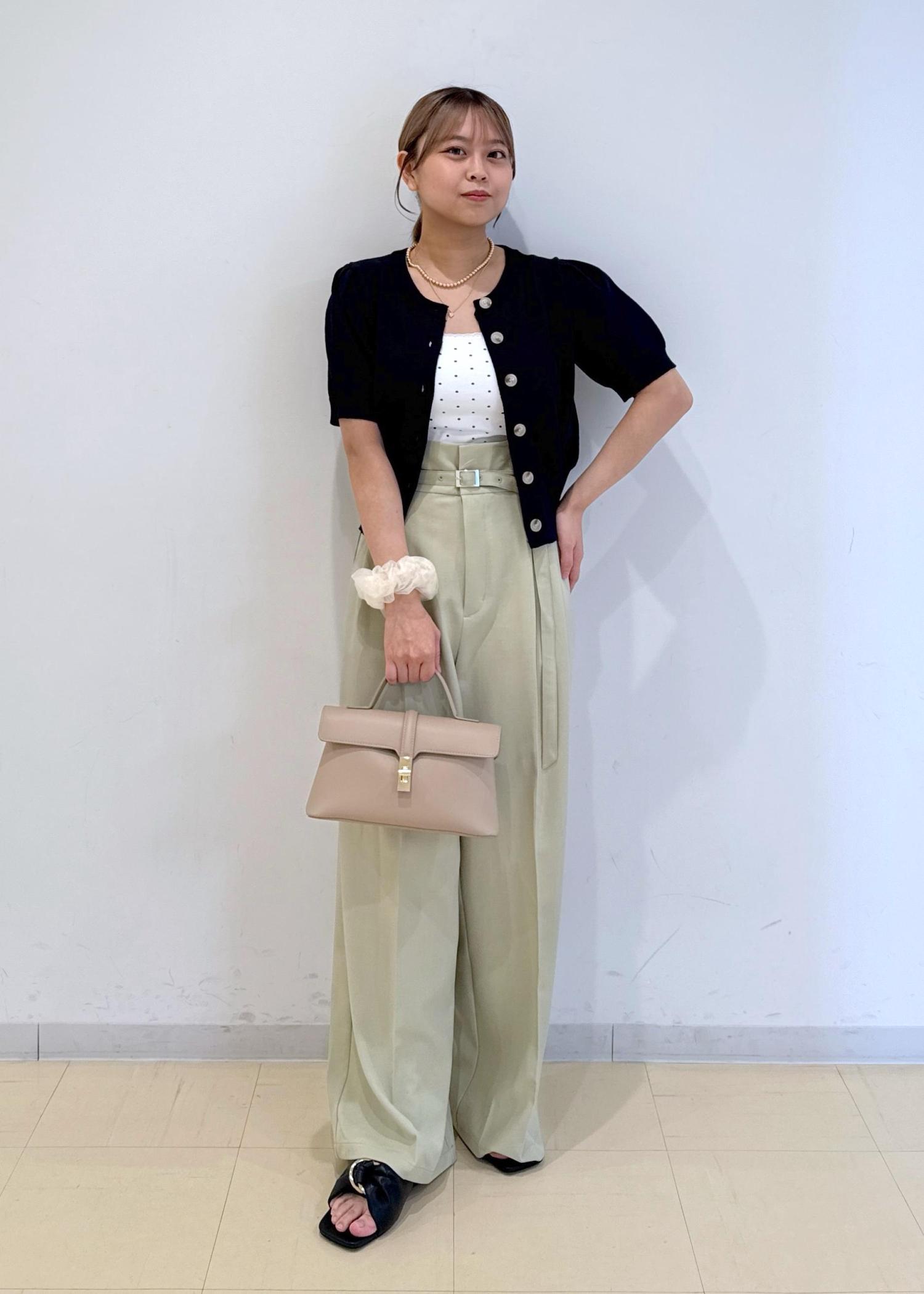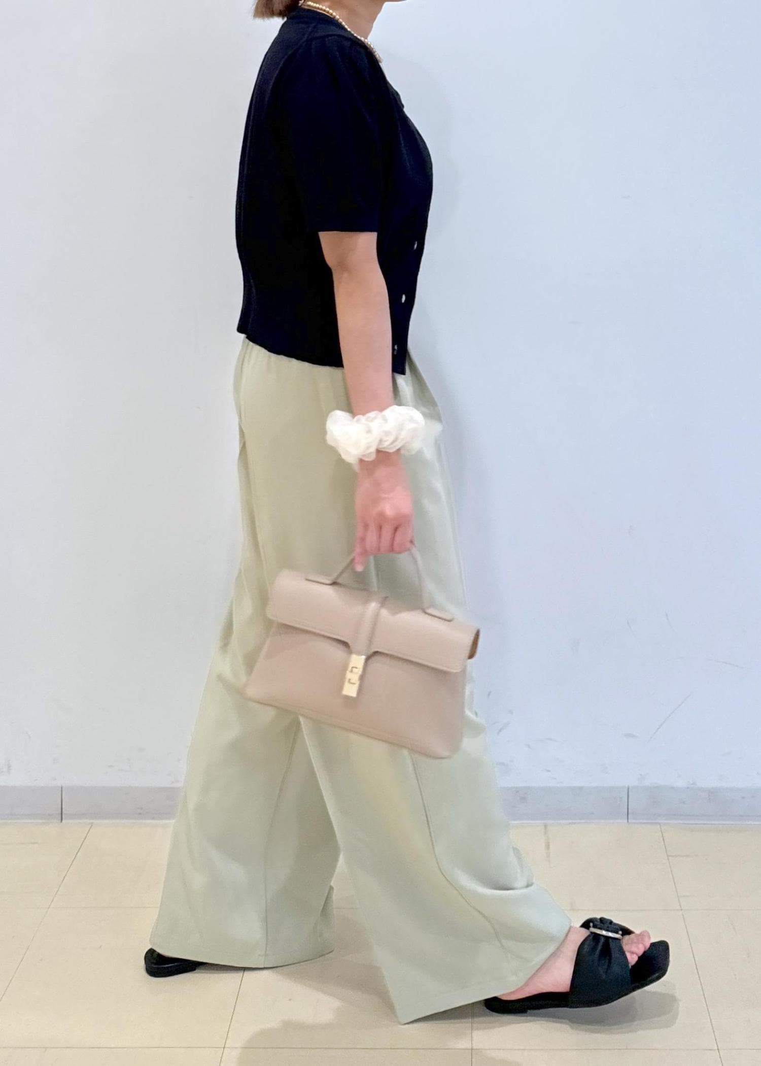 グリーンのパンツにネイビーのカーディガンを合わせ、小物もキレイめのアイテムで統一することで大人らしさを出しました。