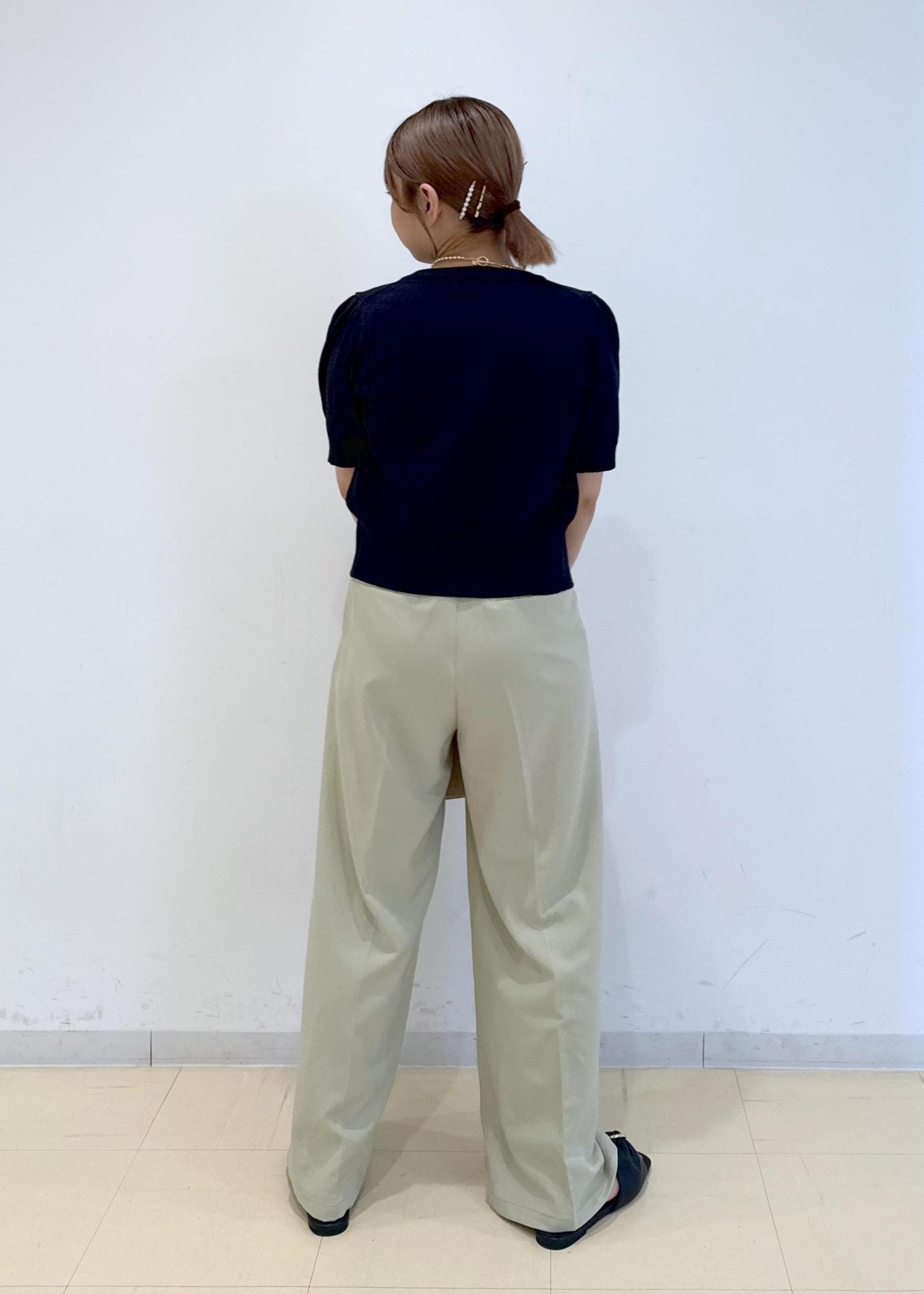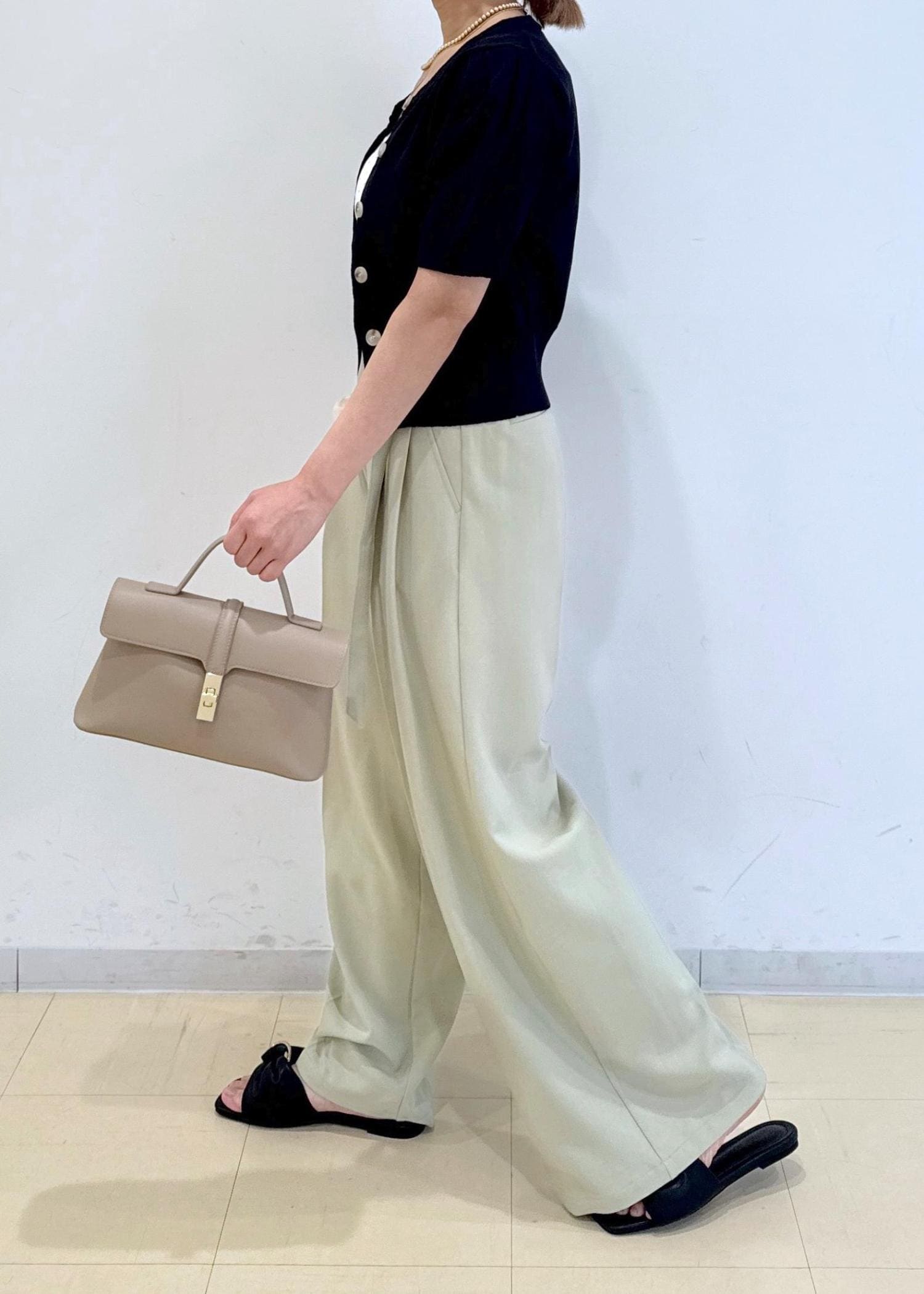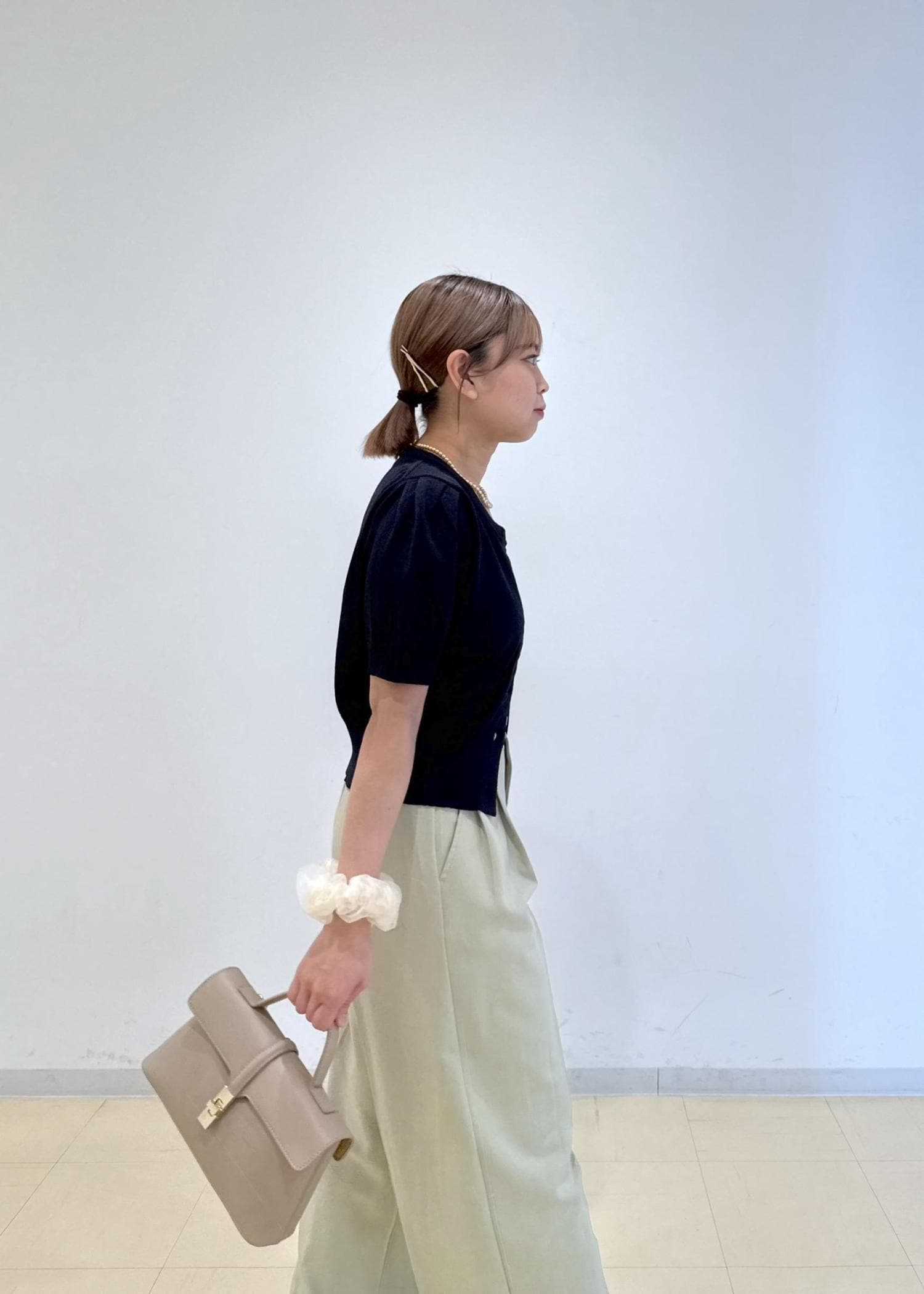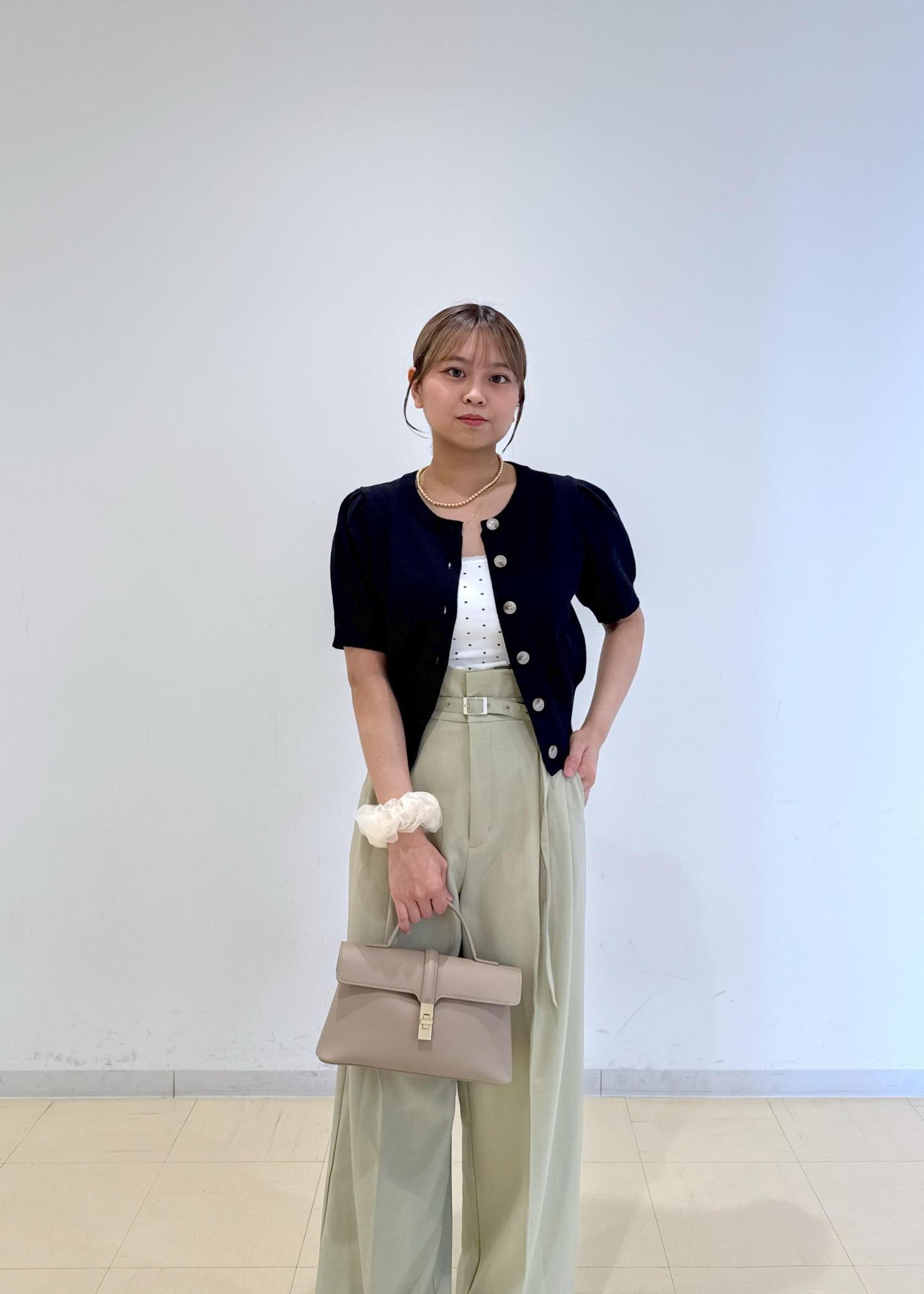 グリーンのパンツにネイビーのカーディガンを合わせ、小物もキレイめのアイテムで統一することで大人らしさを出しました。