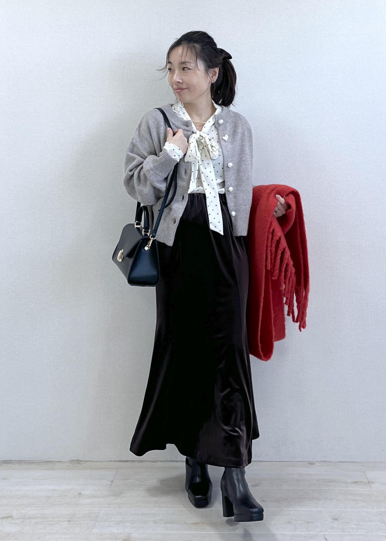 小物は抜け感のあるベージュトーンでまとめて、こなれ感も忘れずに。