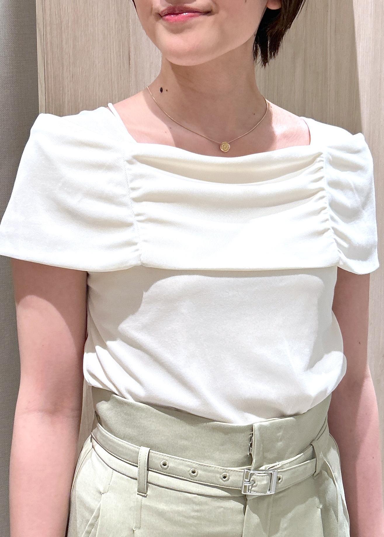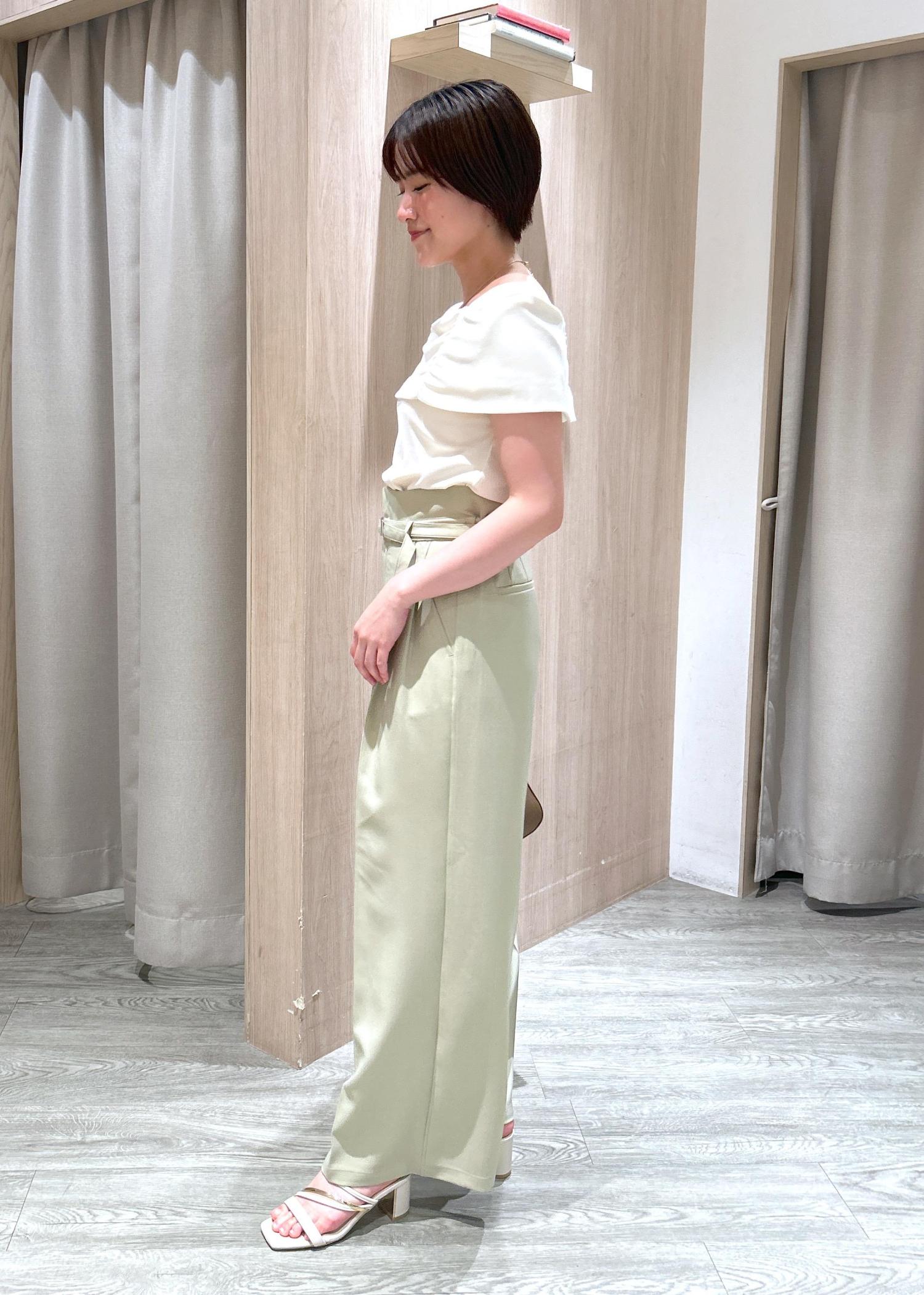 オフショルニットにハイウエストパンツを合わせスタイルUP効果のあるキレイめなコーデにしました!
