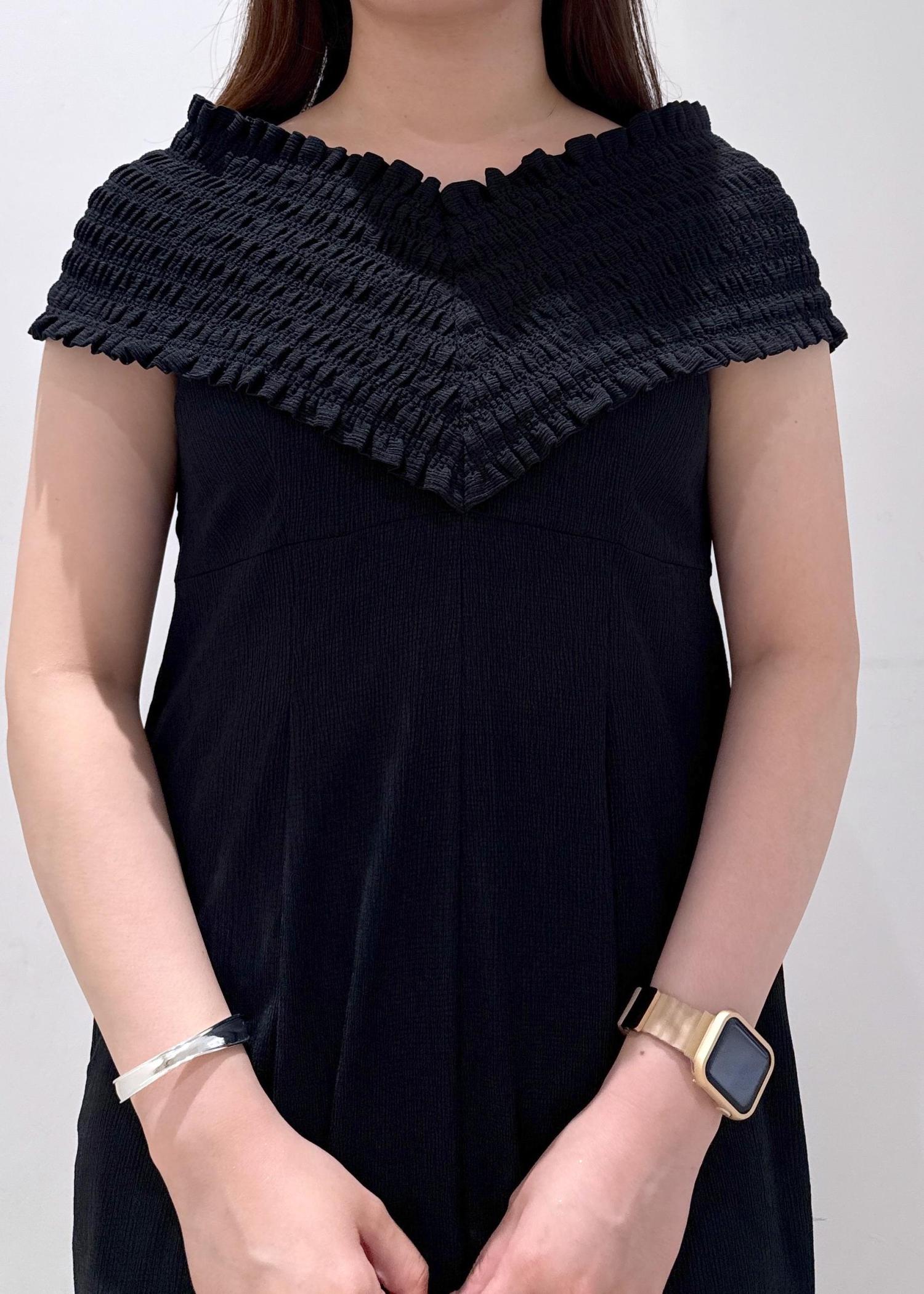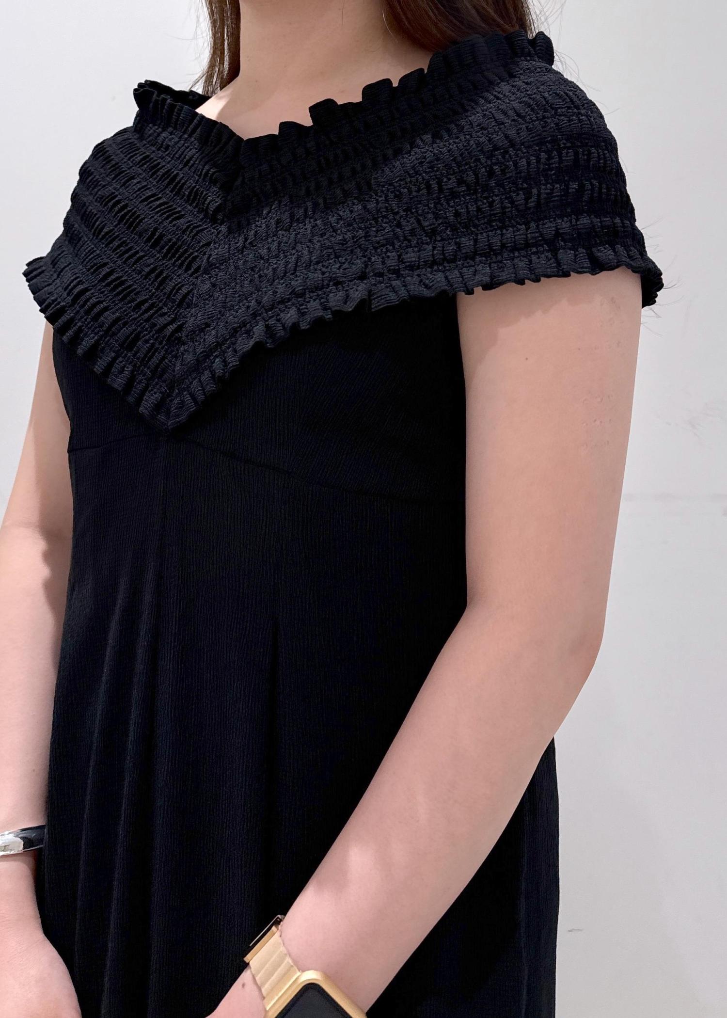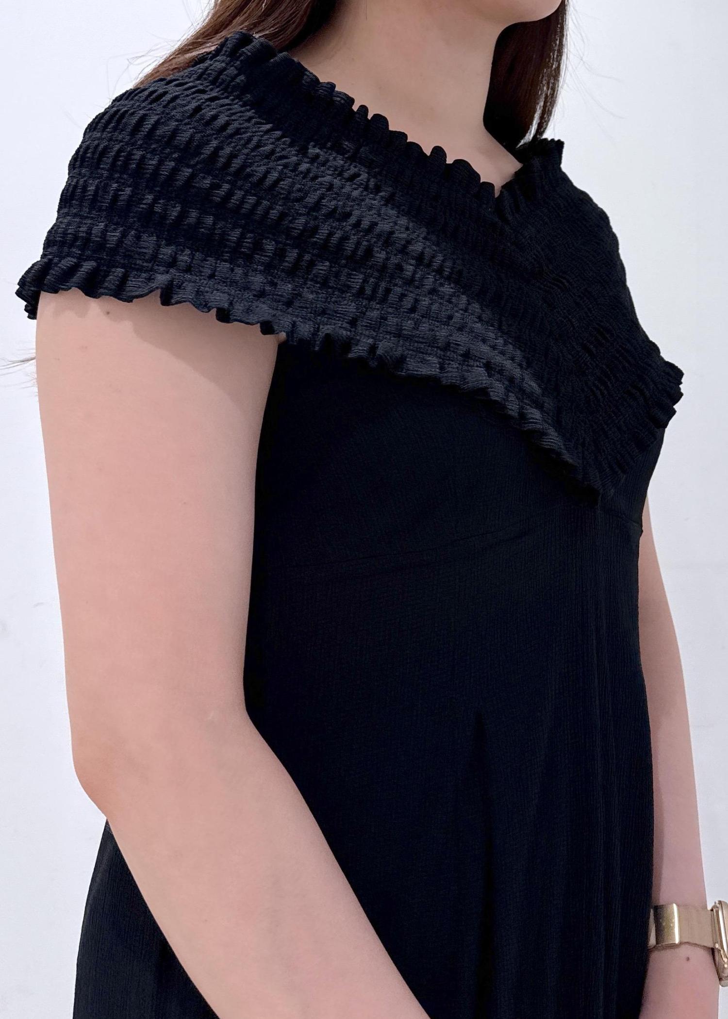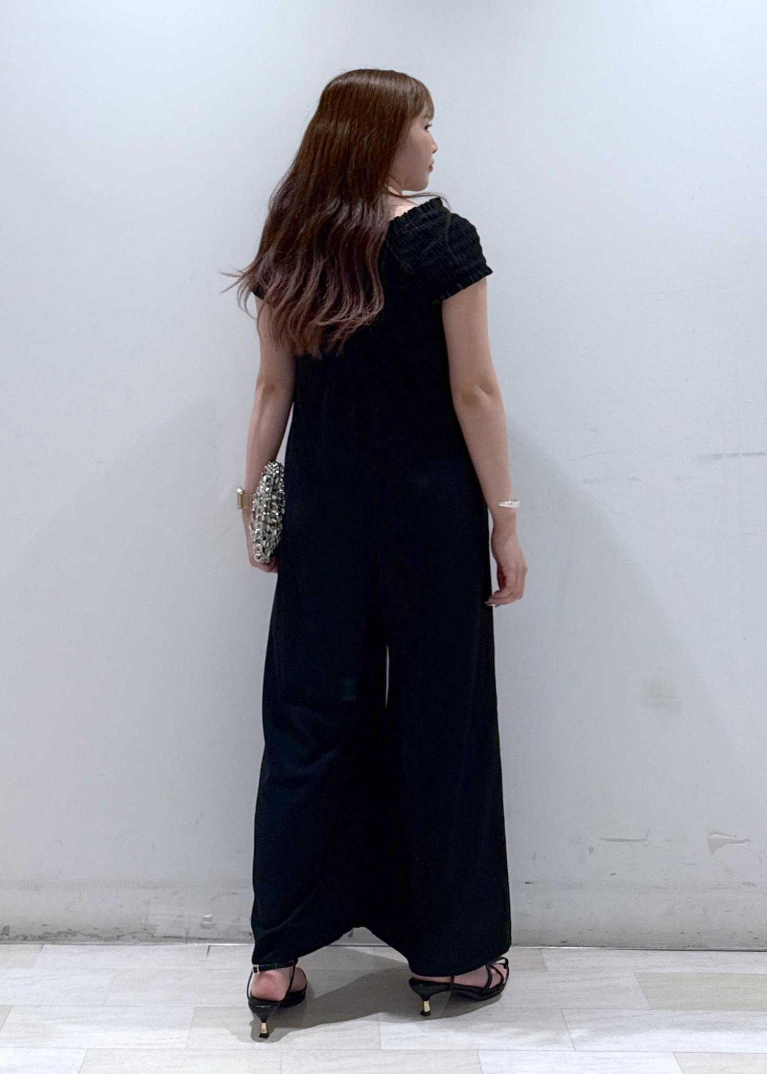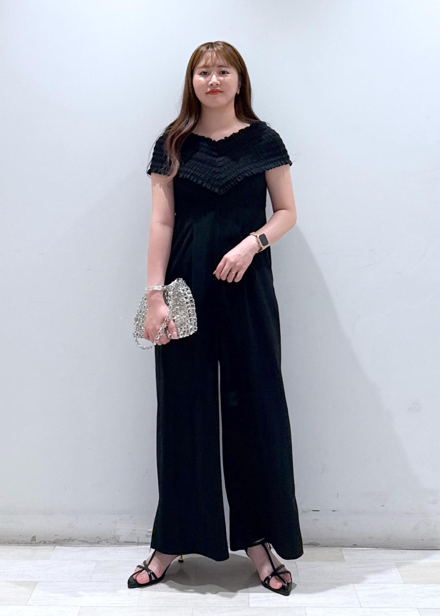 アウトレットVISシャーリングオフショルダーオールインワンブラック / F¥6,327レビュー身長157cm/Fサイズ着用。