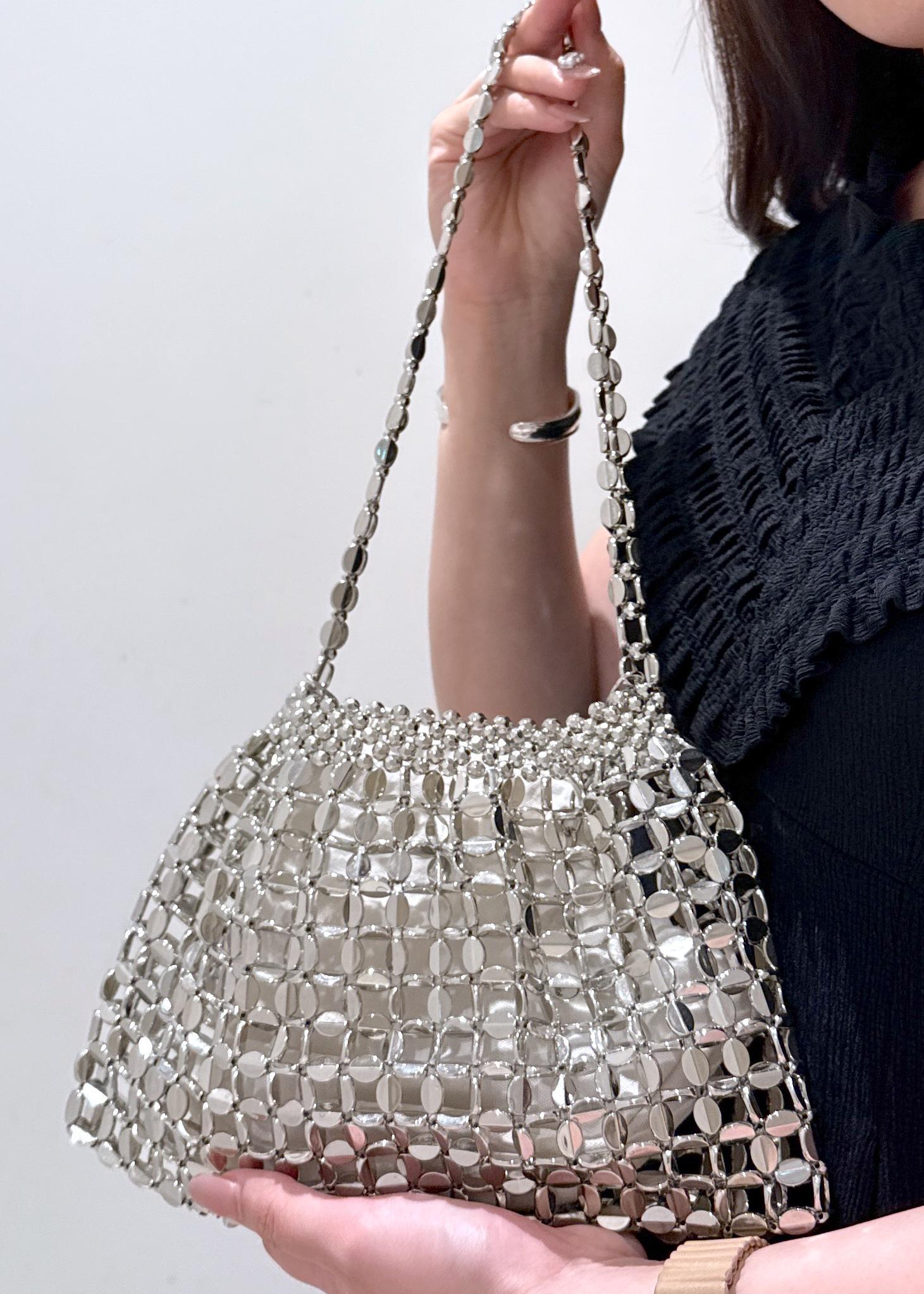 ブラックカラーになるのでシルバーのビーズバッグと合わせて、大人レディなスタイリングにしてみました。