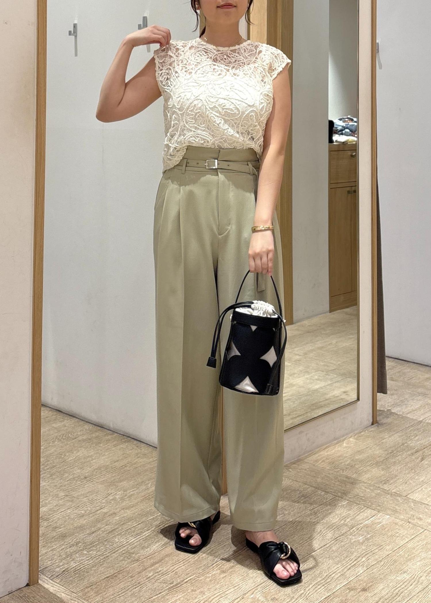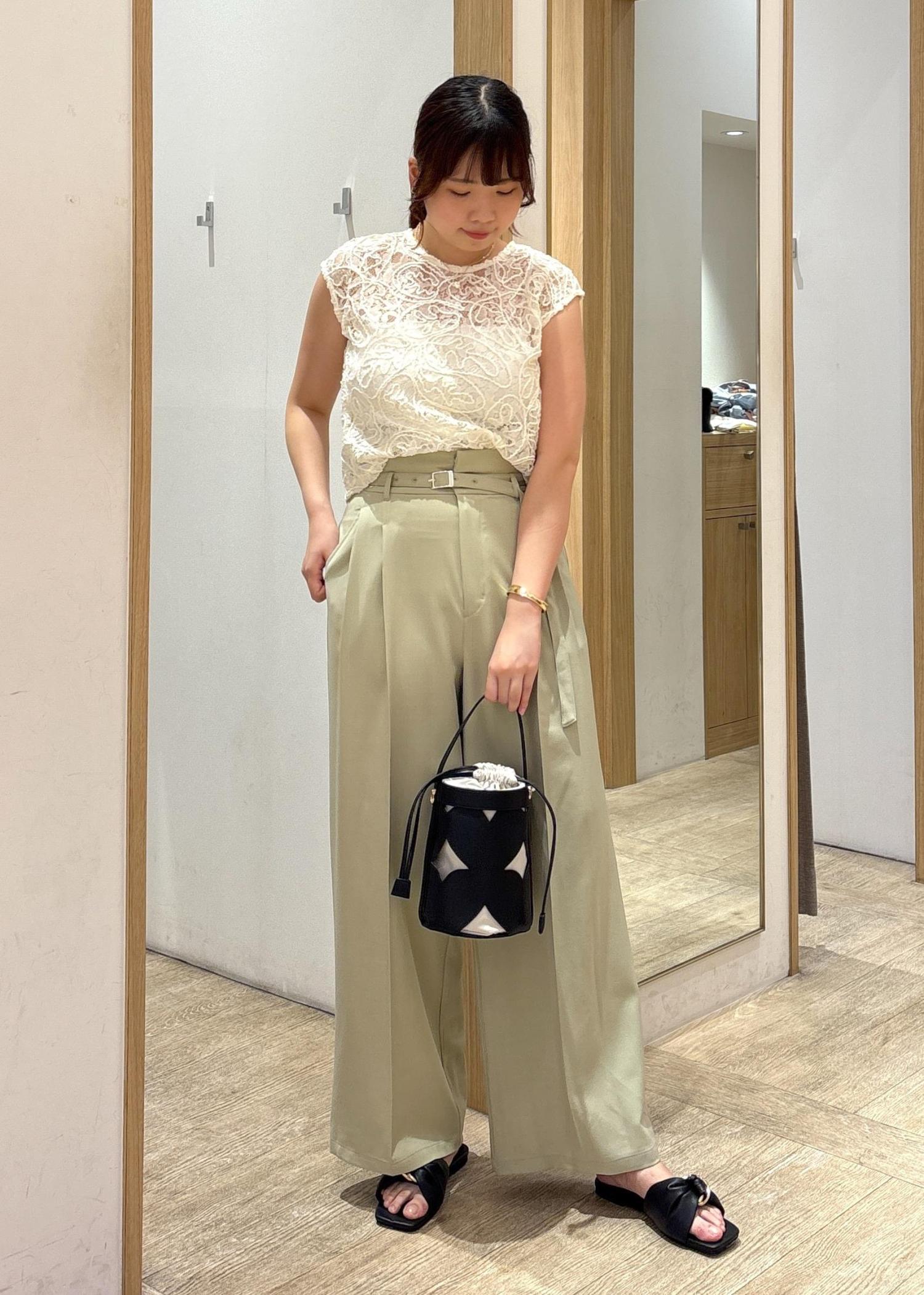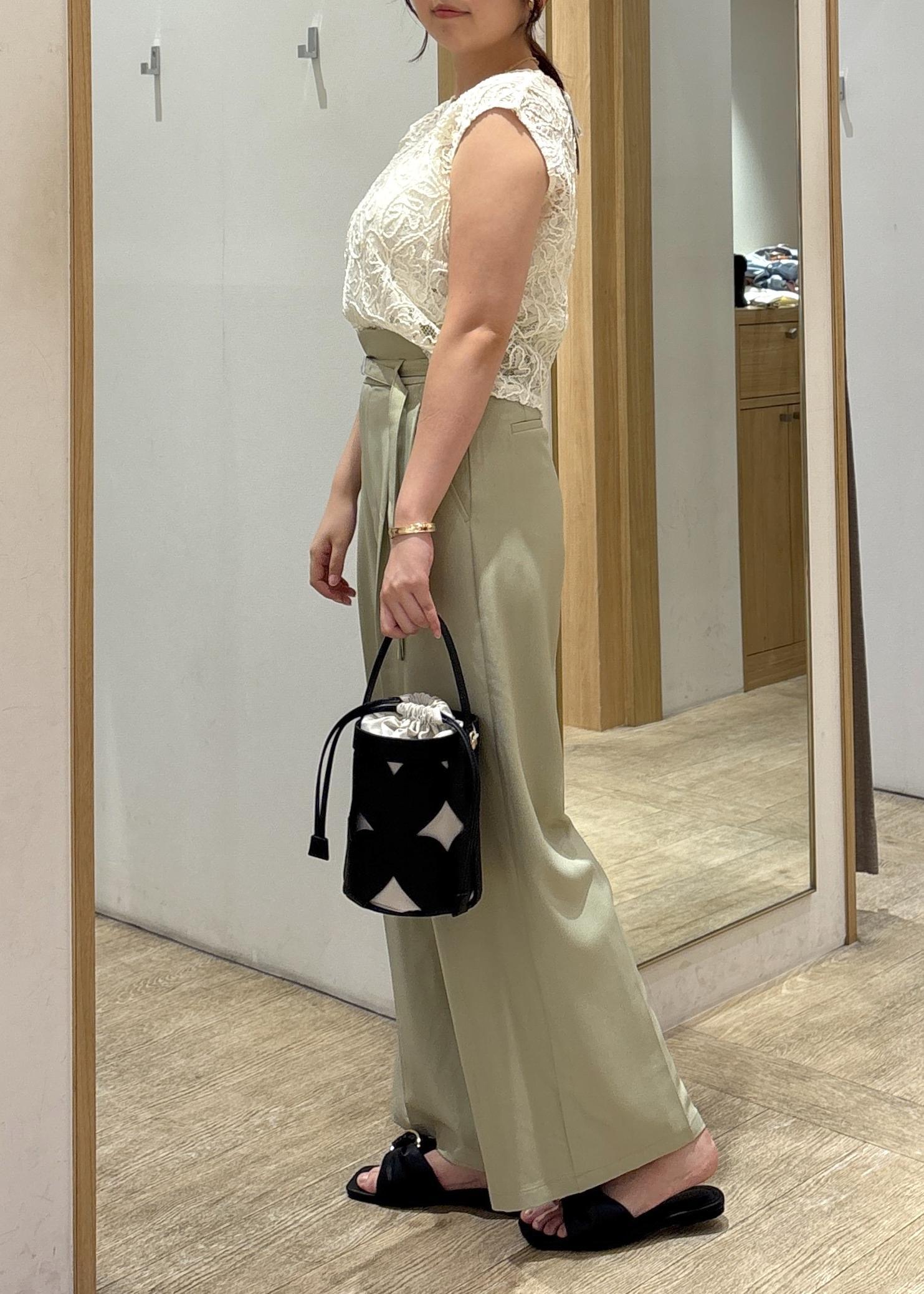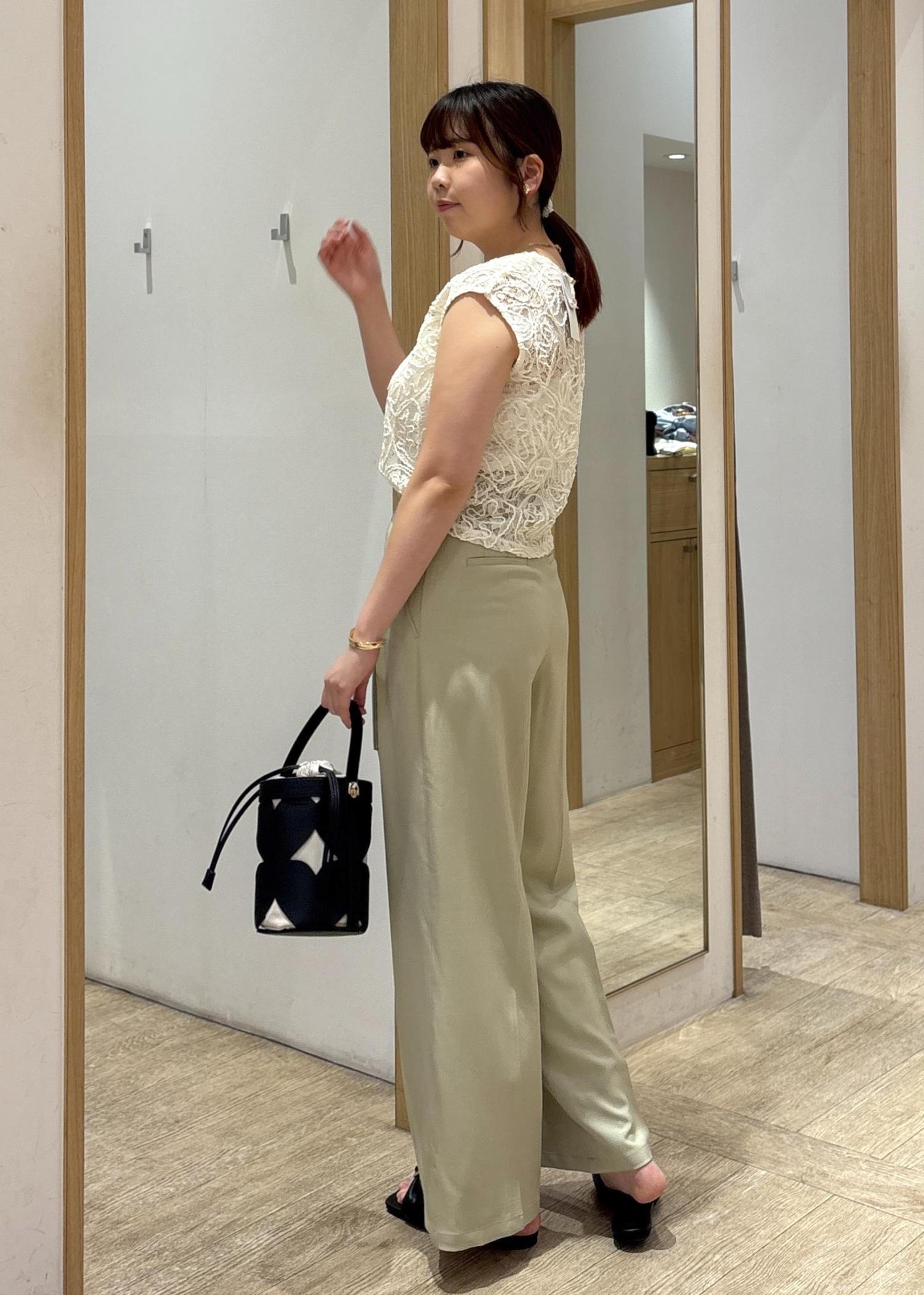 動きのあるワイドパンツと、繊細なレーストップスが涼やかで上品な印象に。サンダルやバケツバッグのモードな要素が全体を引き締め、甘くなりすぎない仕上がり。