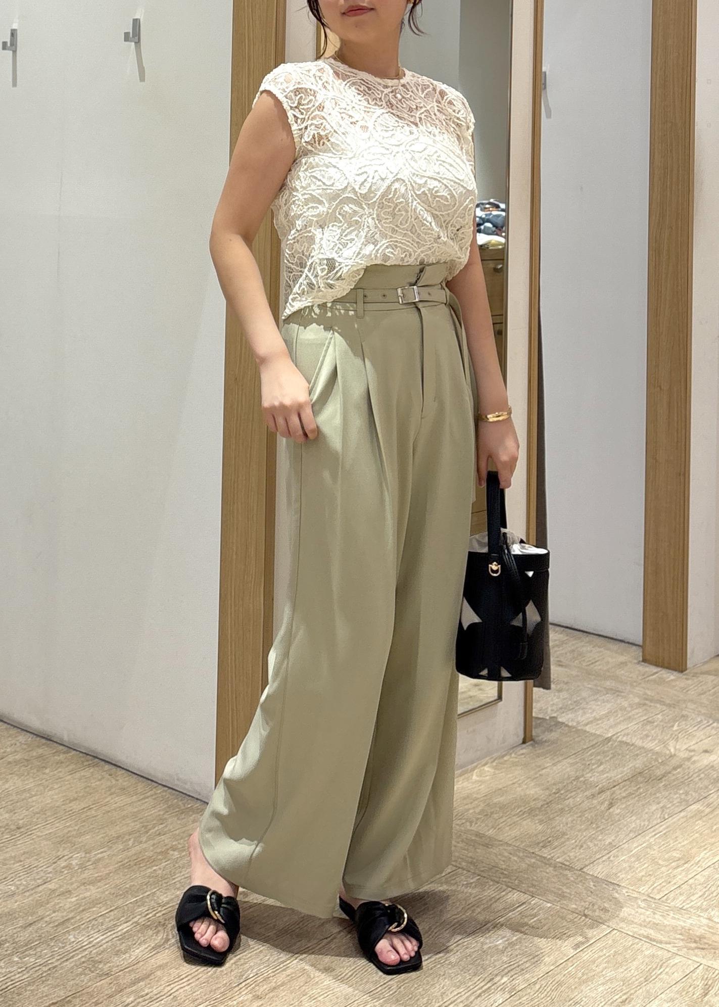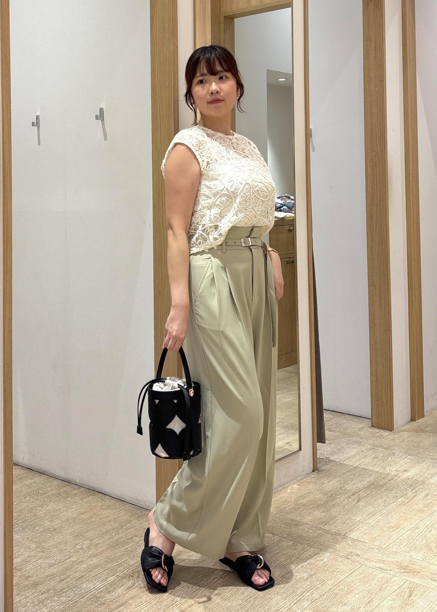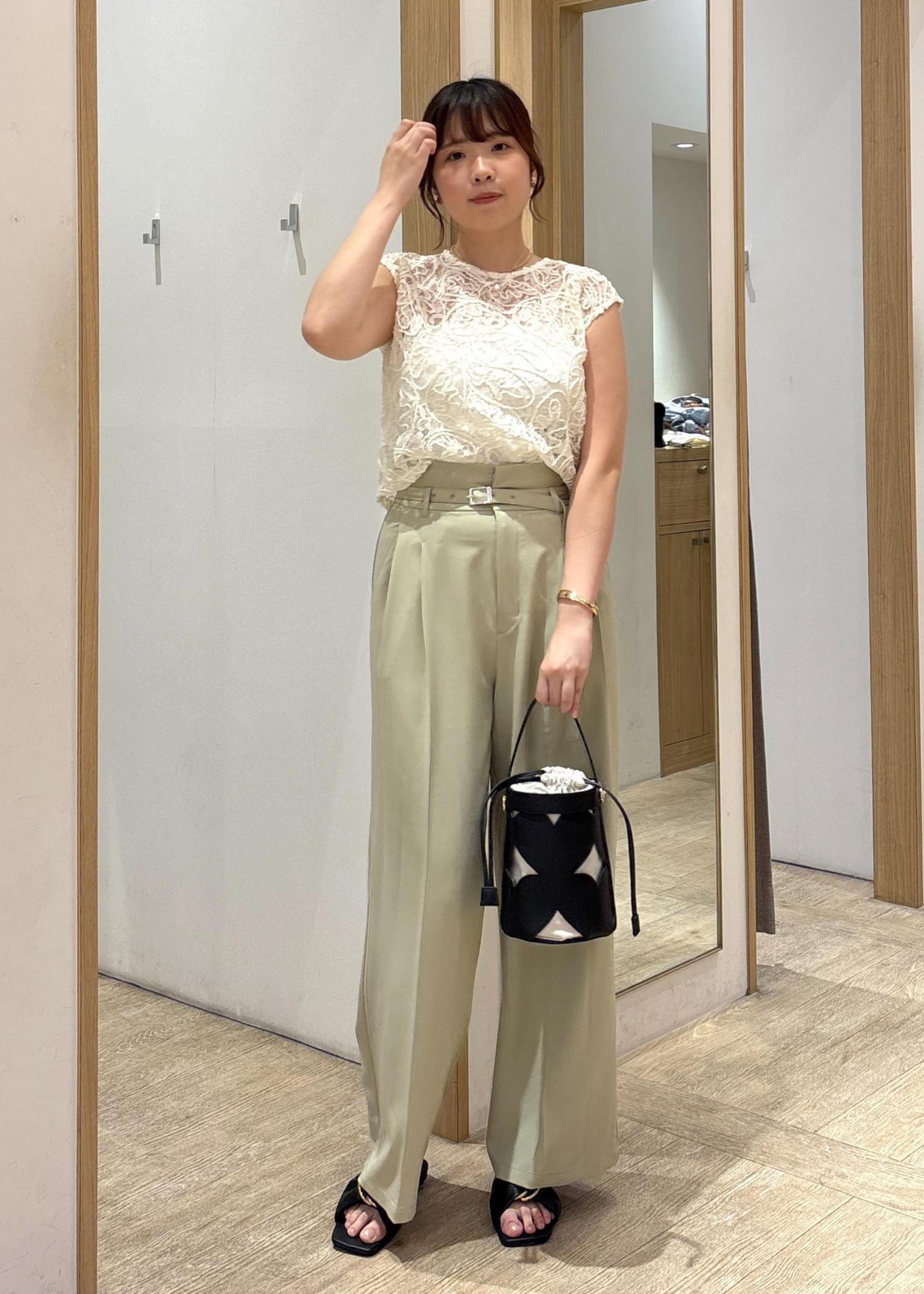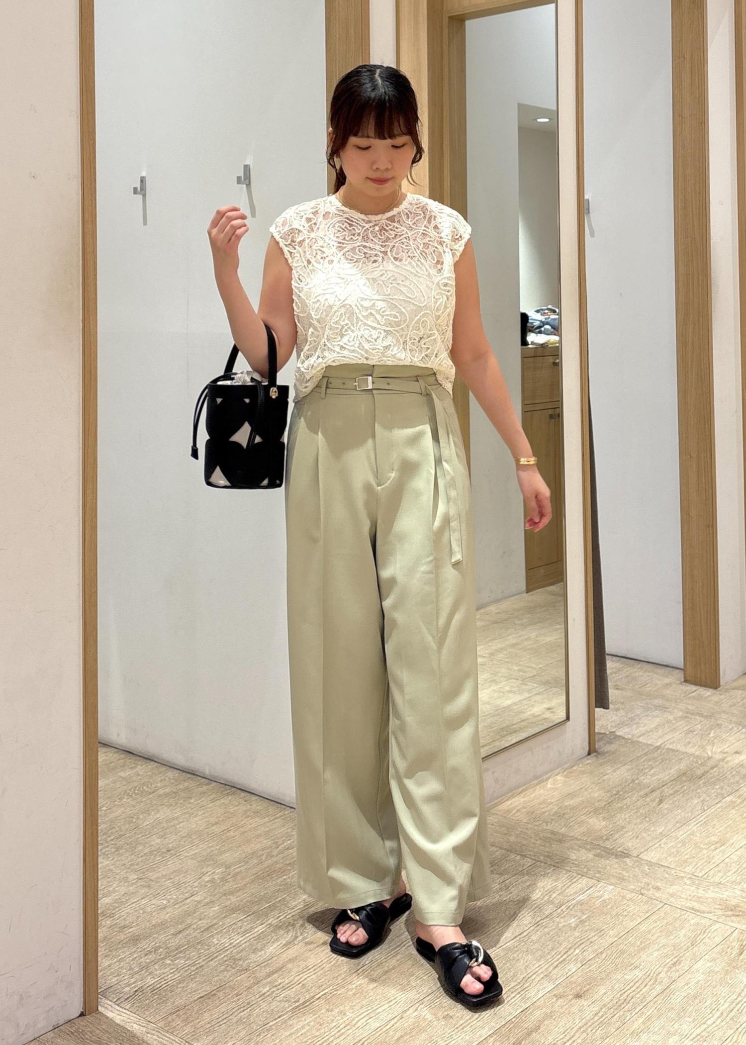 動きのあるワイドパンツと、繊細なレーストップスが涼やかで上品な印象に。サンダルやバケツバッグのモードな要素が全体を引き締め、甘くなりすぎない仕上がり。