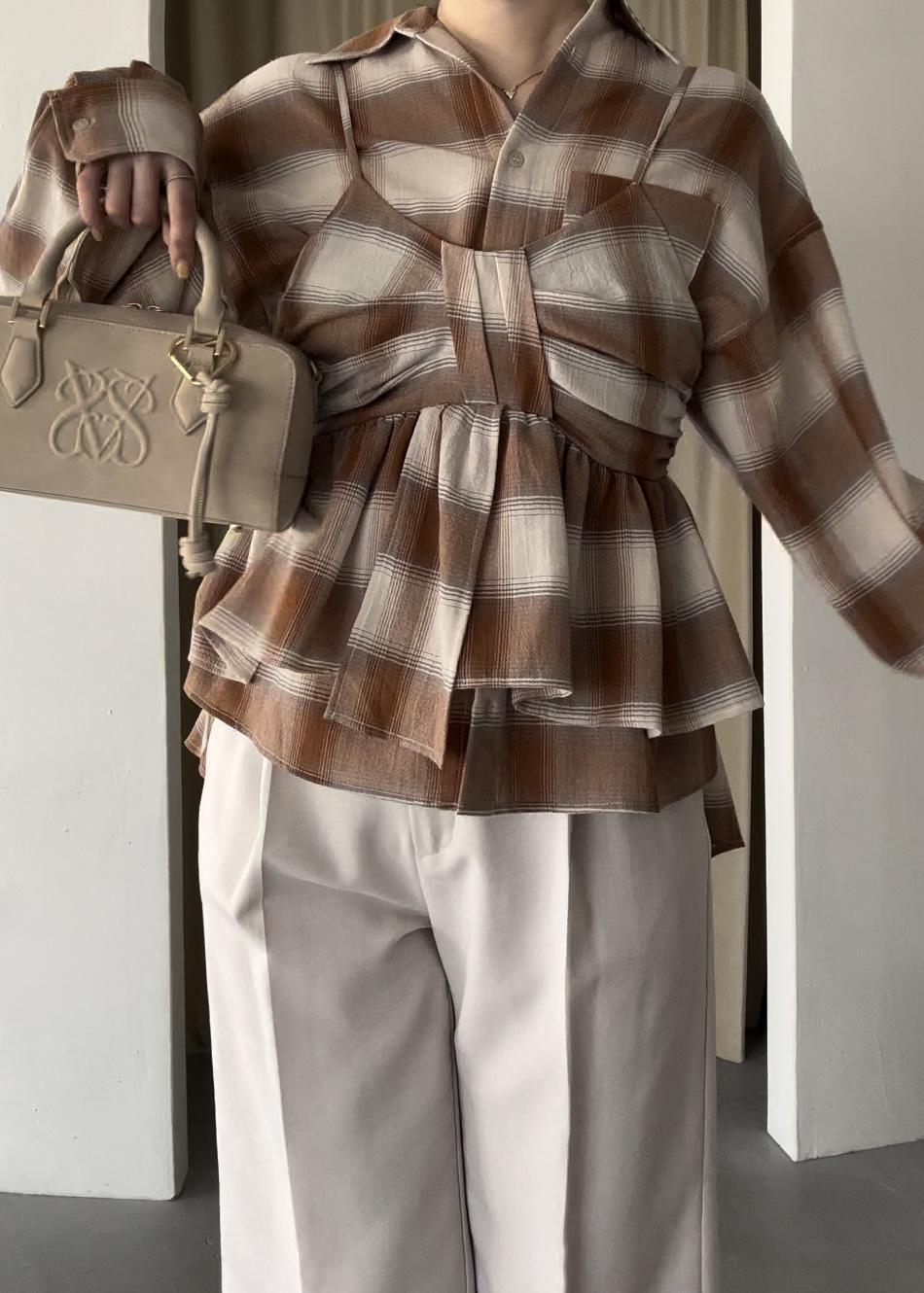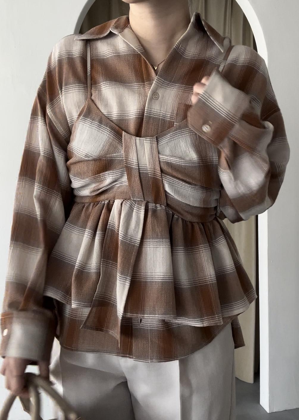 VISオンブレチェックオーバーシャツベージュ系 / F¥6,589レビュー短丈で袖や腰回りの広さがあり羽織りで使うも、しめても、セットアップ対応のビスチェと合わせても◎