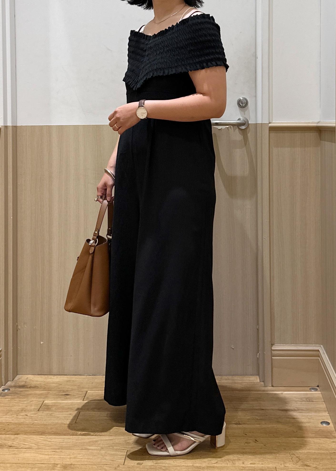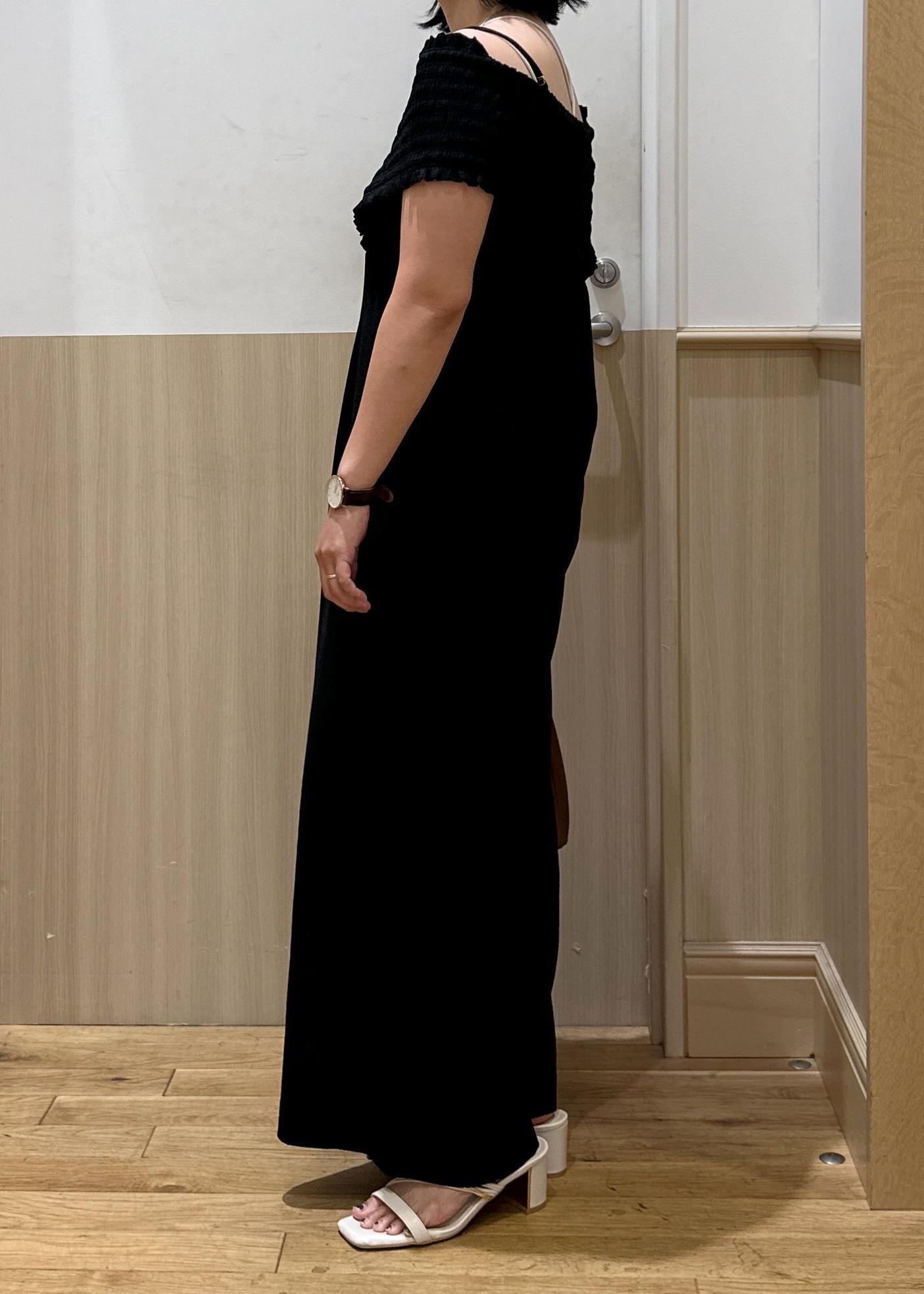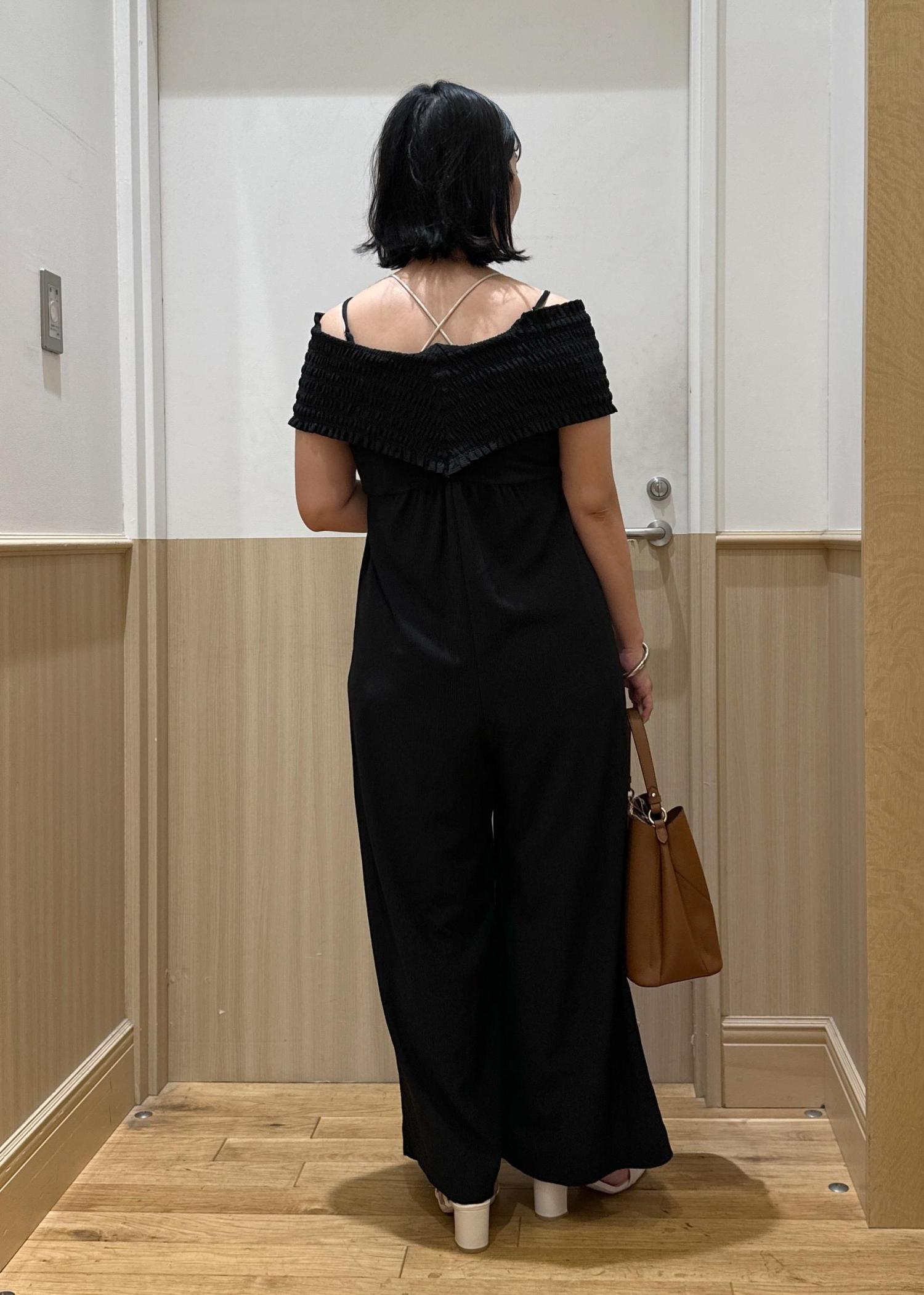 アウトレットVISシャーリングオフショルダーオールインワンブラック / F¥6,327レビュー157センチ、ヒールかスニーカーでちょうどいい丈感です!