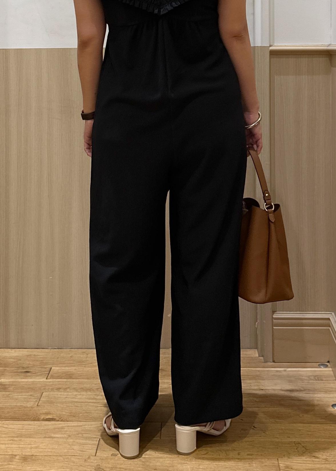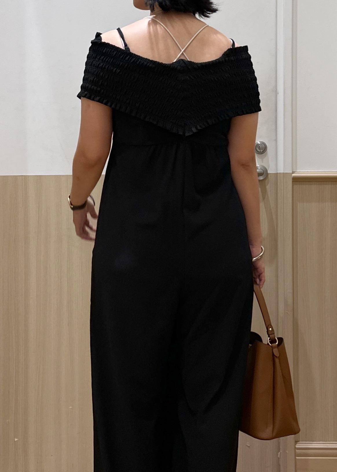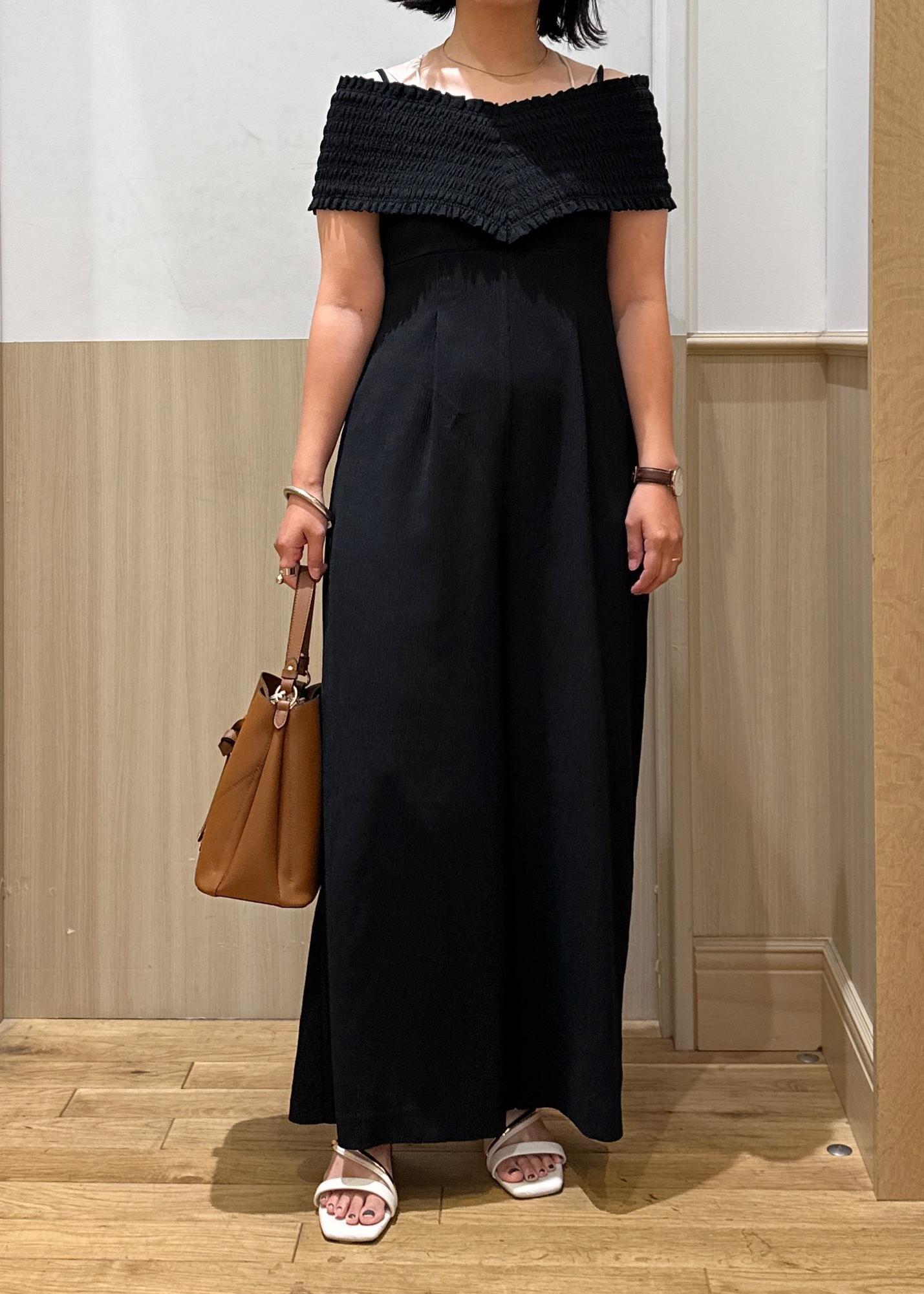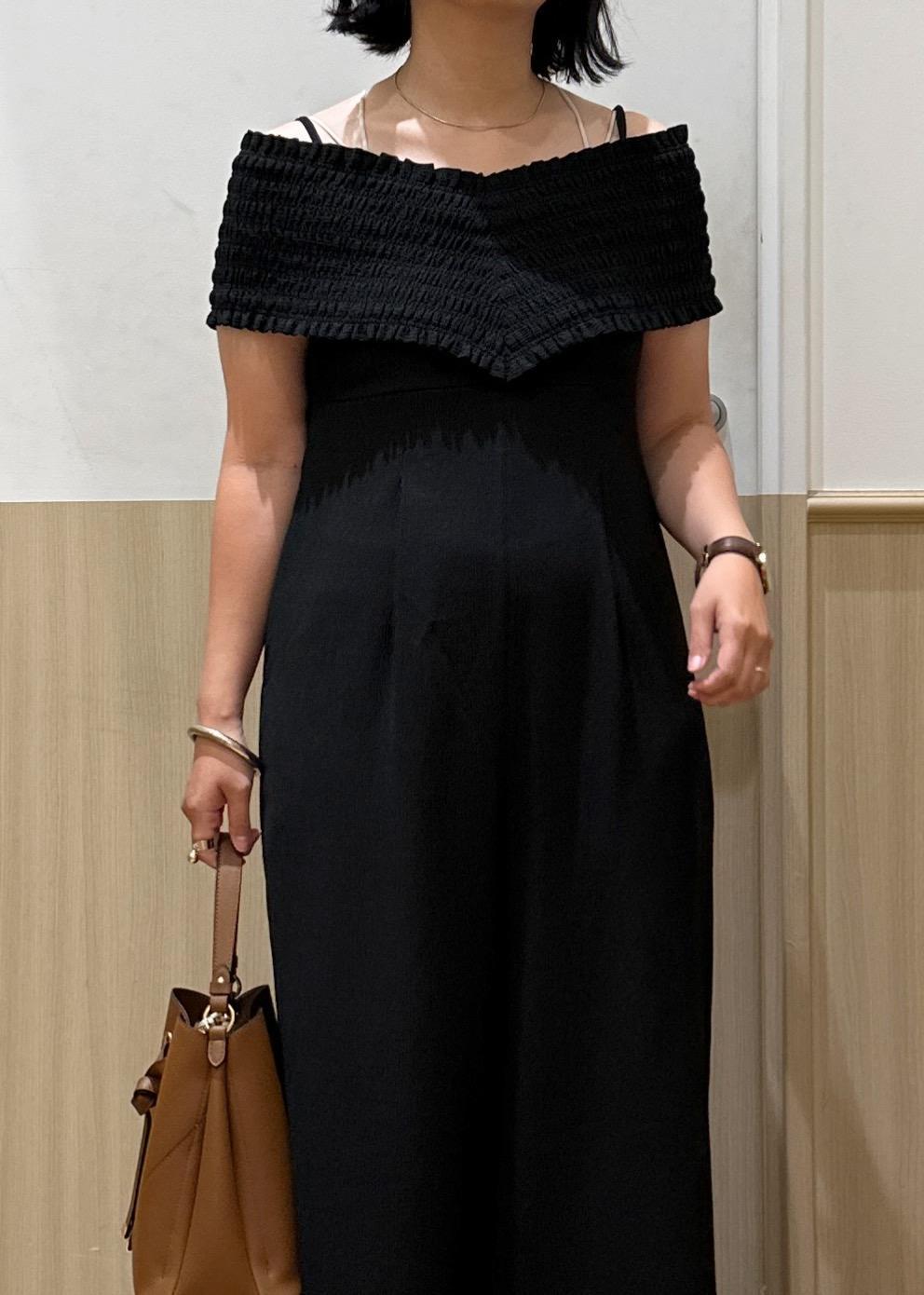 アウトレットVISシャーリングオフショルダーオールインワンブラック / F¥6,327レビュー157センチ、ヒールかスニーカーでちょうどいい丈感です!