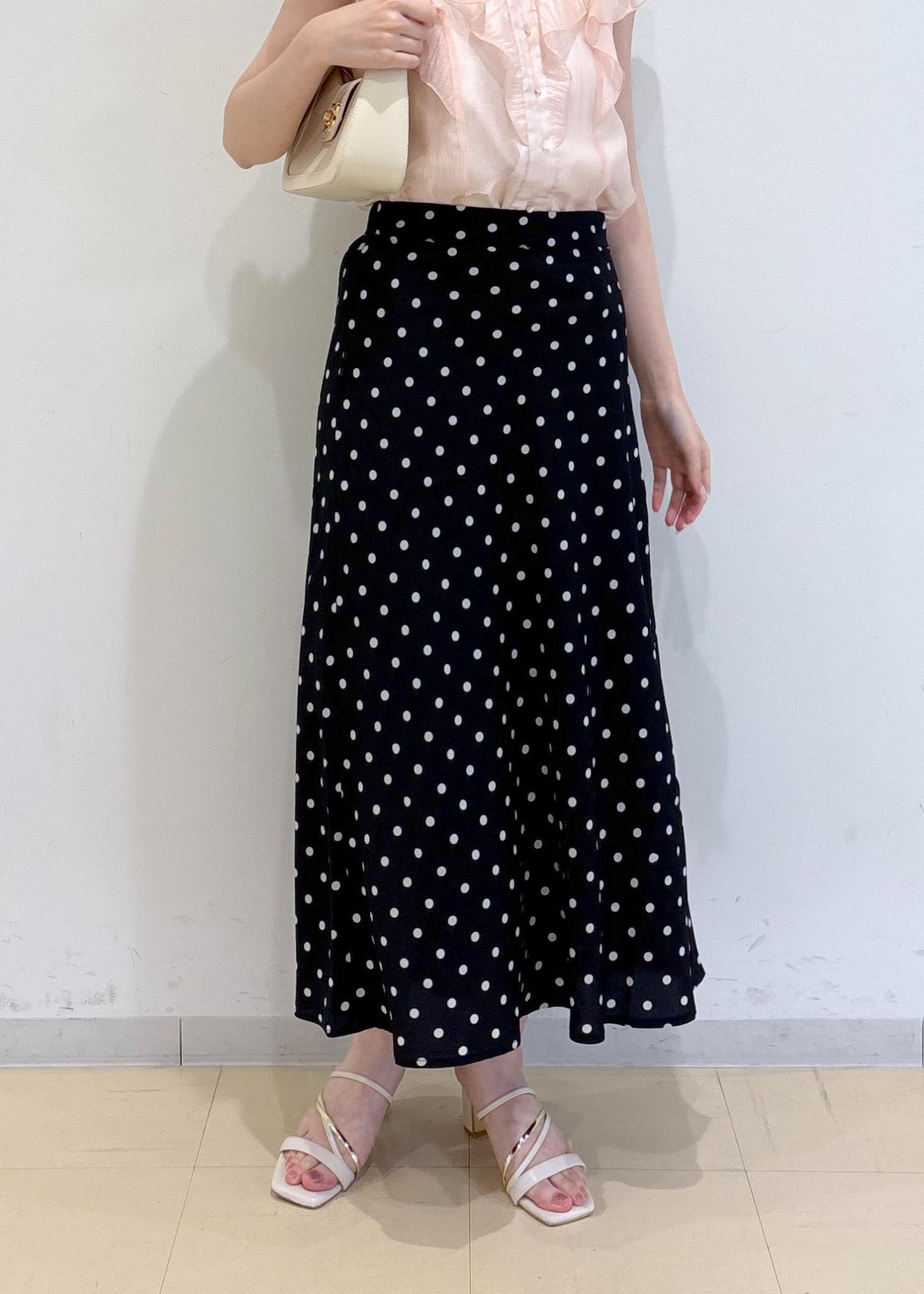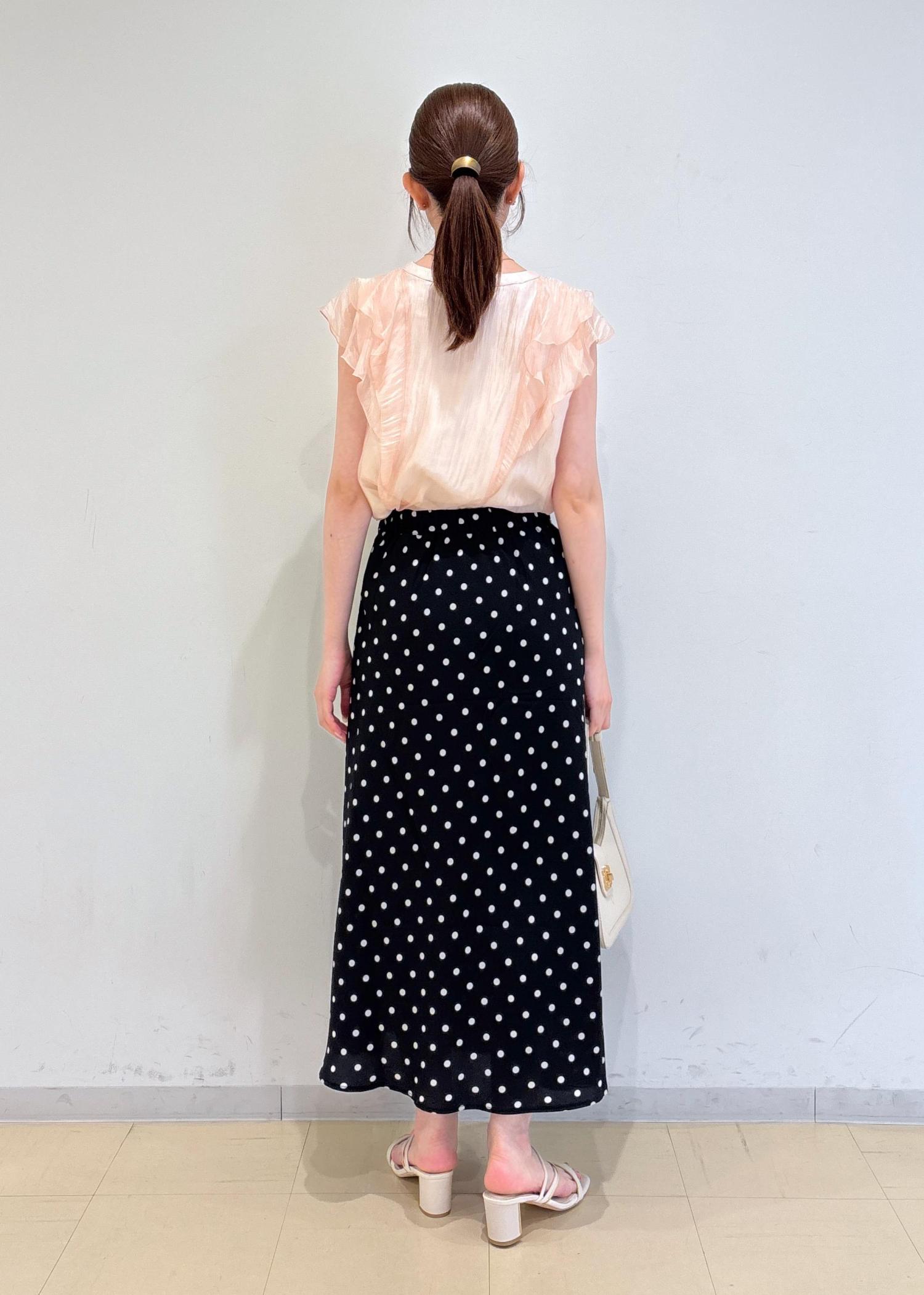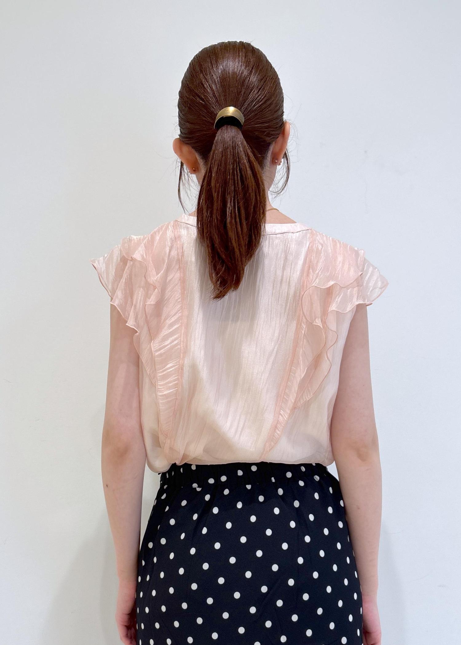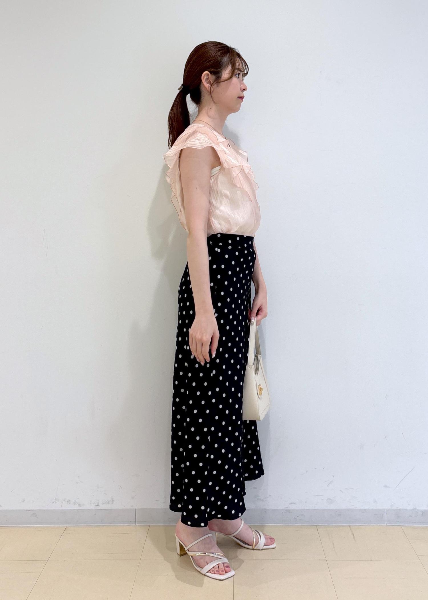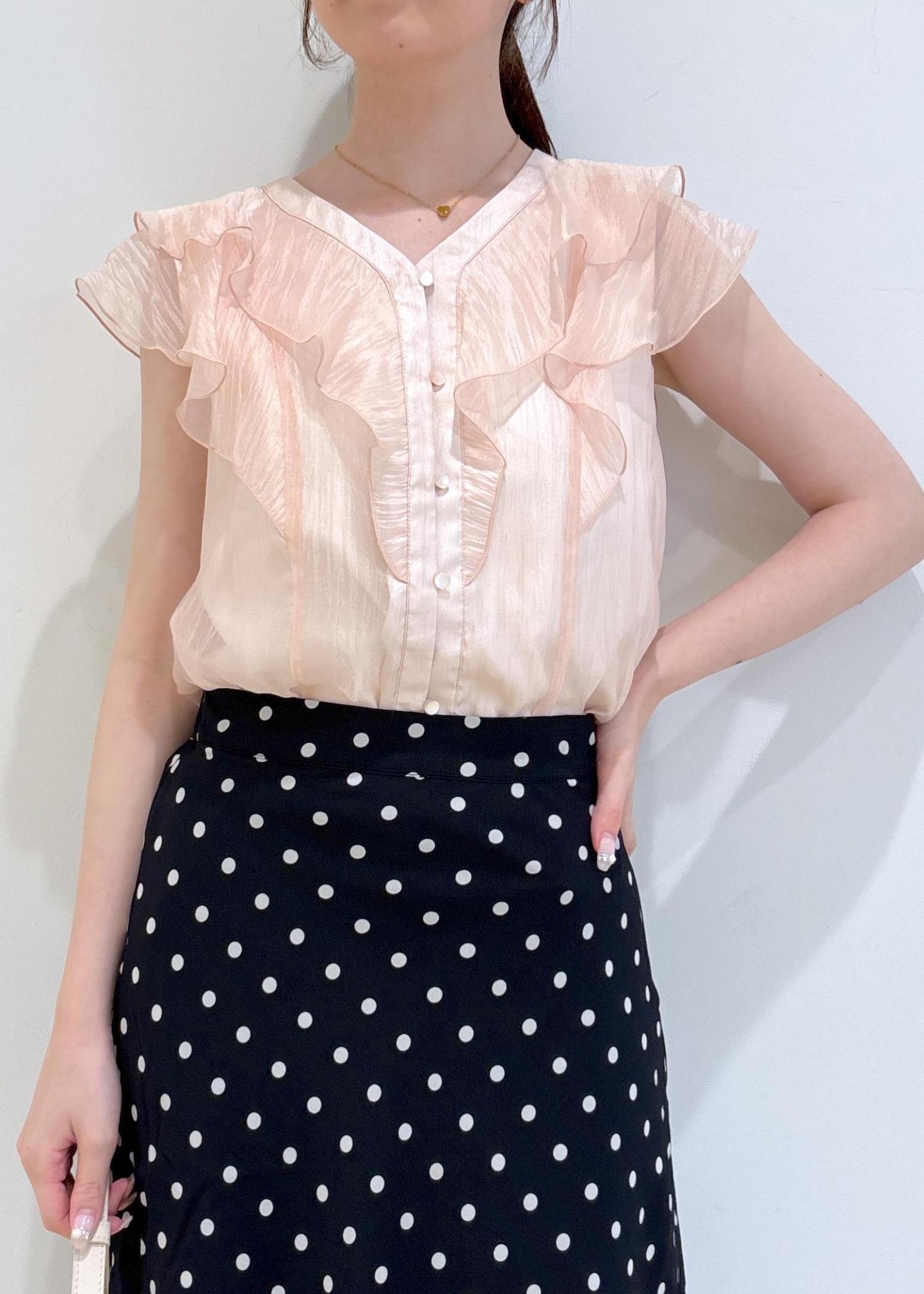 ブラウスのツヤ感と程よいフリルが可愛いポイント♪