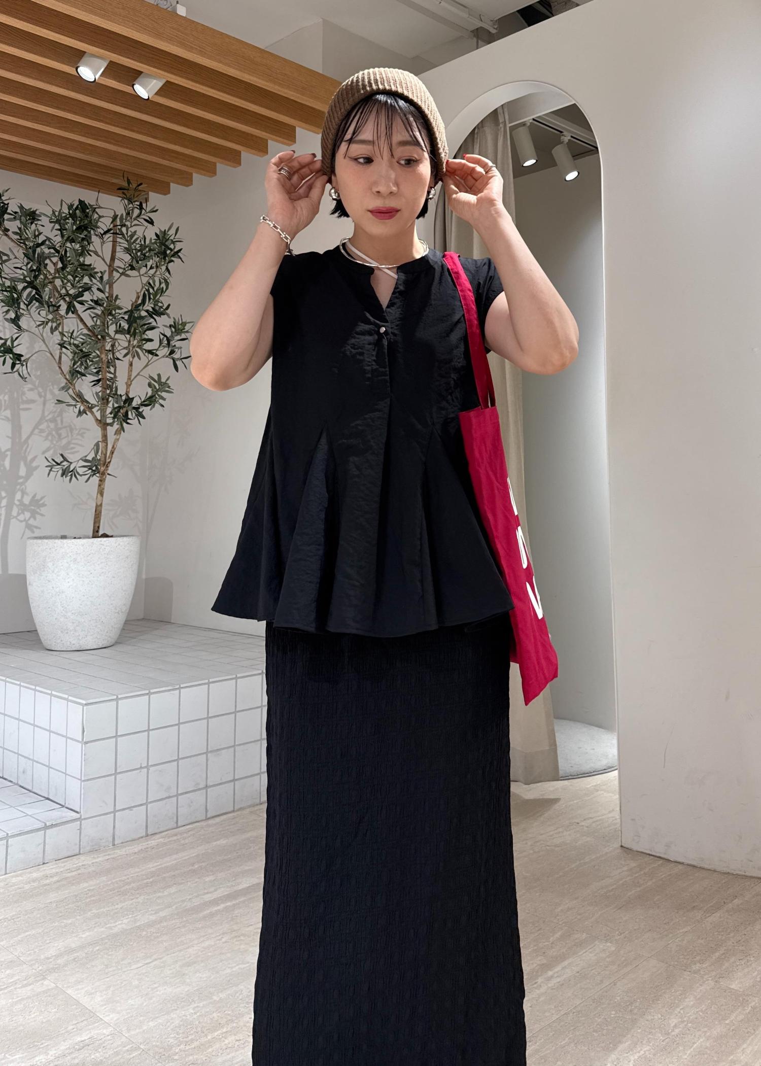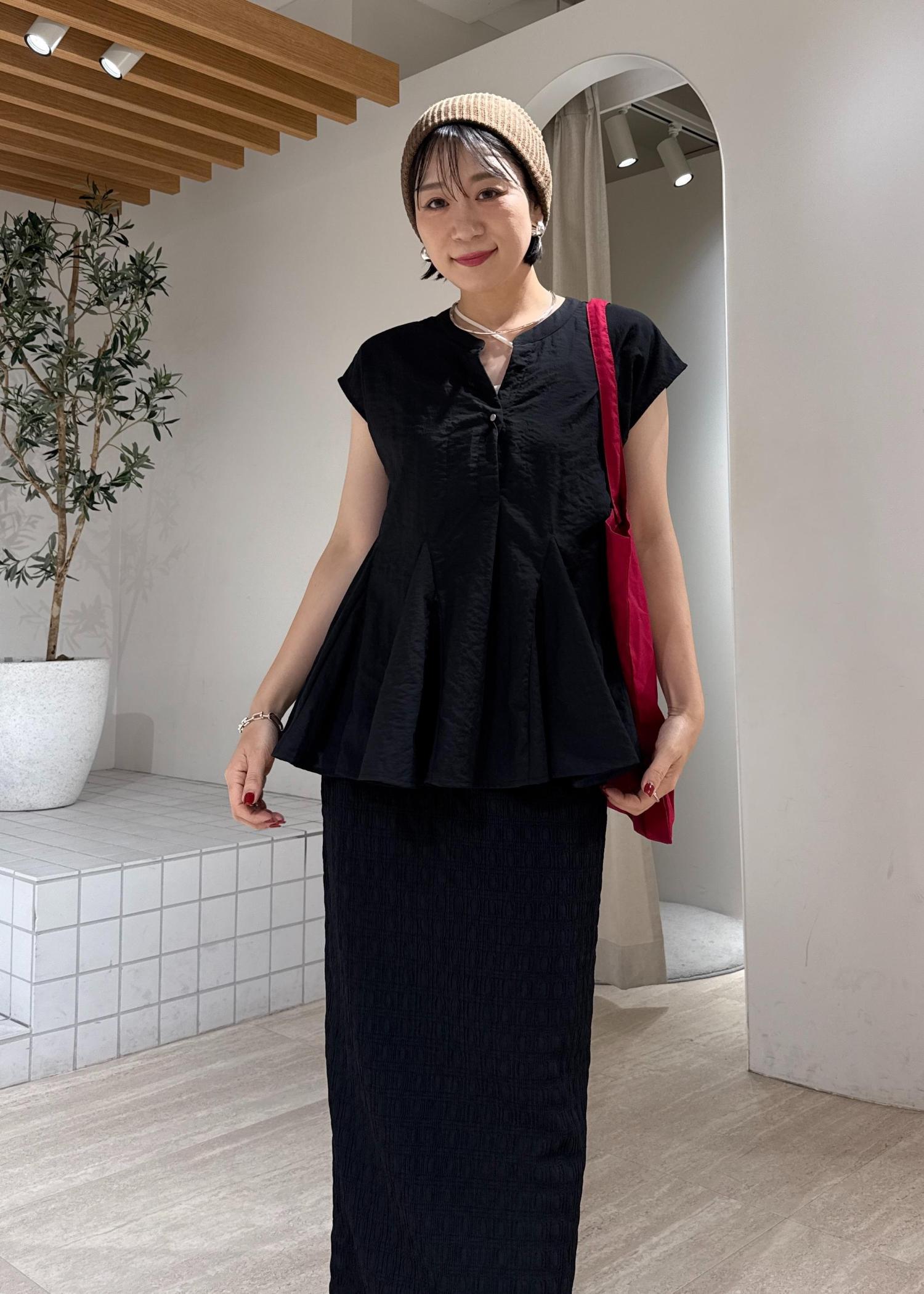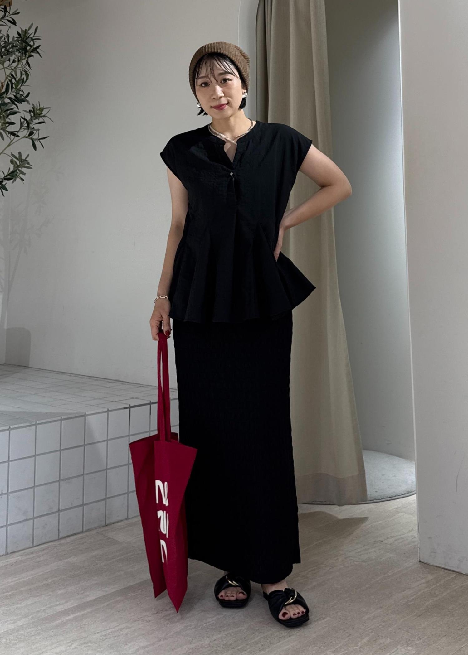 サラッと涼しいブラウスを使ってブラックワントーンコーデに♪所々の肌見せで重たくならない印象にしてます◎