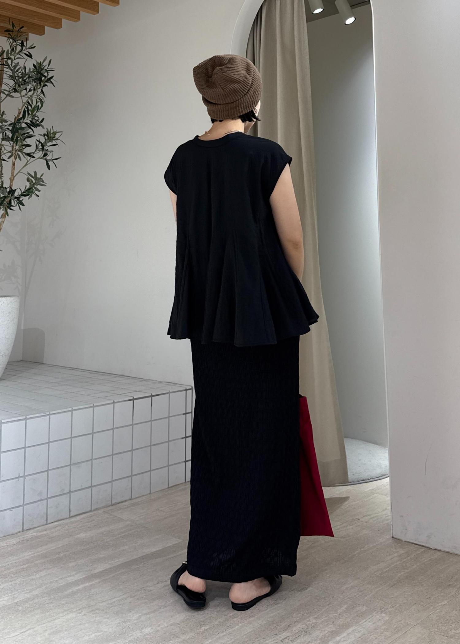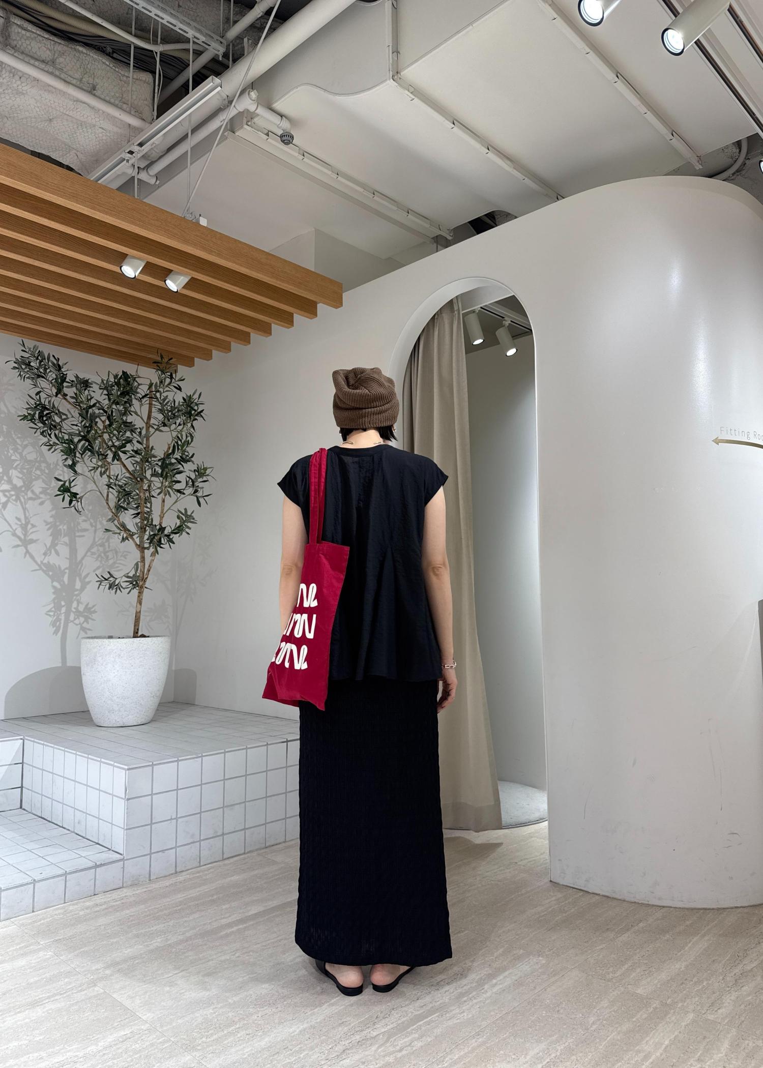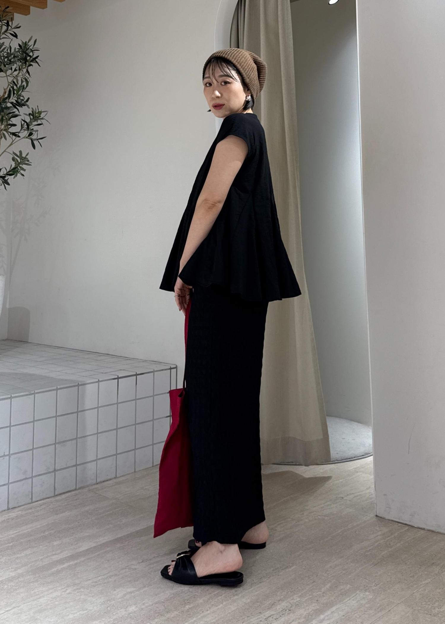 サラッと涼しいブラウスを使ってブラックワントーンコーデに♪所々の肌見せで重たくならない印象にしてます◎