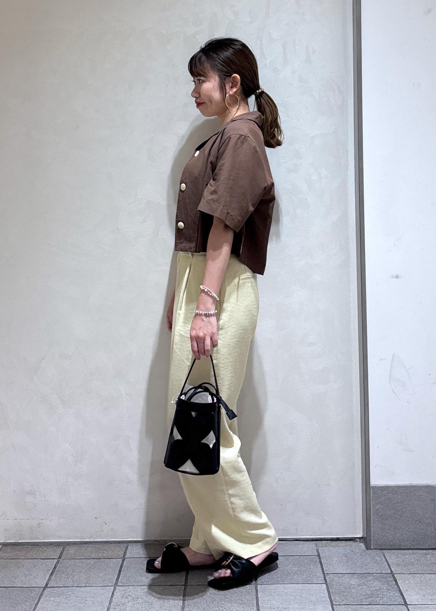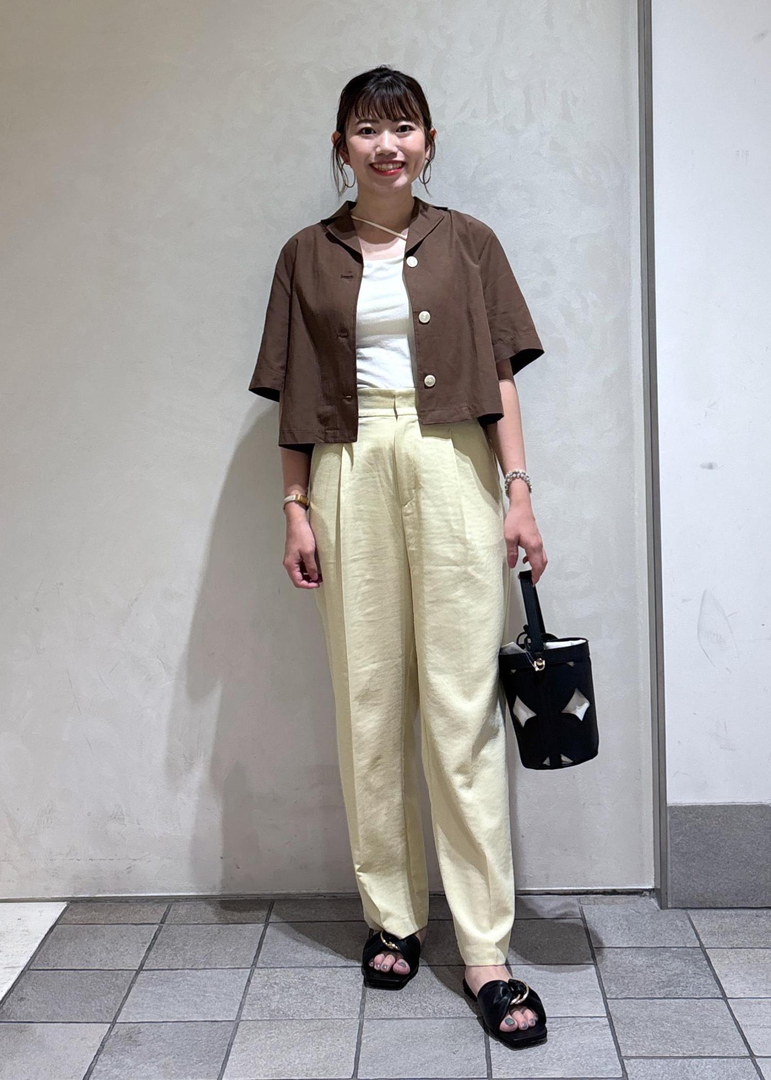brown shirt × yellow wide pants