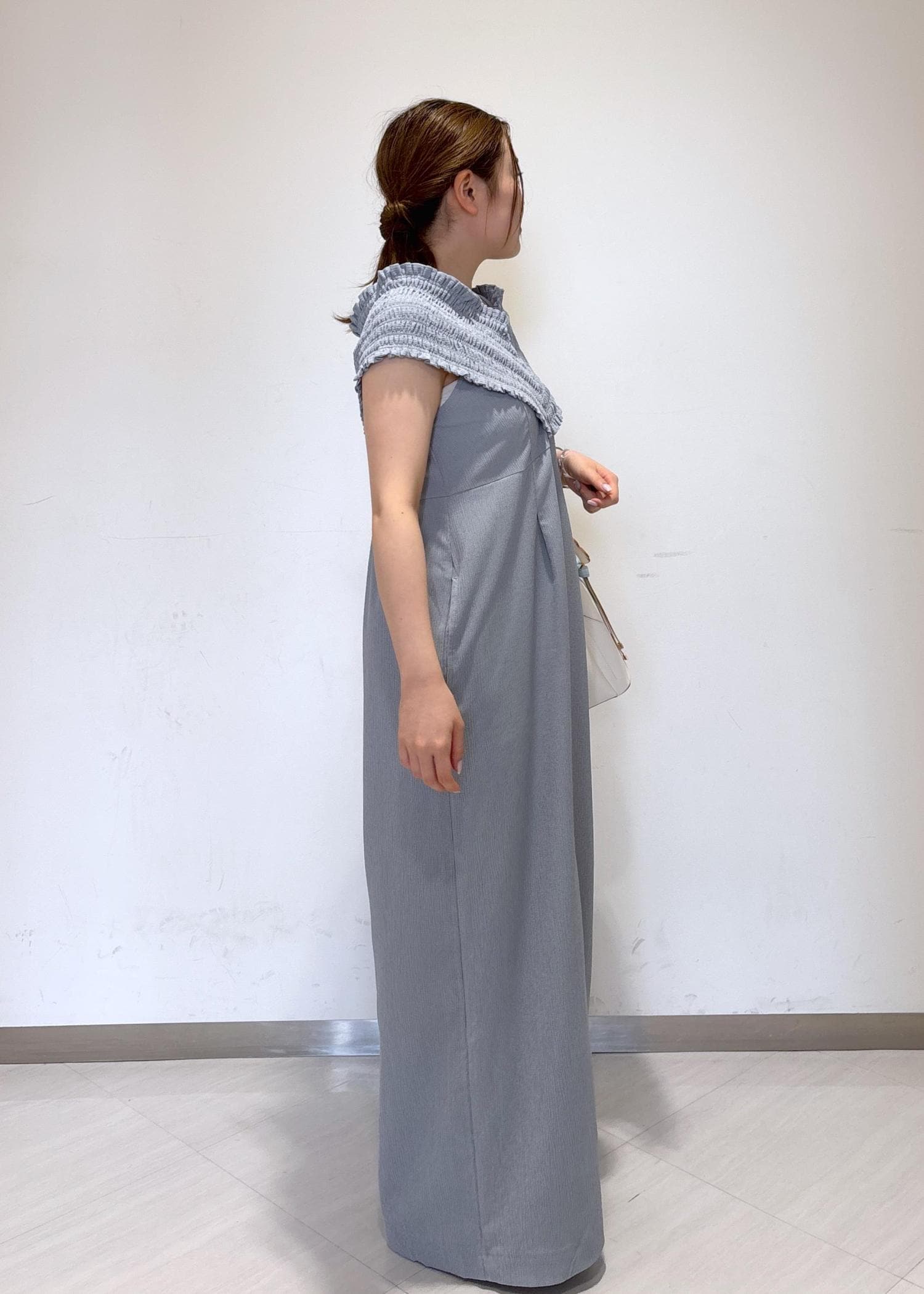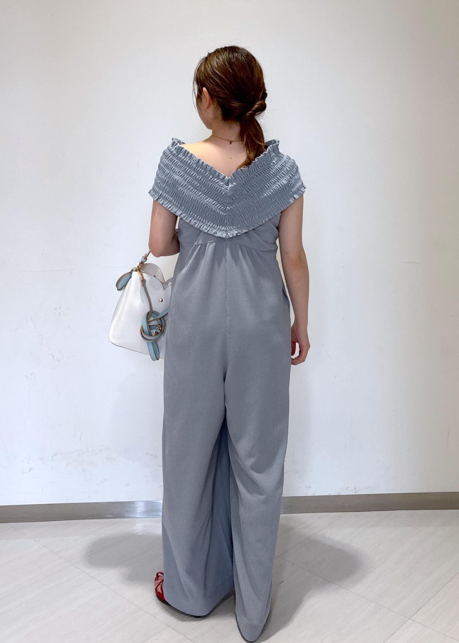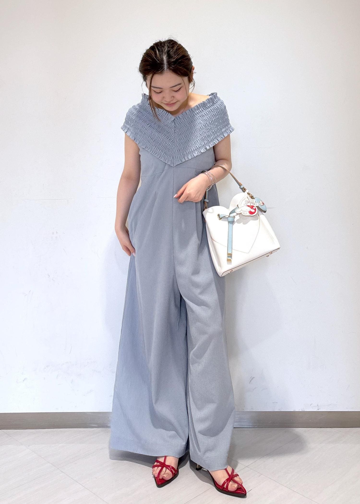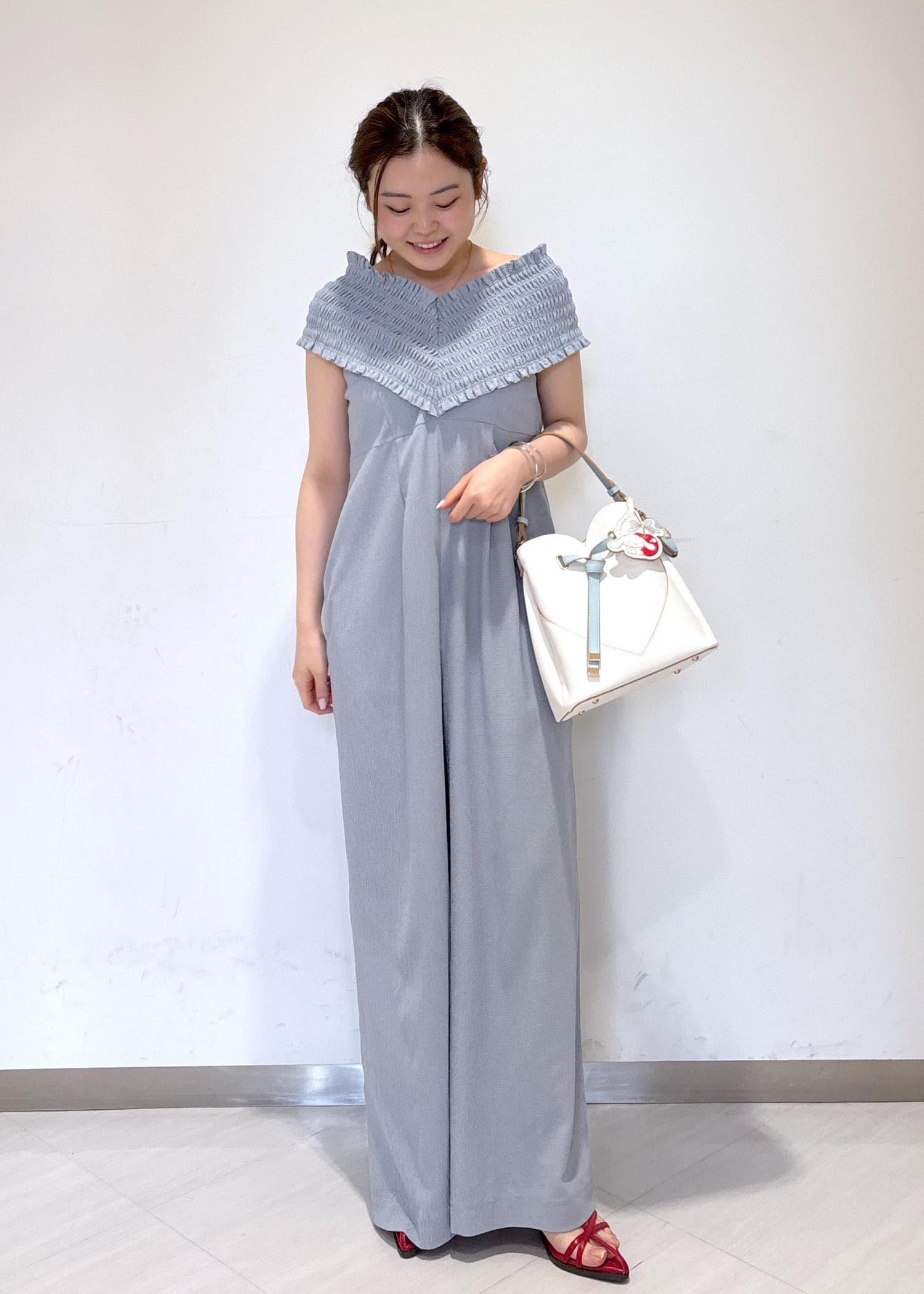 アウトレットVISシャーリングオフショルダーオールインワンブルー系 / F¥6,327レビュー身長150センチで、ヒール合わせで床につかない丈感です。写真では4.5センチヒールと合わせています