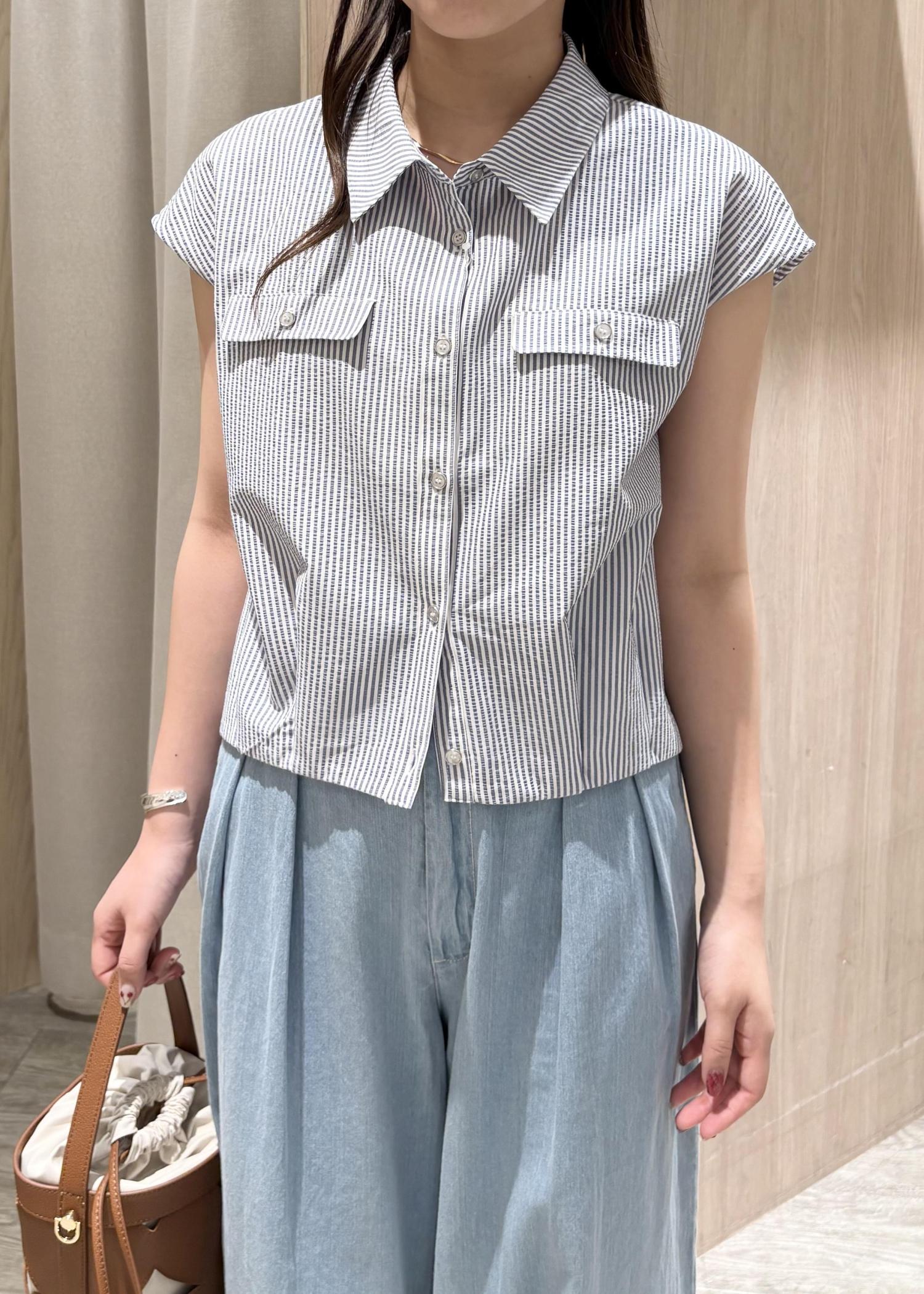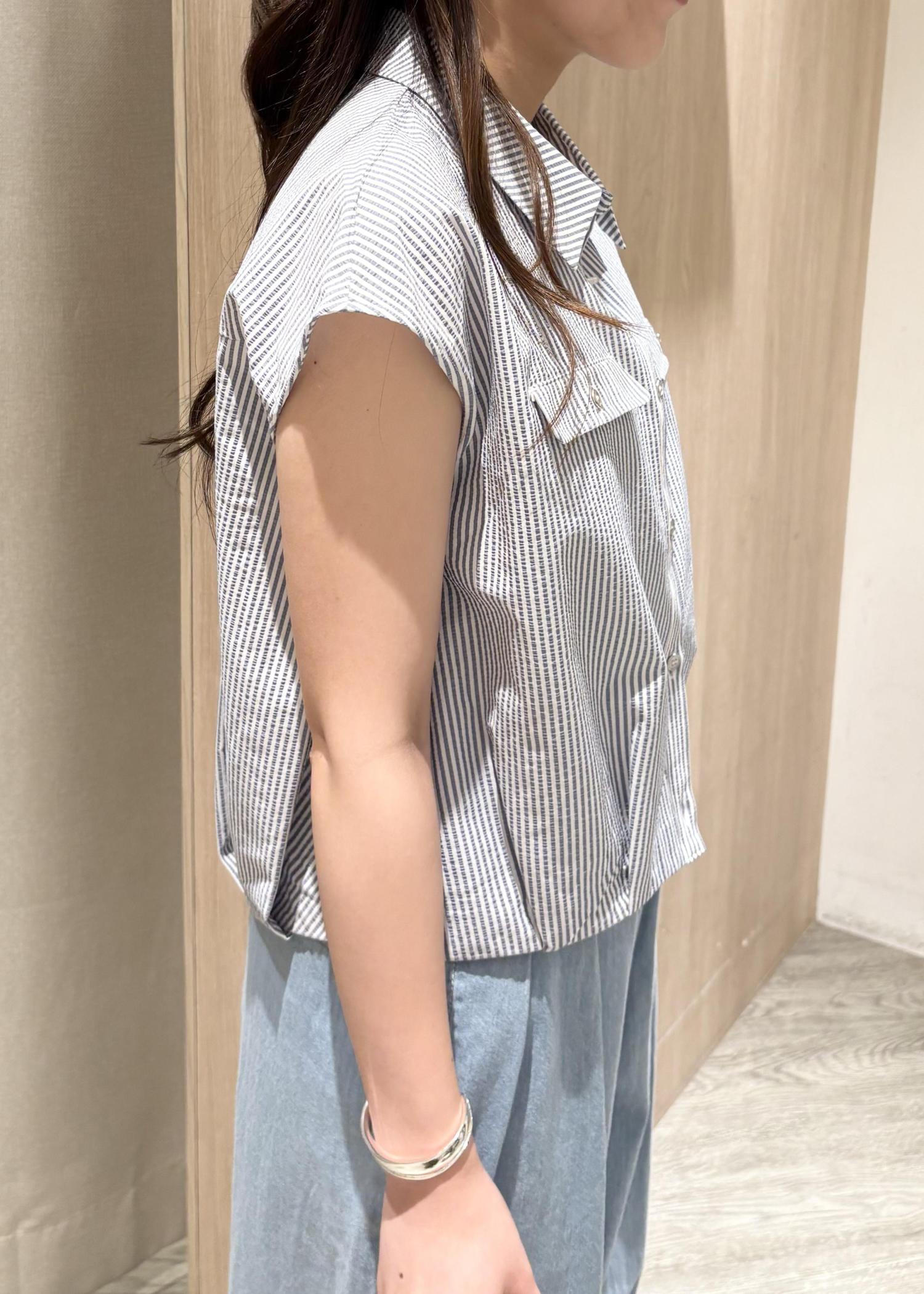 VIS【UVケア/洗える】フレンチスリーブサッカーブラウスブルー系 / F¥4,389レビュー短丈のデザインです。身長152センチでおへそ下くらいの長さでした。袖周りもスッキリしていて身幅もジャストサイズくらいのため、小柄な方にもオススメです。