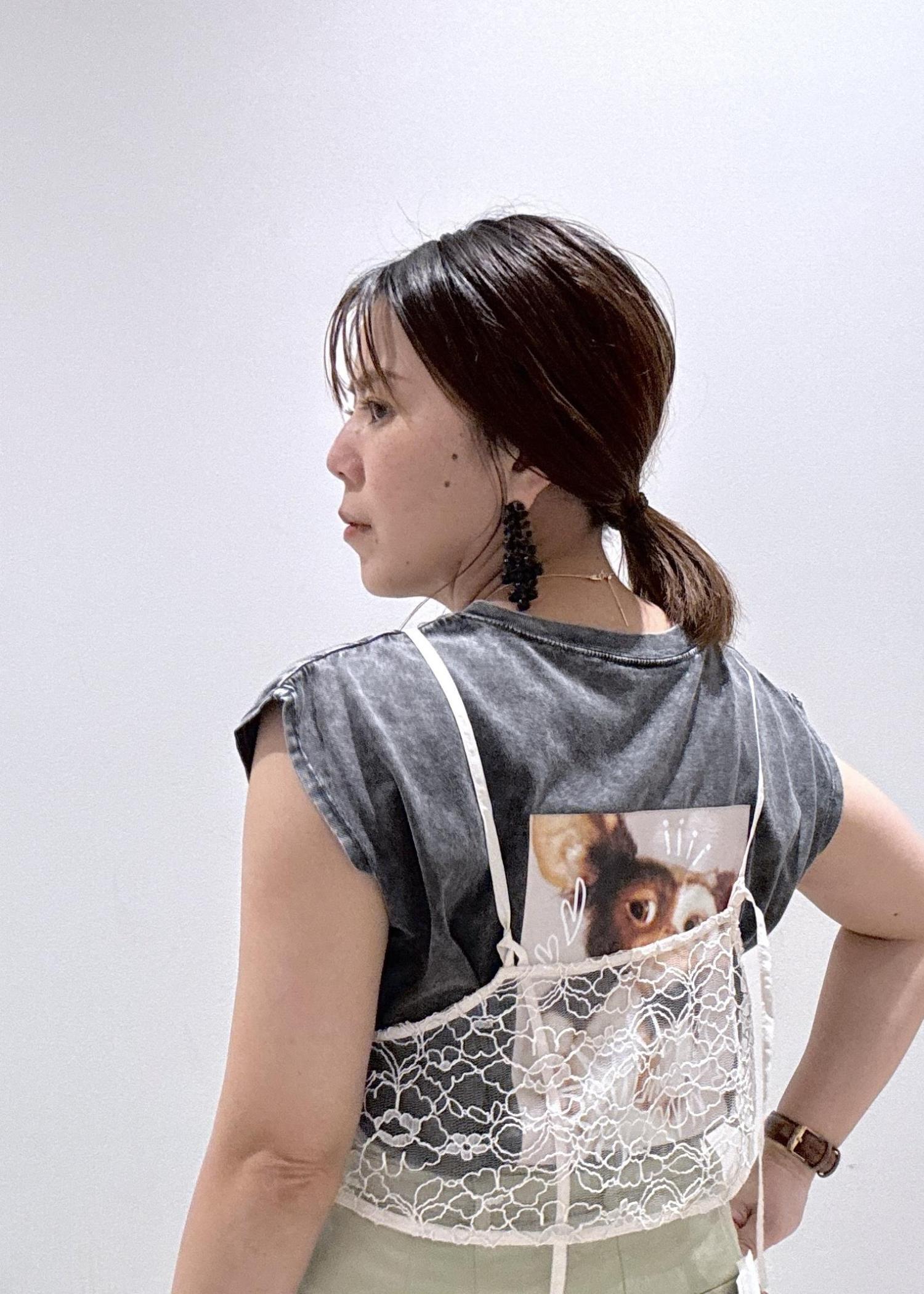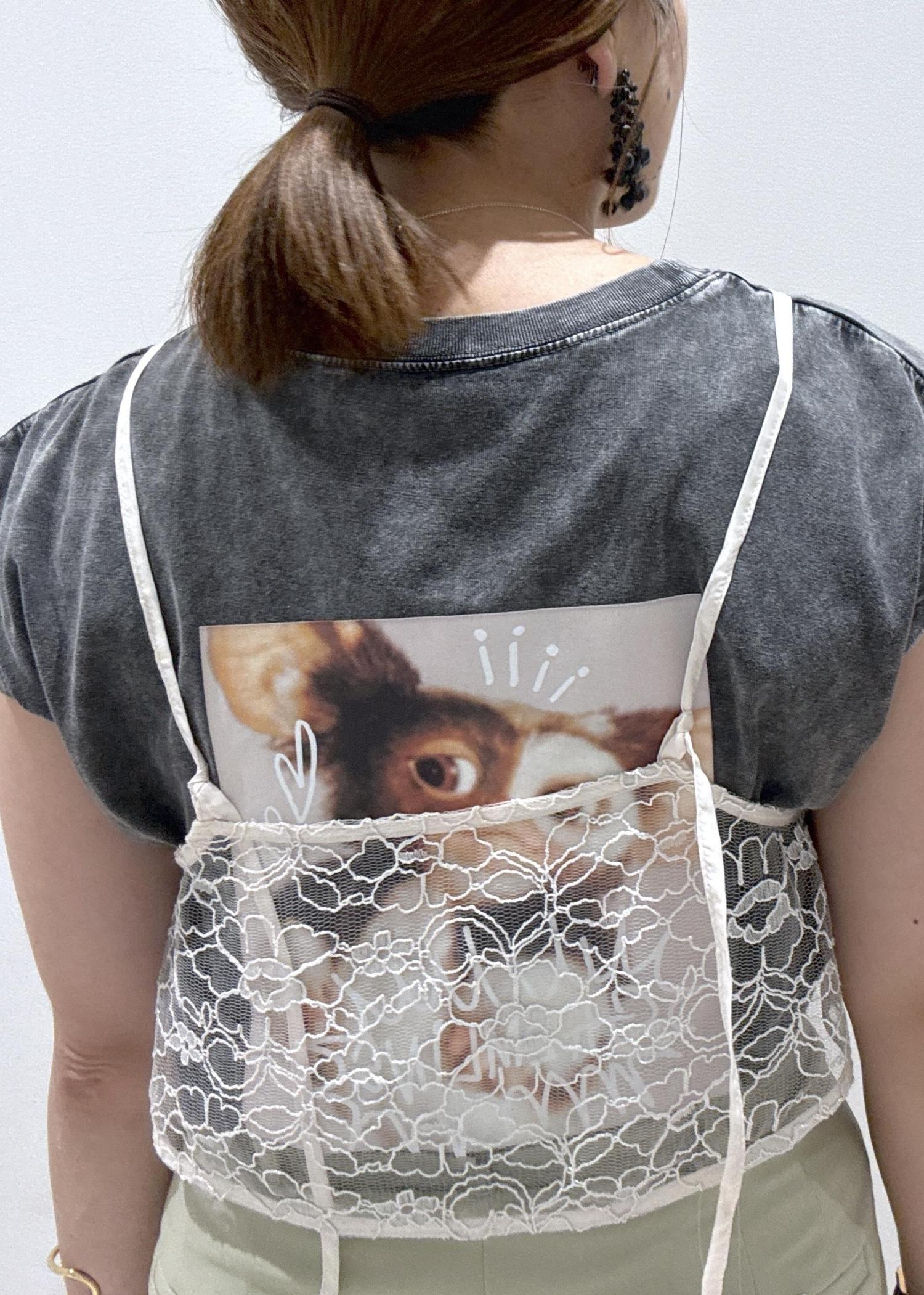 愛らしいギズモがバックプリントに施された大人も着やすいフレンチスリーブTシャツはビンテージ加工されており古着の様な風合いを楽しめます。