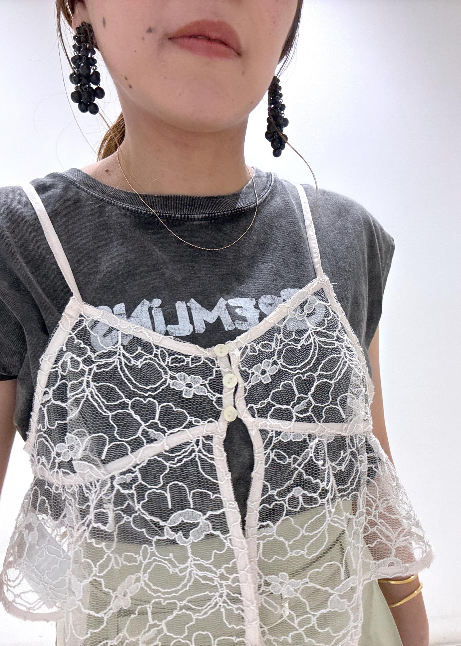 コードレース刺繍のキャミビスチェはレイヤードスタイルにおすすめ。
