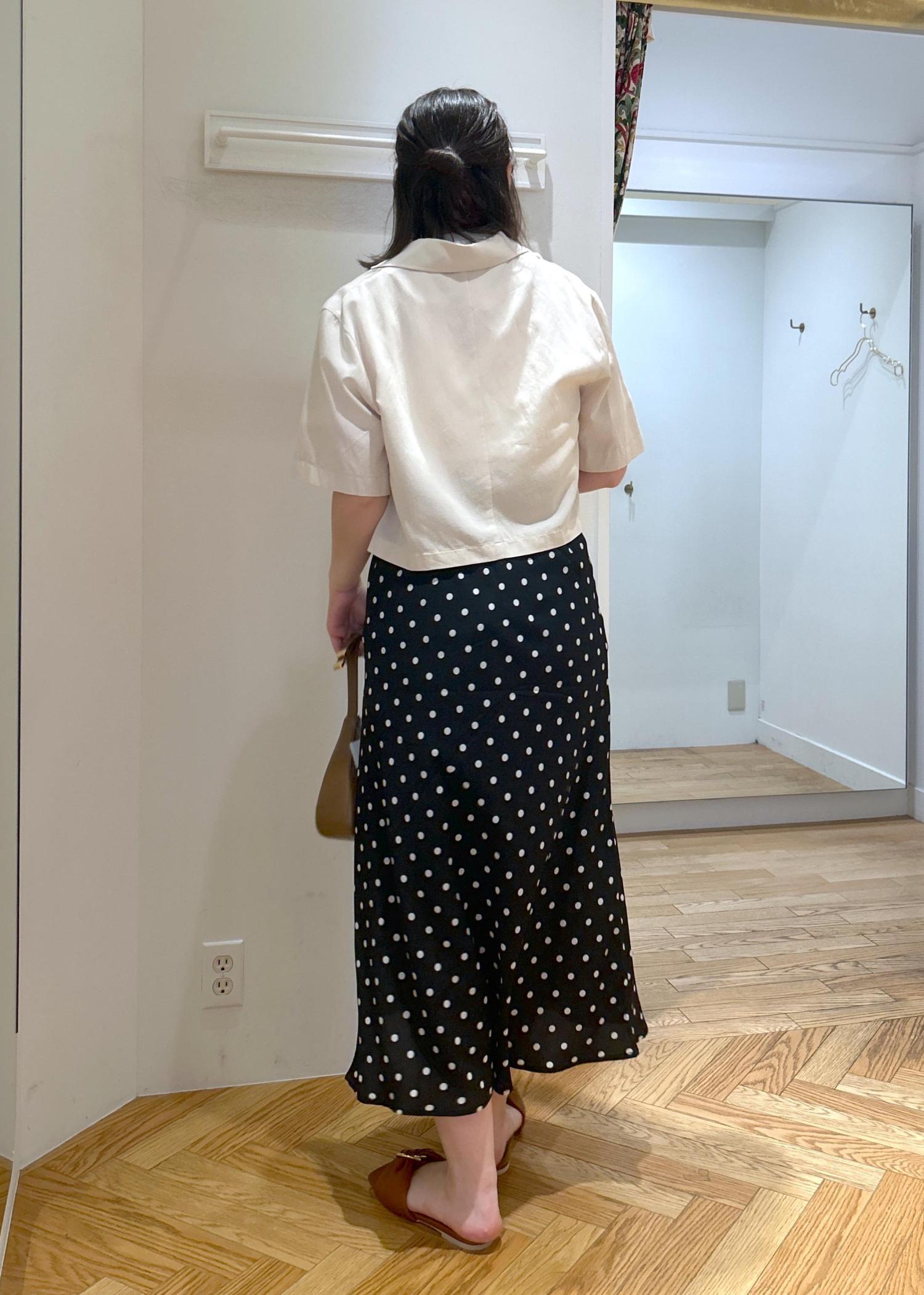 カジュアルになりがちなTシャツをドットのスカート合わせでレディライクに着てみました!