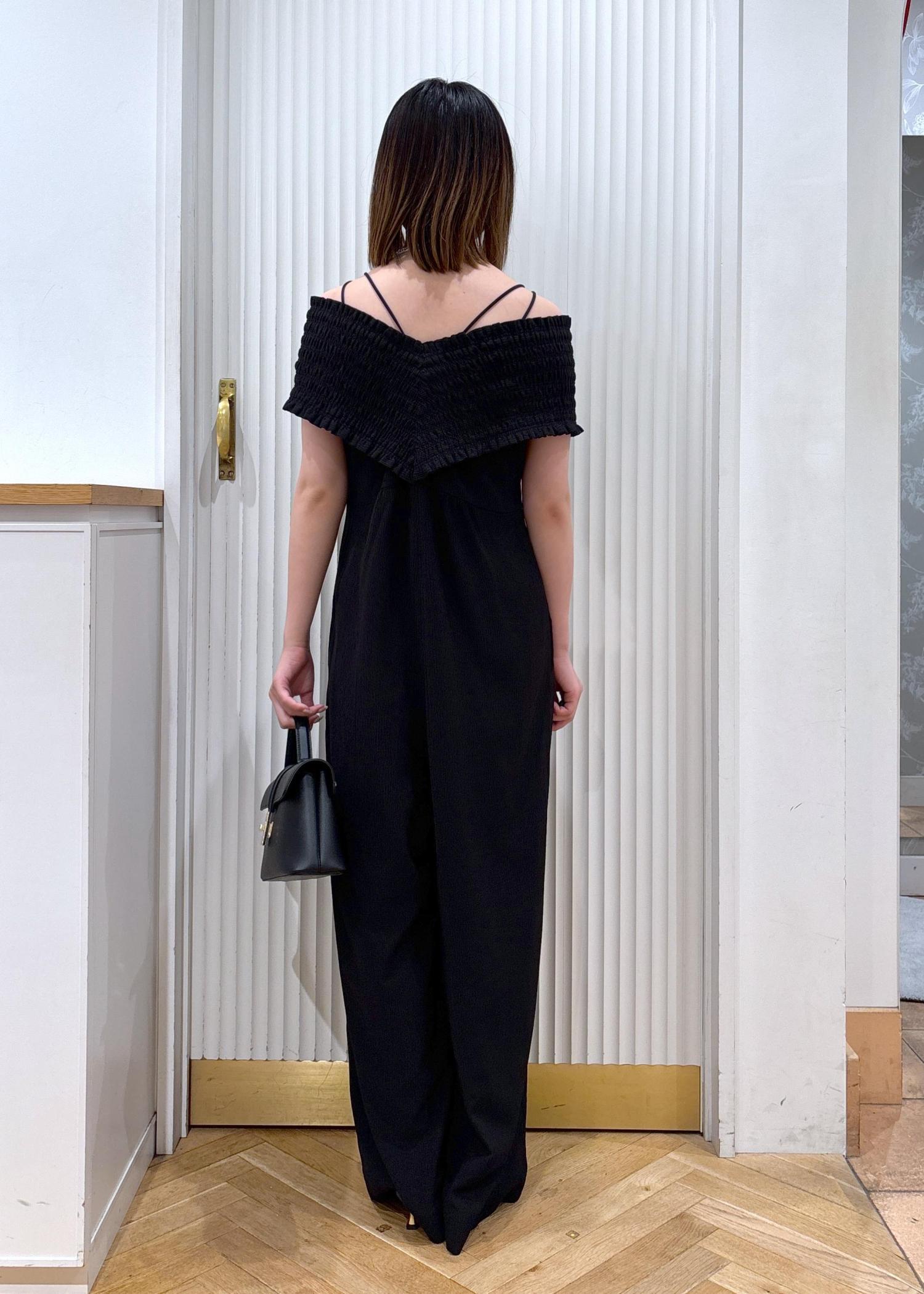 アウトレットVISシャーリングオフショルダーオールインワンブラック / F¥6,327レビュー153センチで、ヒールを合わせて履ける丈でした。
