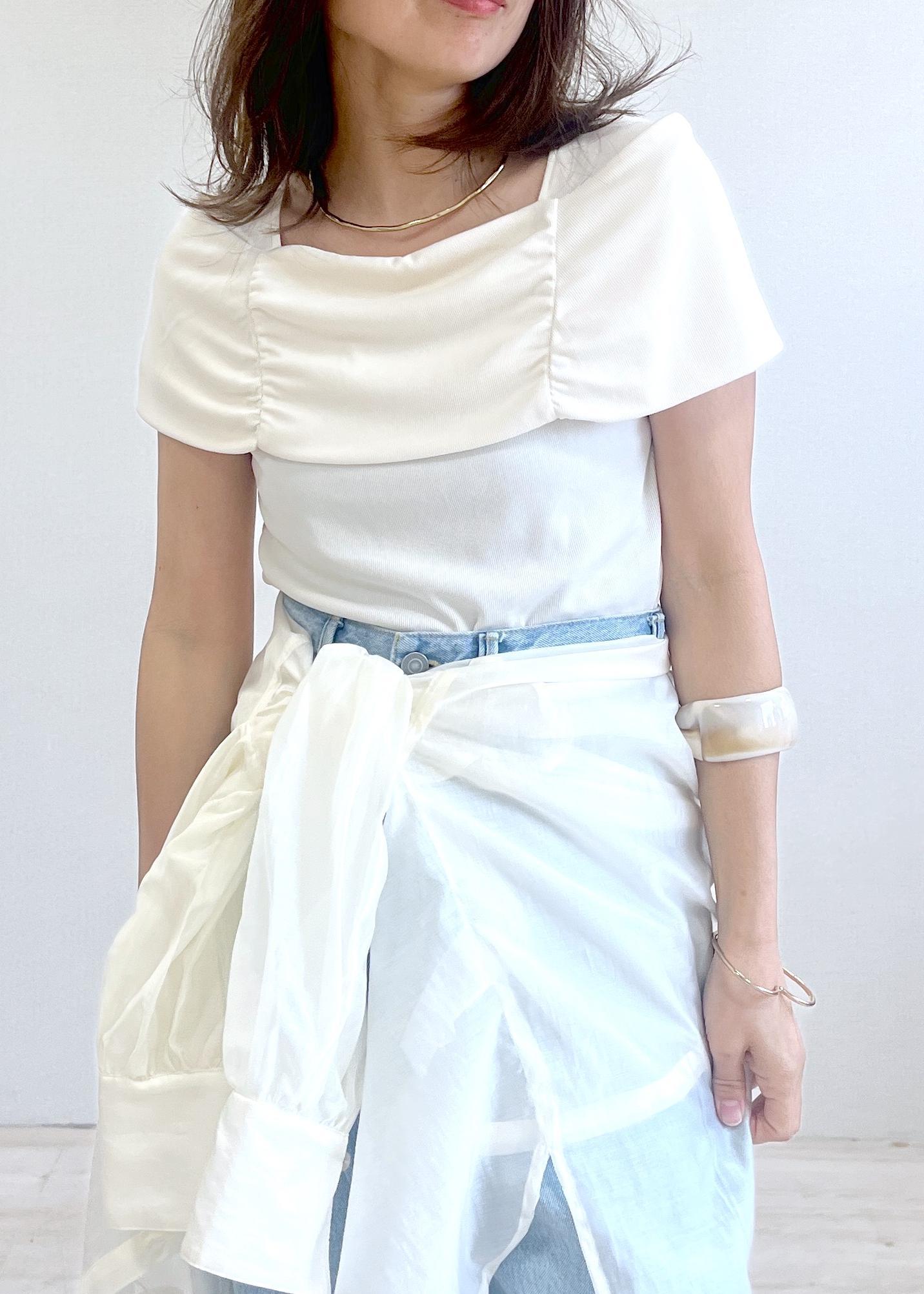 VISオフショルダーテレコカットソープルオーバーオフホワイト / F¥4,389レビュー152cmでFサイズ着用し、着丈は腰にかかるくらいのやや長め丈。IN、OUTどちらのスタイリングにもお勧めです。収縮性のある素材感で、身体のラインを拾いすぎない細身シルエットがとってもキレイ♫手をあげたりしてもズレにくいデザインなのも嬉しいポイントです。