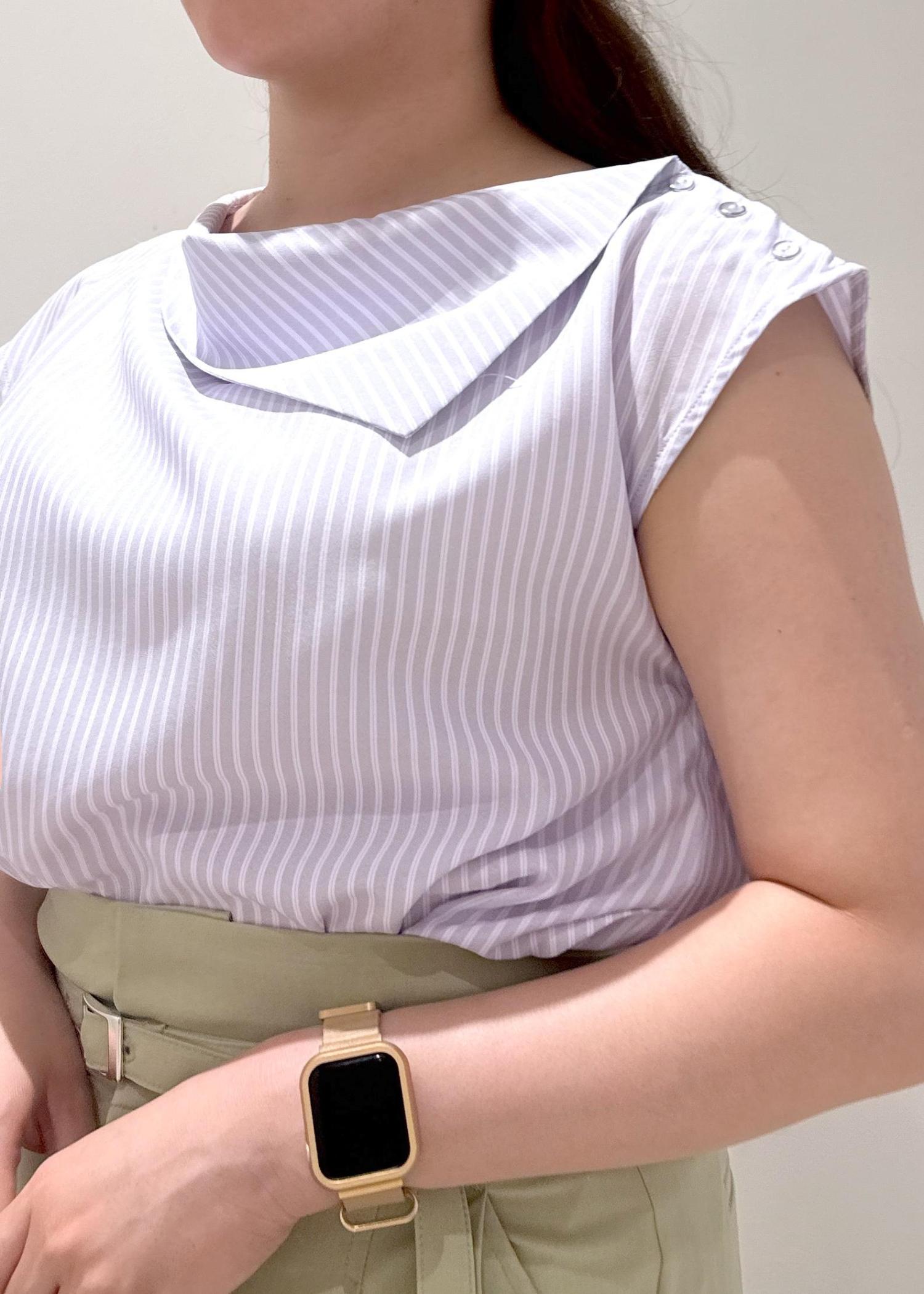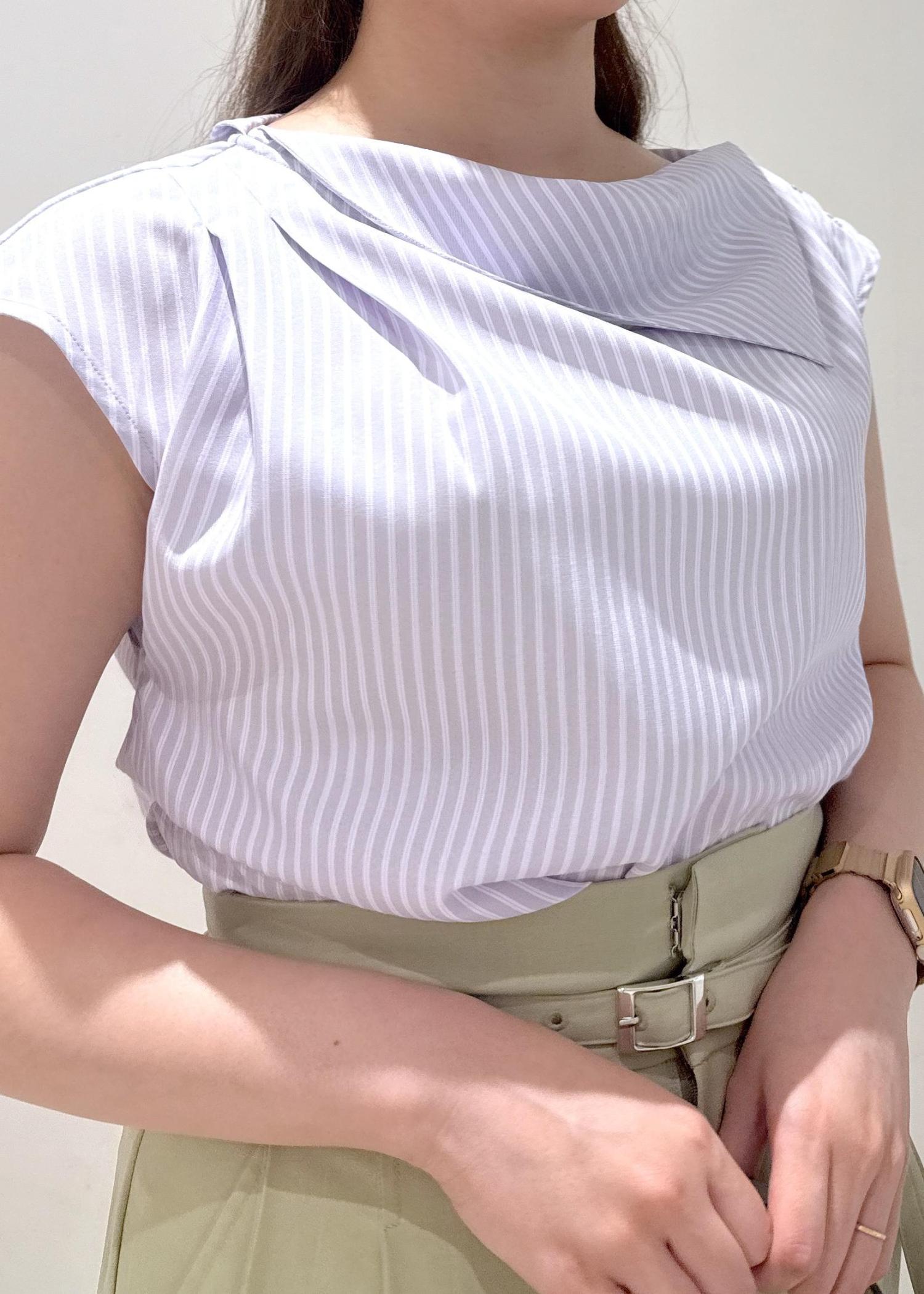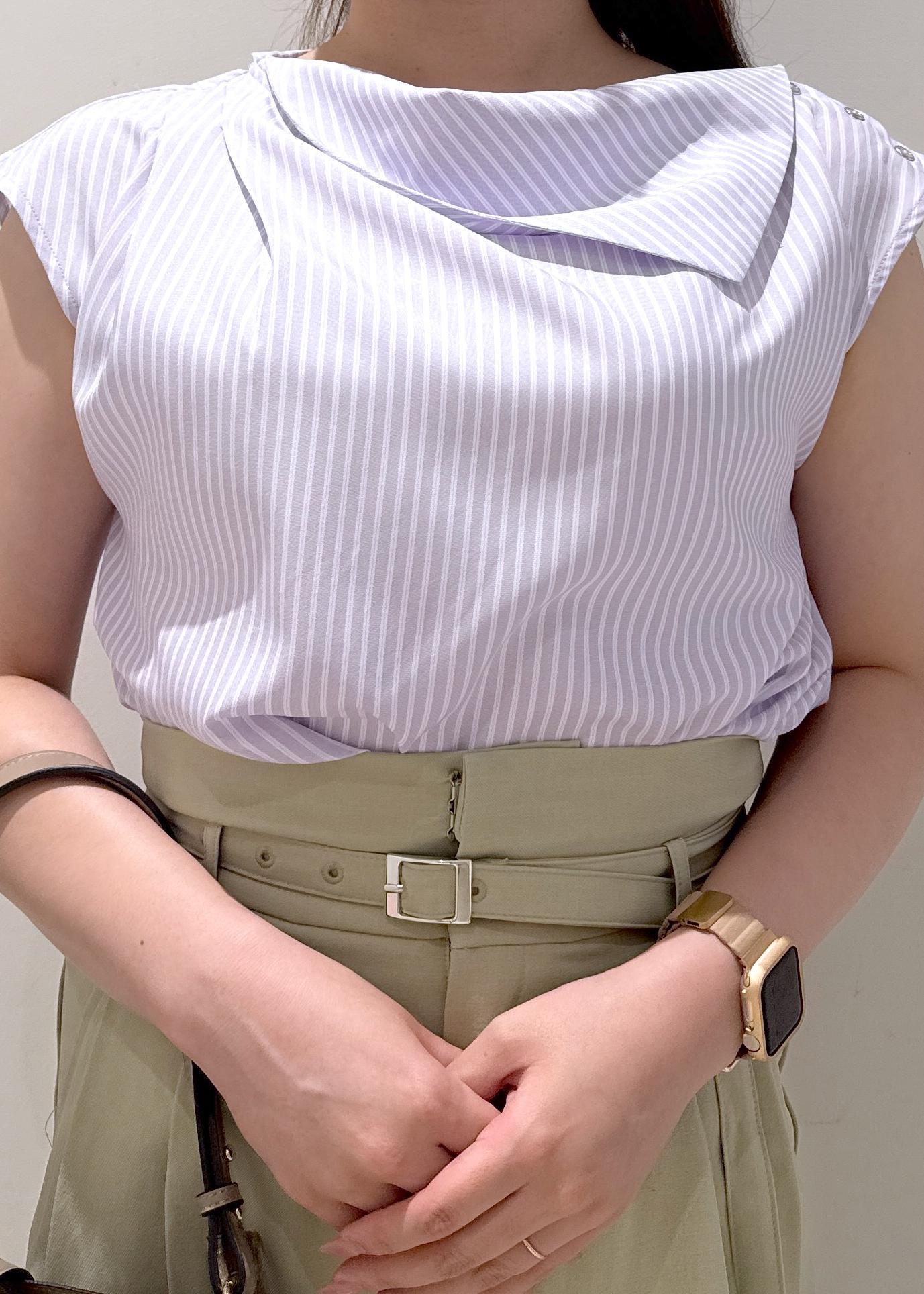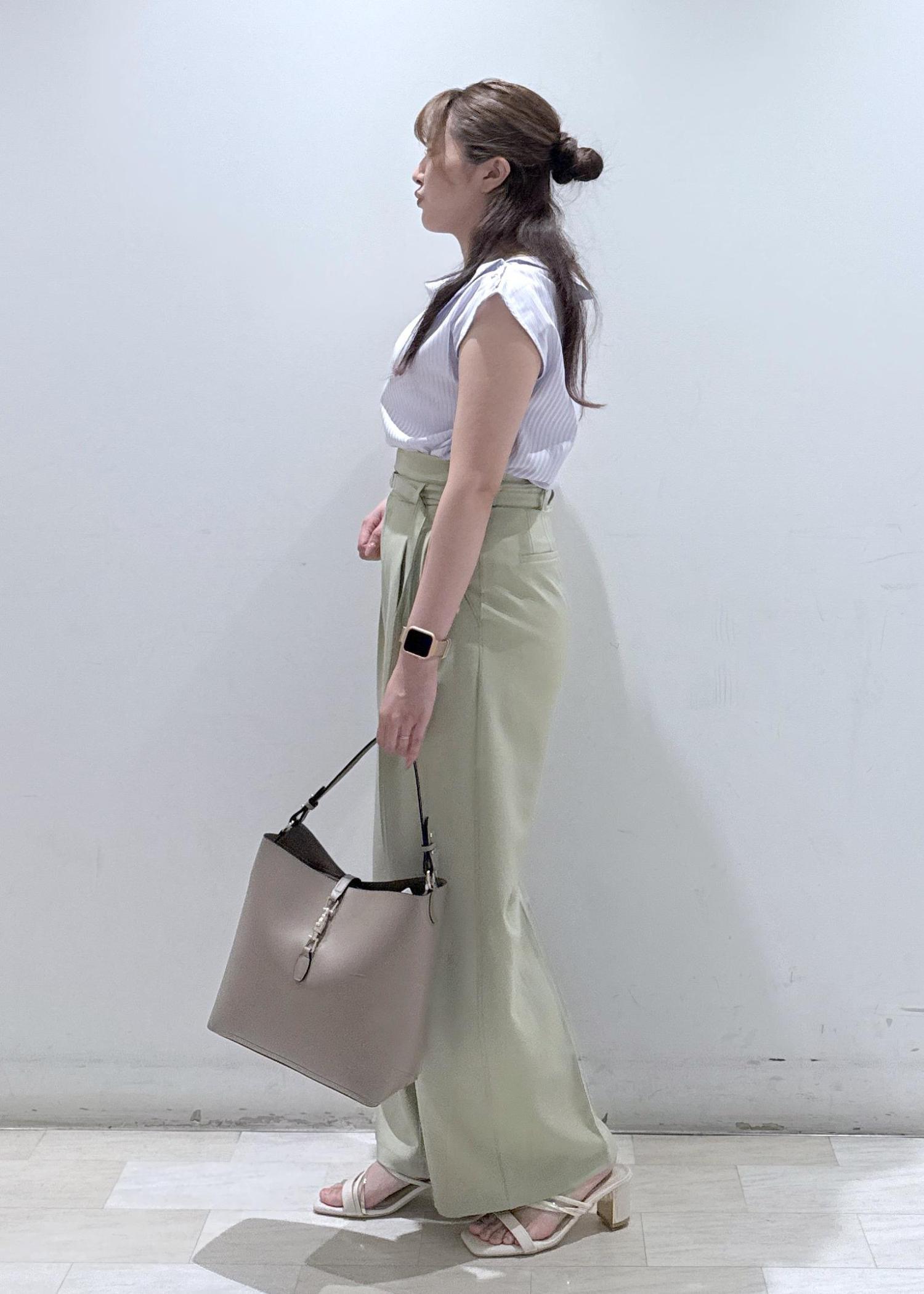 綺麗なデコルテラインが見えてIラインのワイドパンツと合わせて縦を意識し、上半身が大きい私でもスッキリとして見えるようにしています。ボトムスは接触冷感付きなので、これからの暑い夏にも快適に過ごすことができるのでオススメですよ