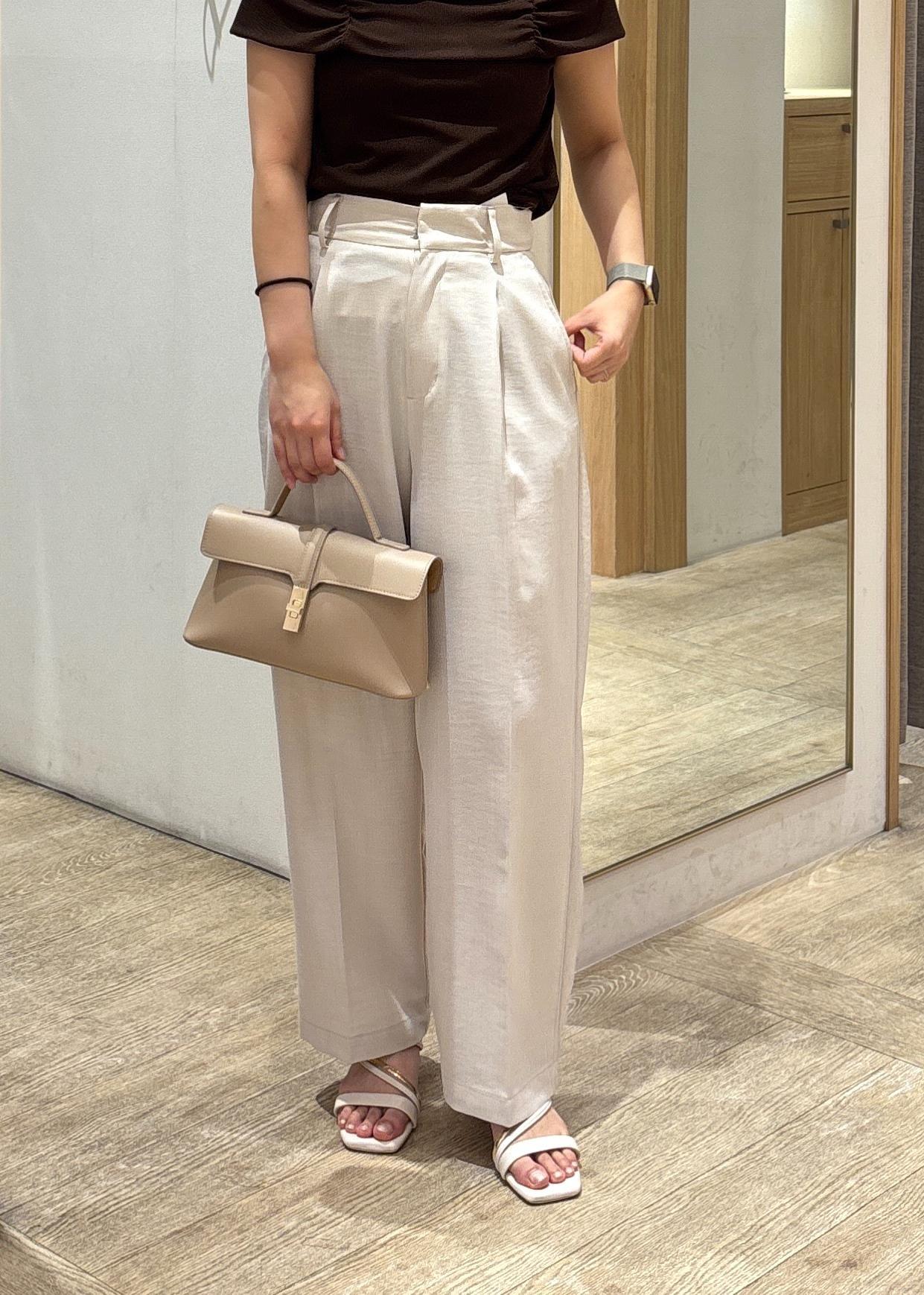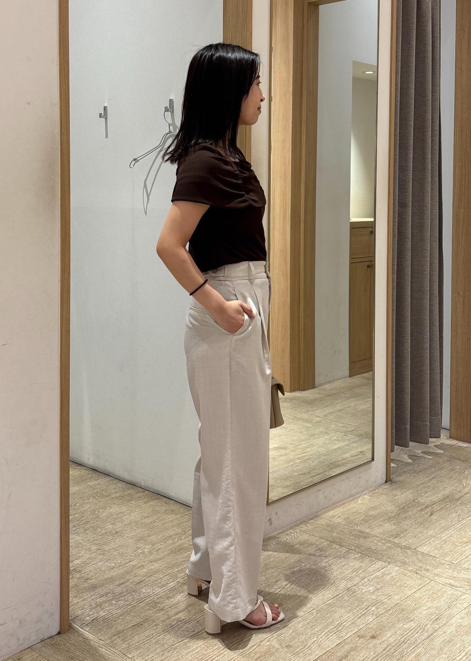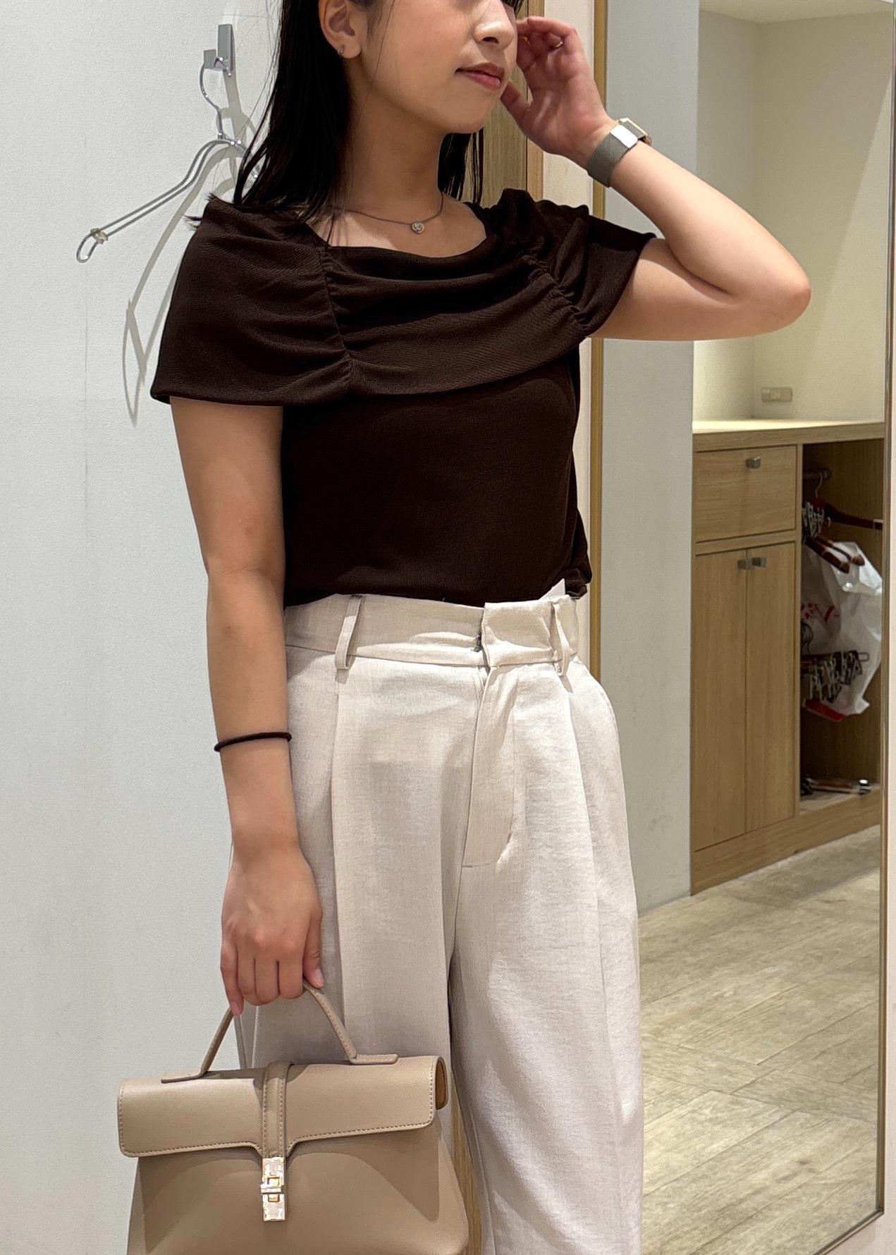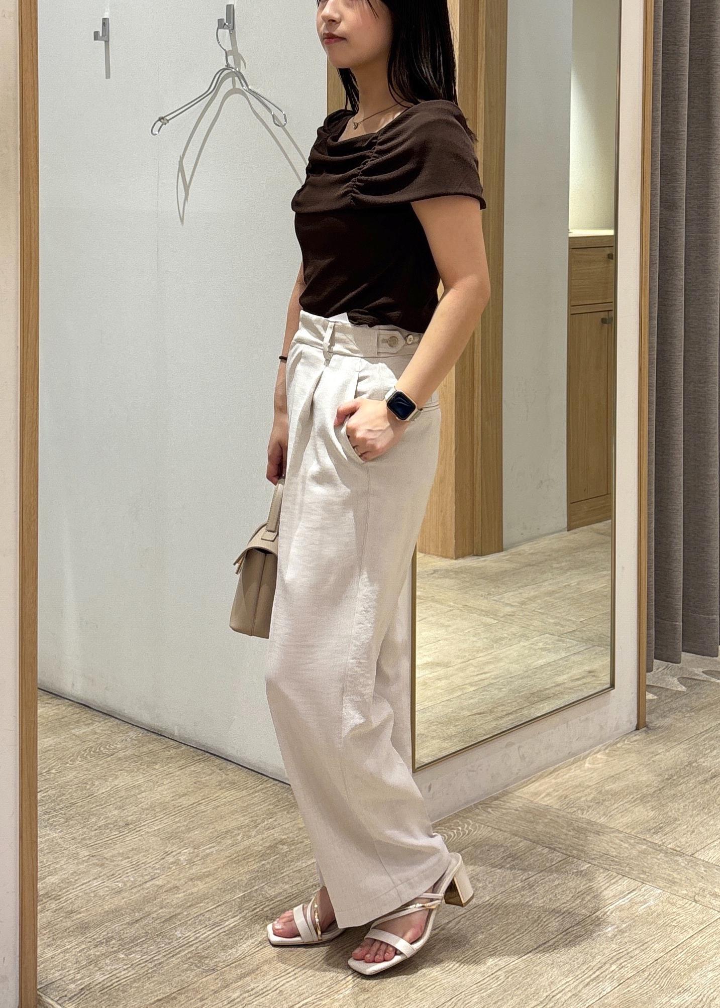 オフショル風の甘めなトップスをスッキリスラックスで大人っぽく着るコーデです。