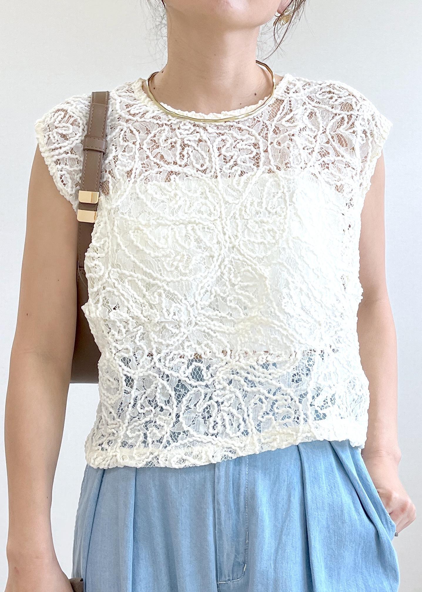 アウトレットVISコードレースシアーノースリーブプルオーバーオフホワイト / F¥4,391レビューコードレースがとっても綺麗なカットソー。152cmでFサイズ着用し、着丈はウエストくらいの短め丈。コンパクトサイズなので、ボトム選ばず使える小柄さんには心強いアイテムです。高見えする素材感なところも大人にはうれしいポイントです◎