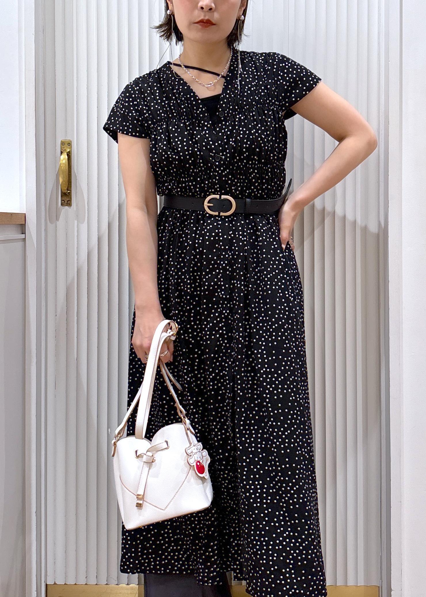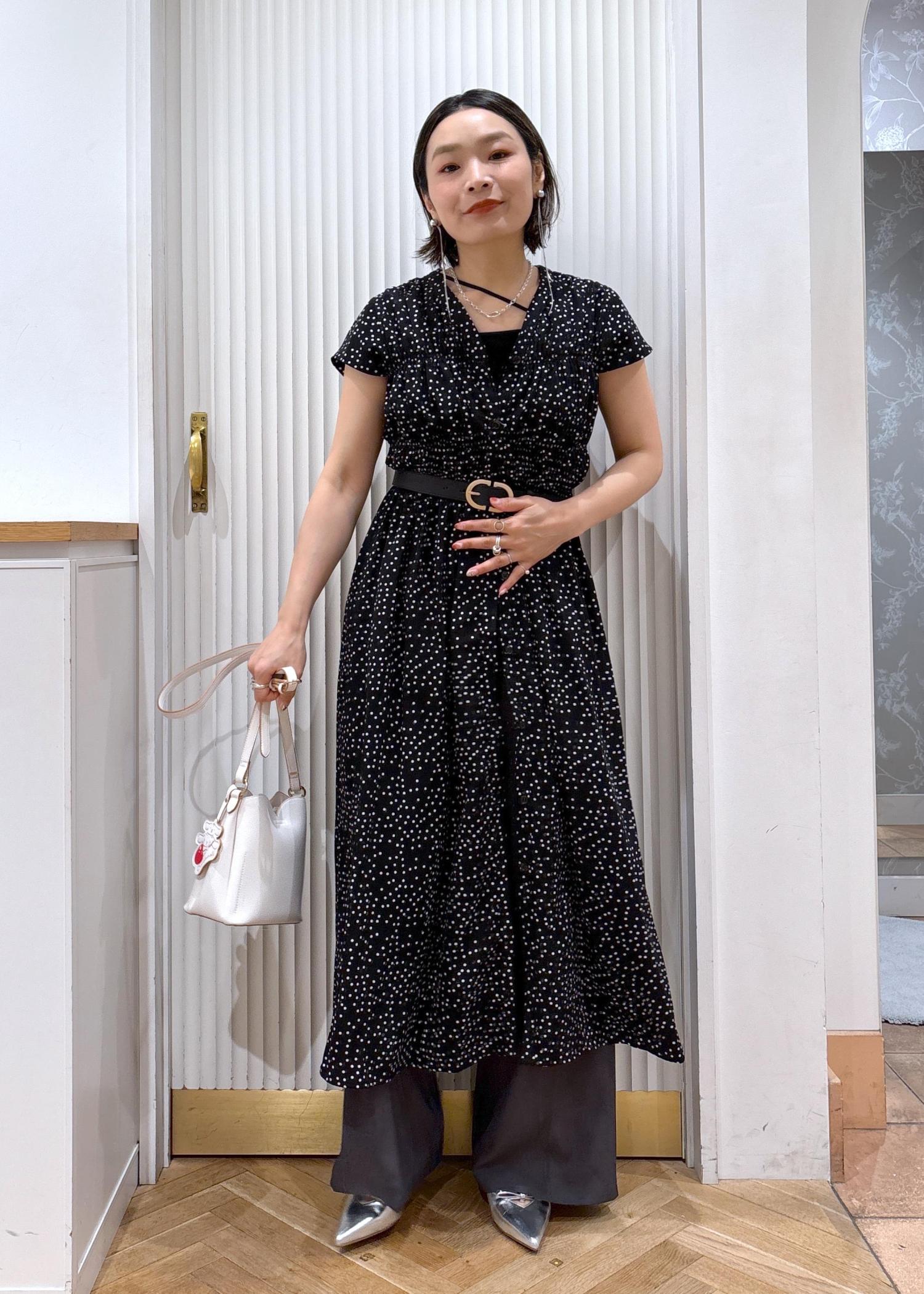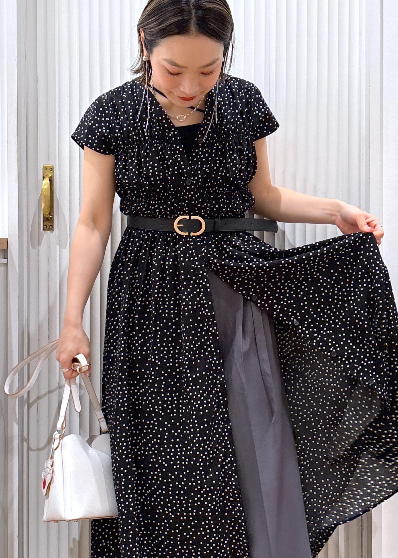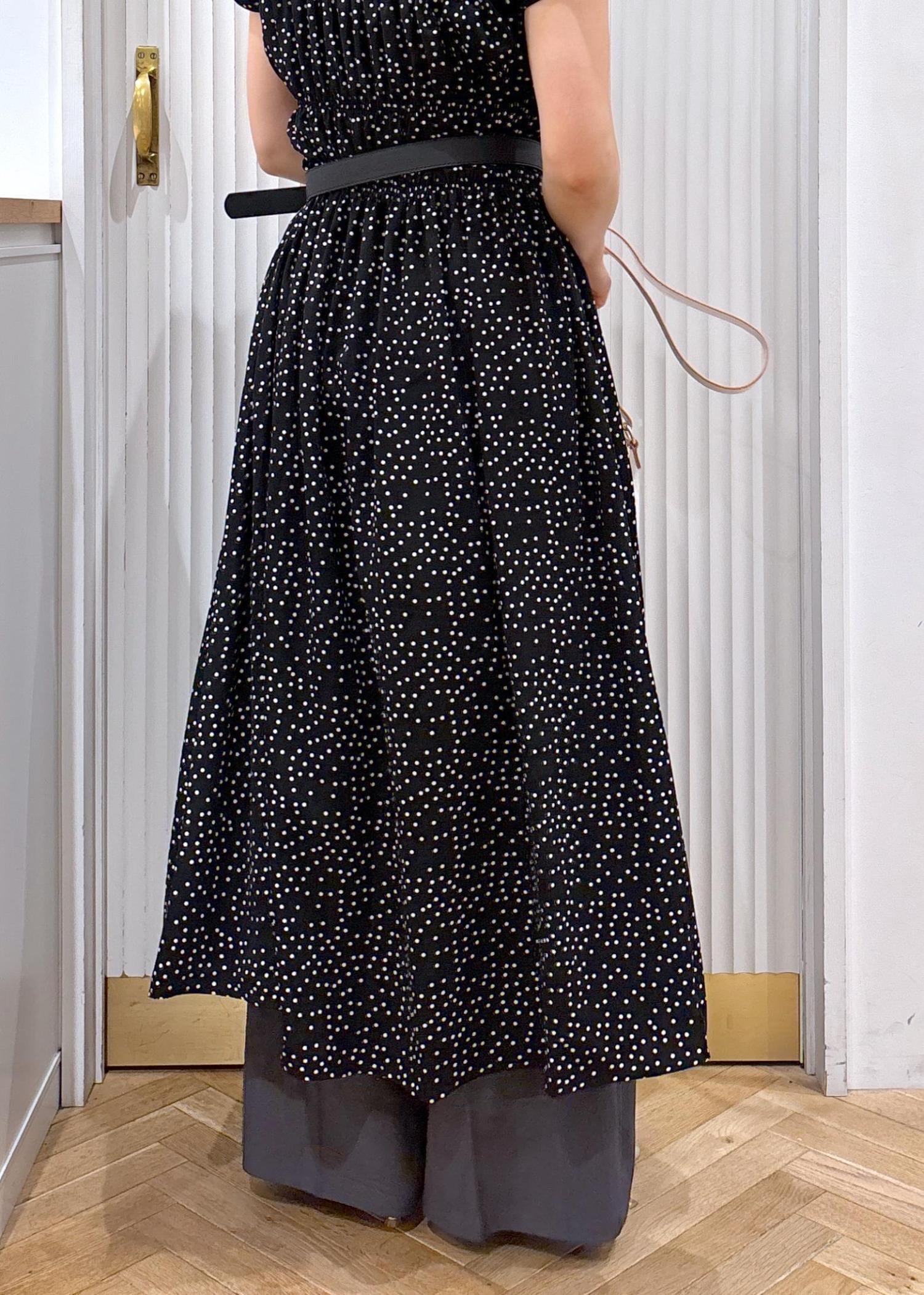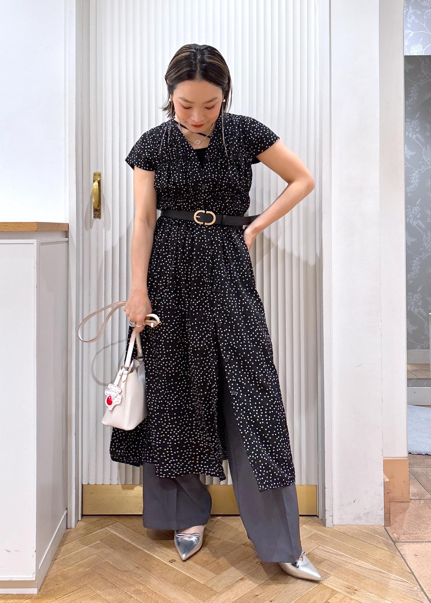 ウエスト部分からボタンを開けてワイドパンツをレイヤード。ワンピースをジレのように着る事でマンネリなコーディネートから脱出♫