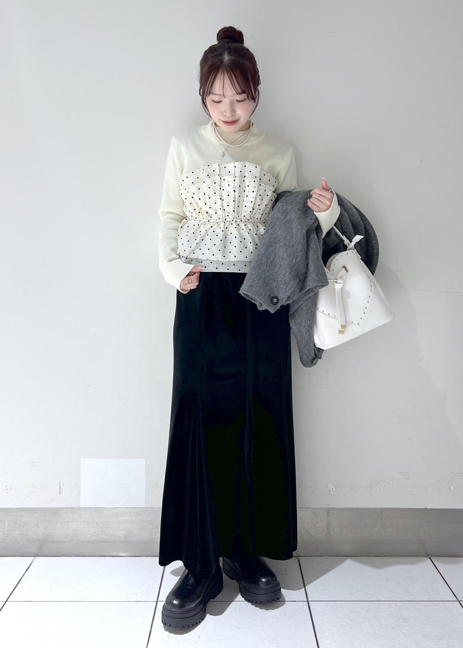 ウエストは大きいのでサイドのボタンで調節しています。丈感はヒールで履くと地面付かず、フラットシューズだと地面に少し付くのでしっかり長め丈が高身長さんにもオススメです♪