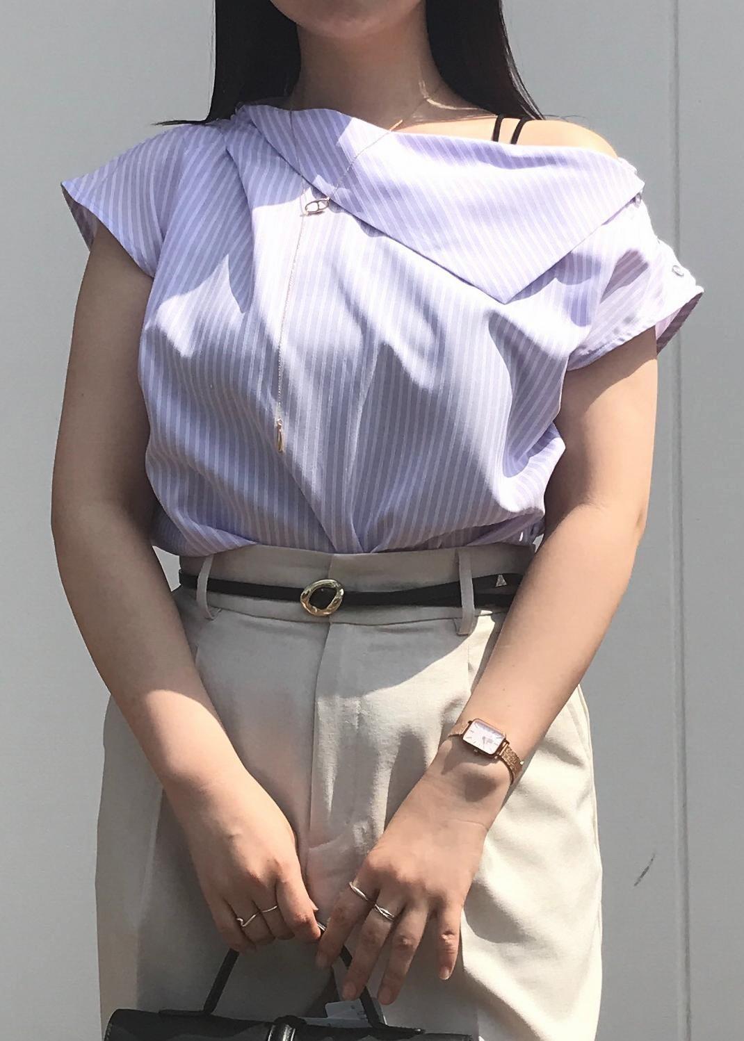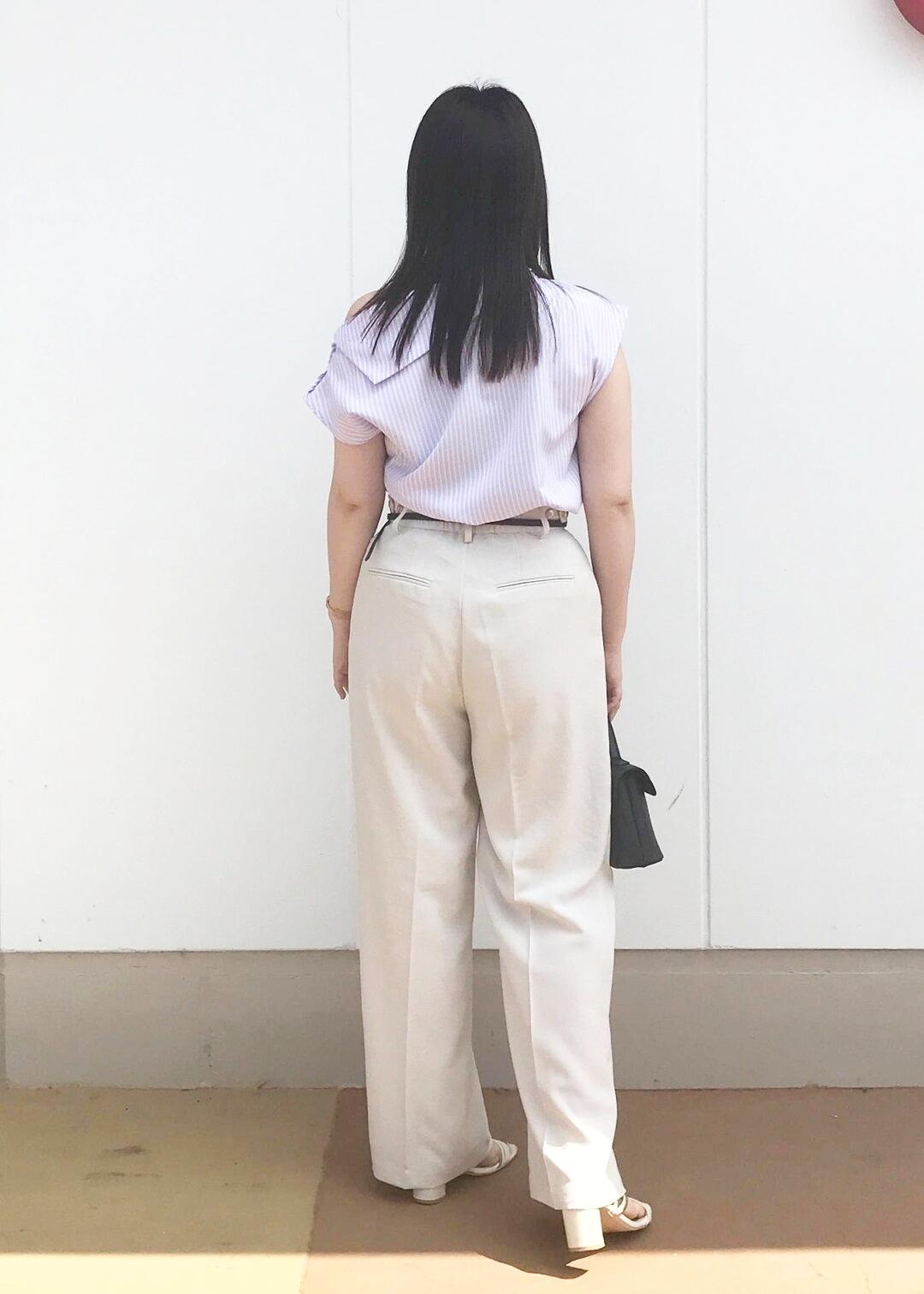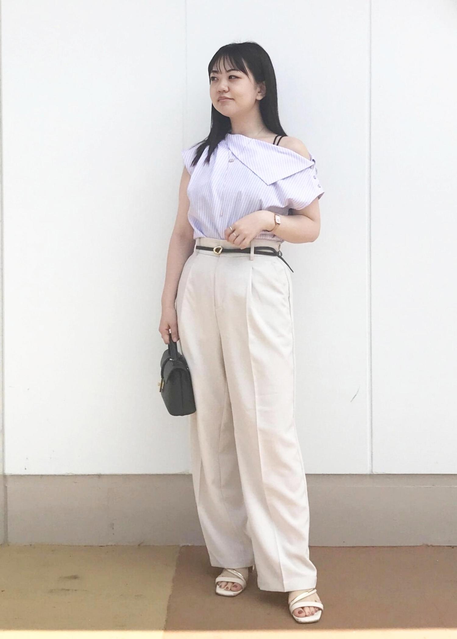 シャツ生地の綺麗めオフショルダー×パンツで可愛すぎないスタイルに。