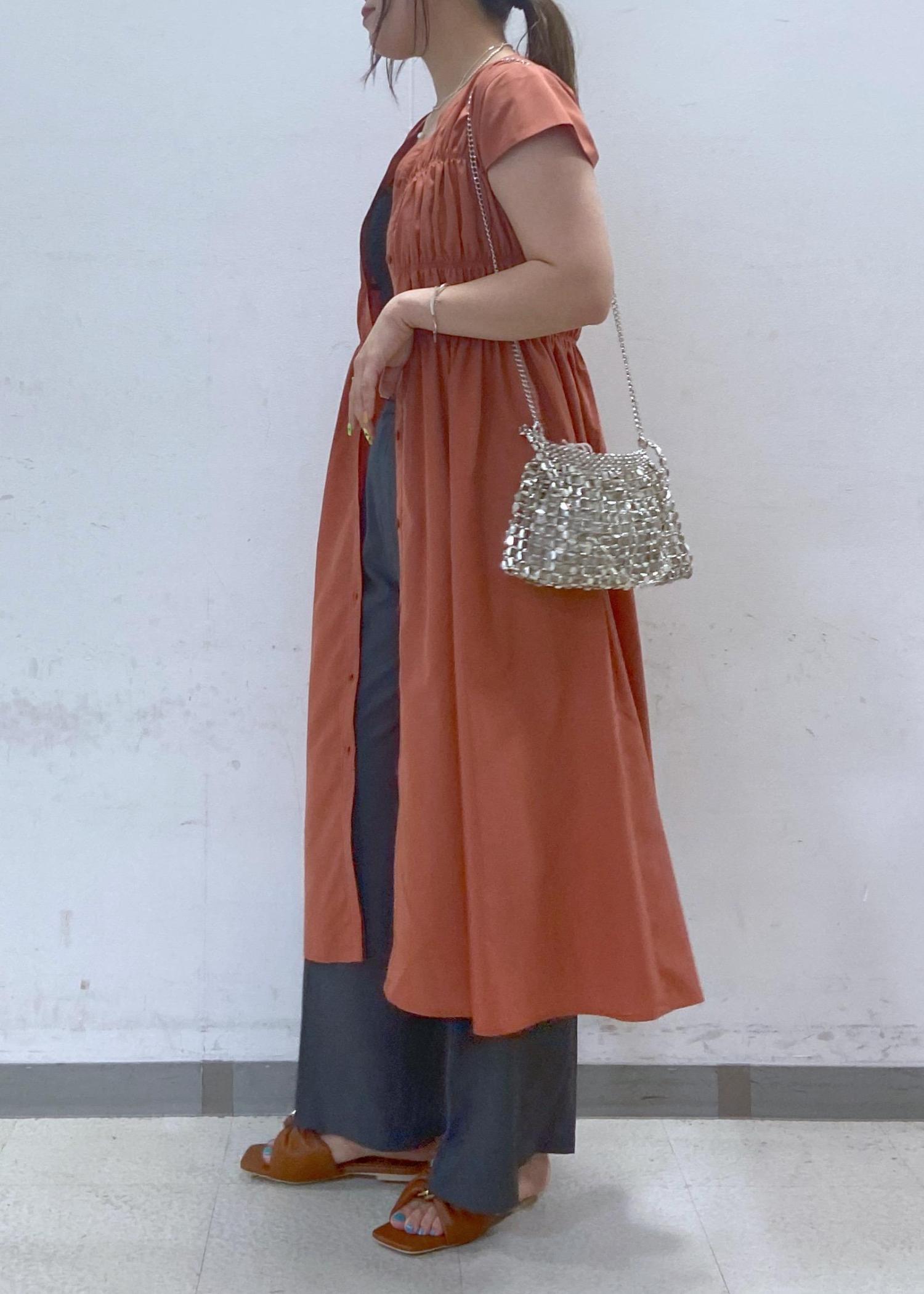 袖丈は前開きにすると、二の腕の膨らみが隠れる丈感です。